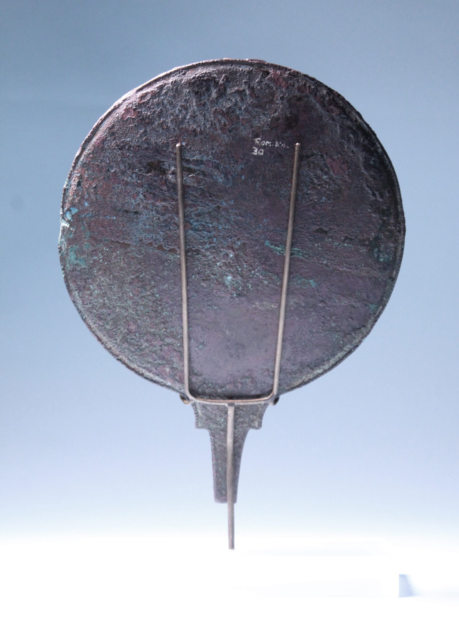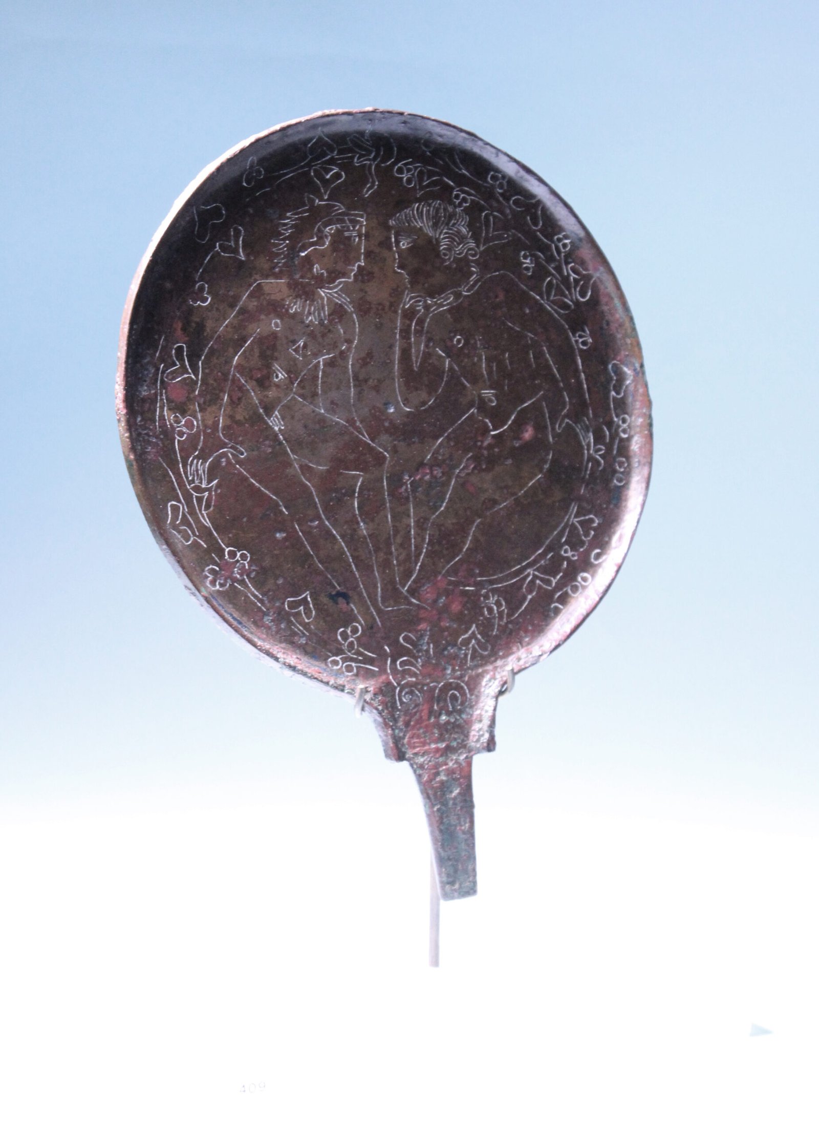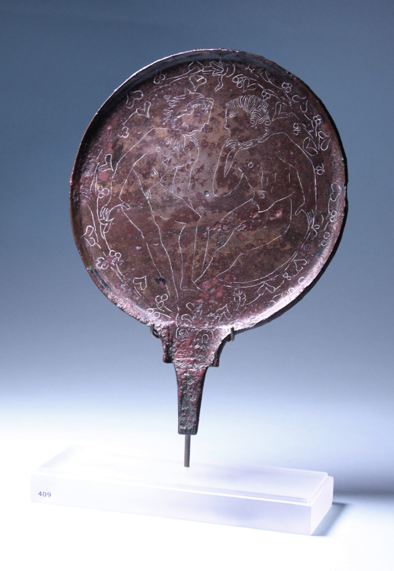 Etruscan mirrors (malena), were produced in a number of workshops from the 6th to the 1st century BC. The earlier examples tend to be larger, and more elaborate, with wood or bone handles. The later examples are generally more compact, with integral handles and less ambitious incised scenes.