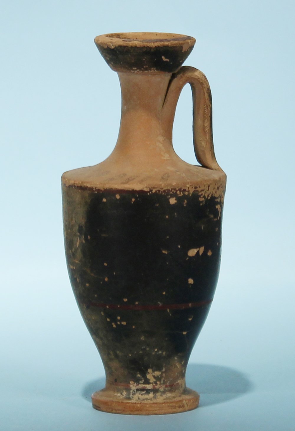 An ancient Attic Greek small black-figure olpe with a prancing goat with vines behind and checker board pattern on the rim.
