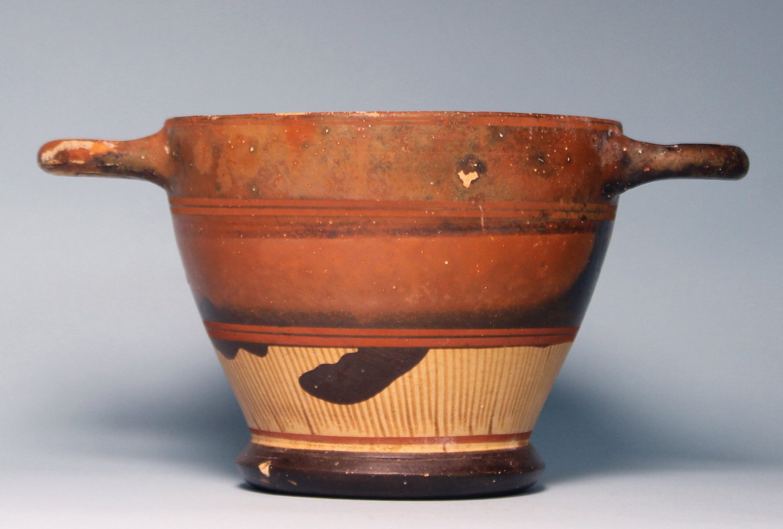 An ancient Corinthian pottery alabastron decorated with spots in black slip on the body and concentric circles on the lip.