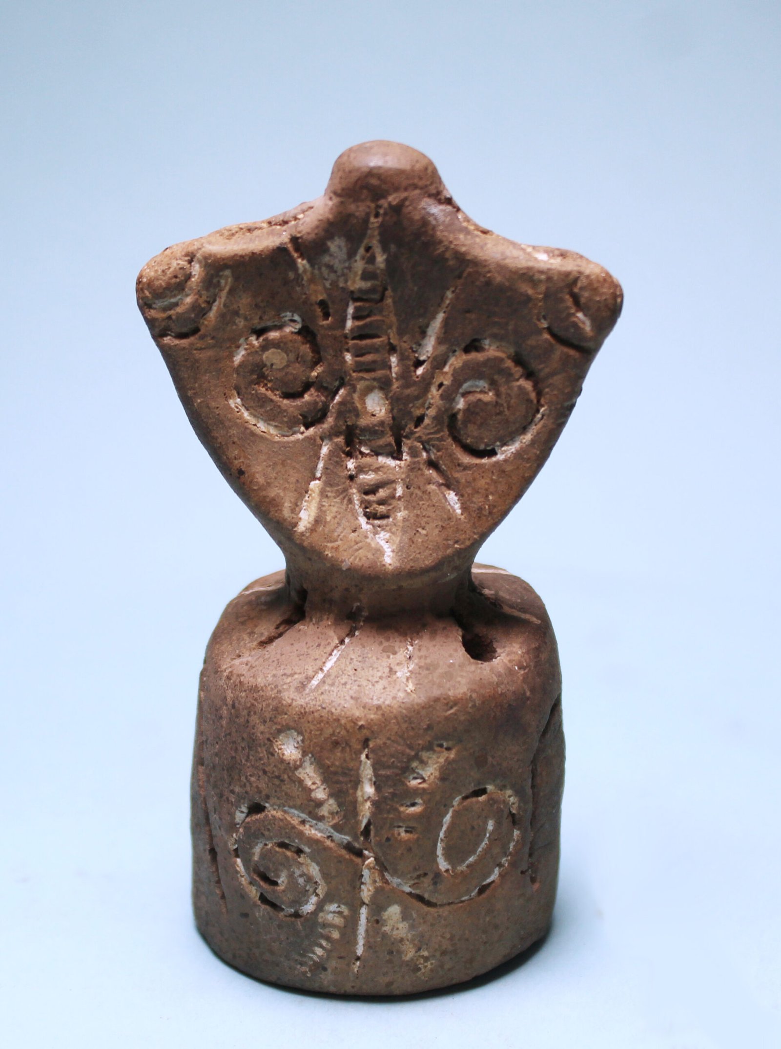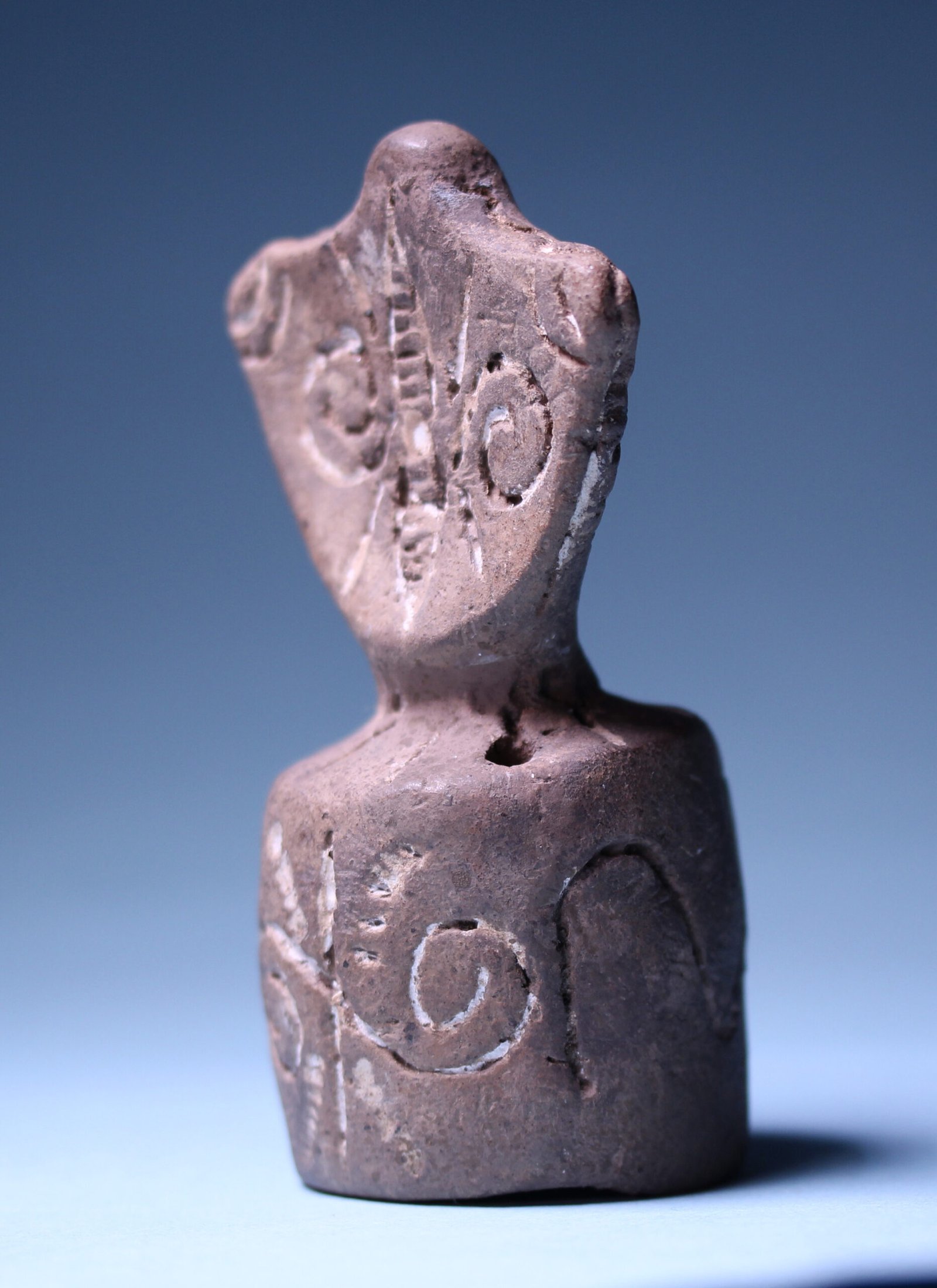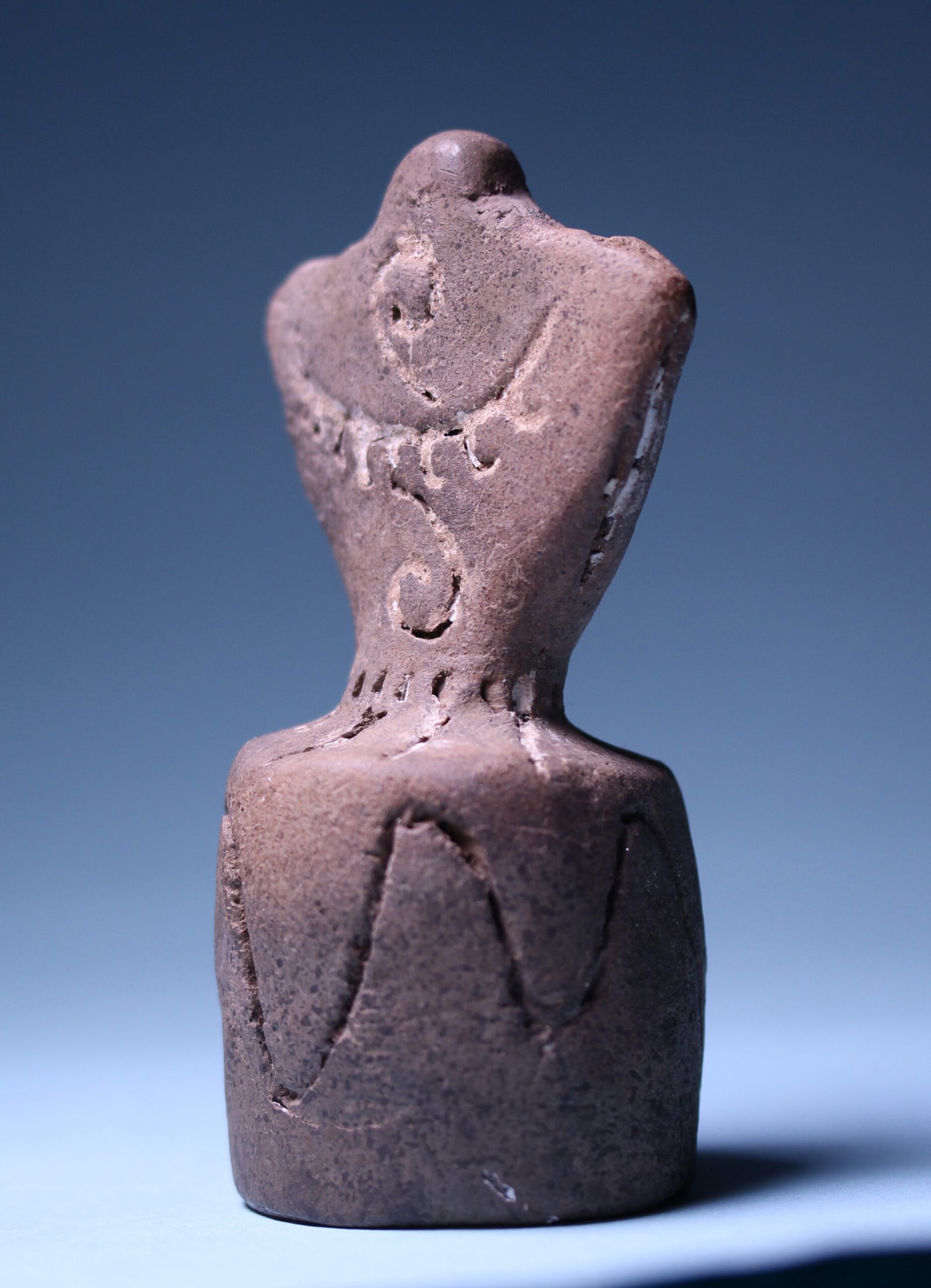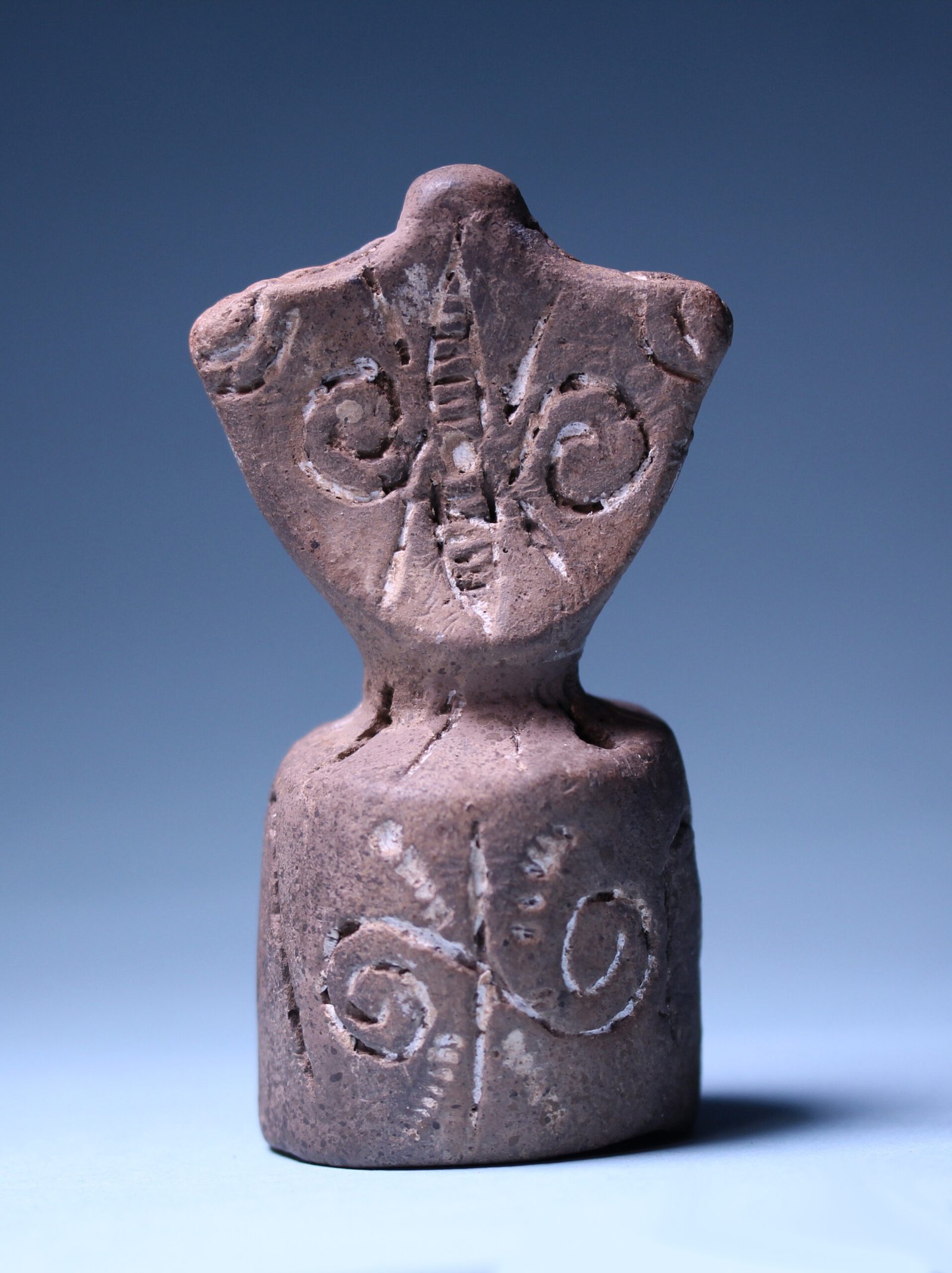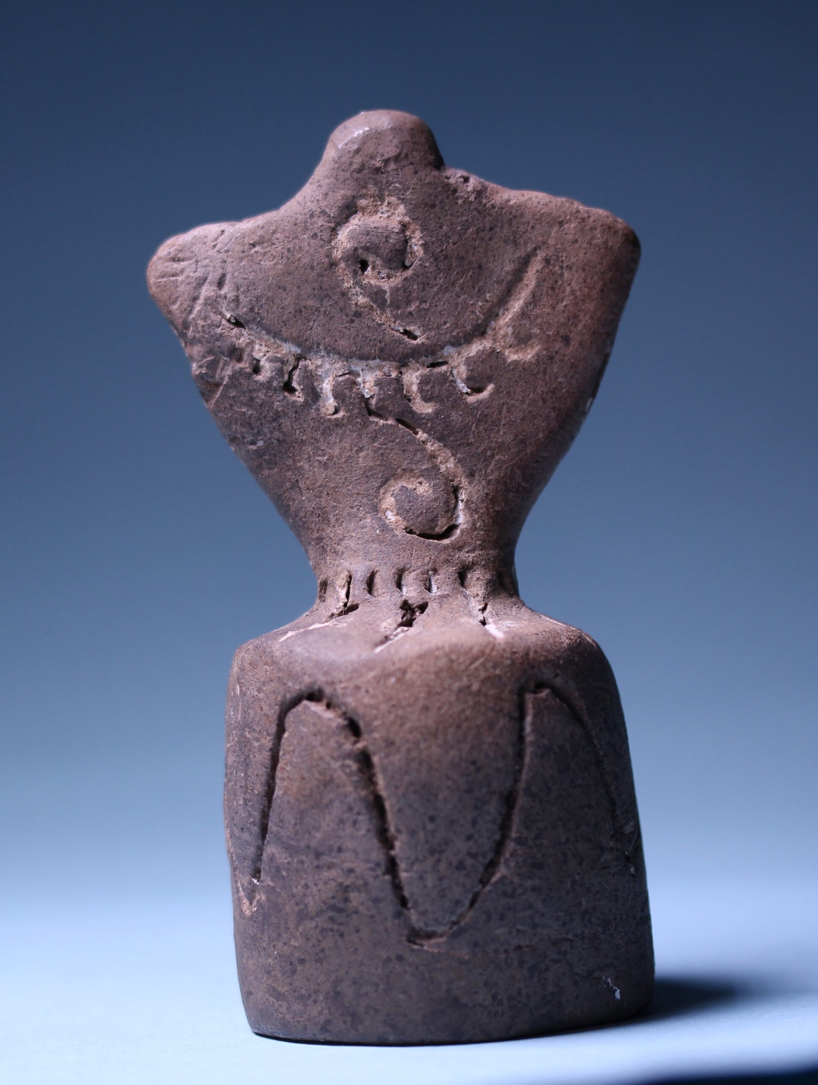 The Bronze Age cultures of the lower Danube basin produced a distinctive abstract terracotta figural form that was often placed in graves. The bell-shaped abstract figures represent women with abbreviated heads and limbs in cloth dresses adorned with coiled and spiraled designs.