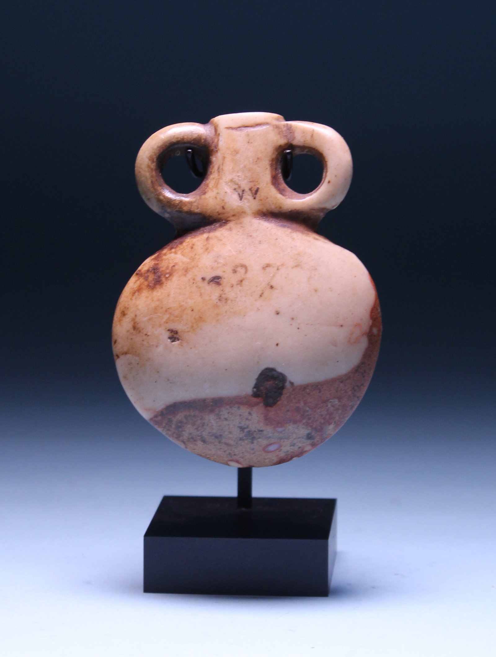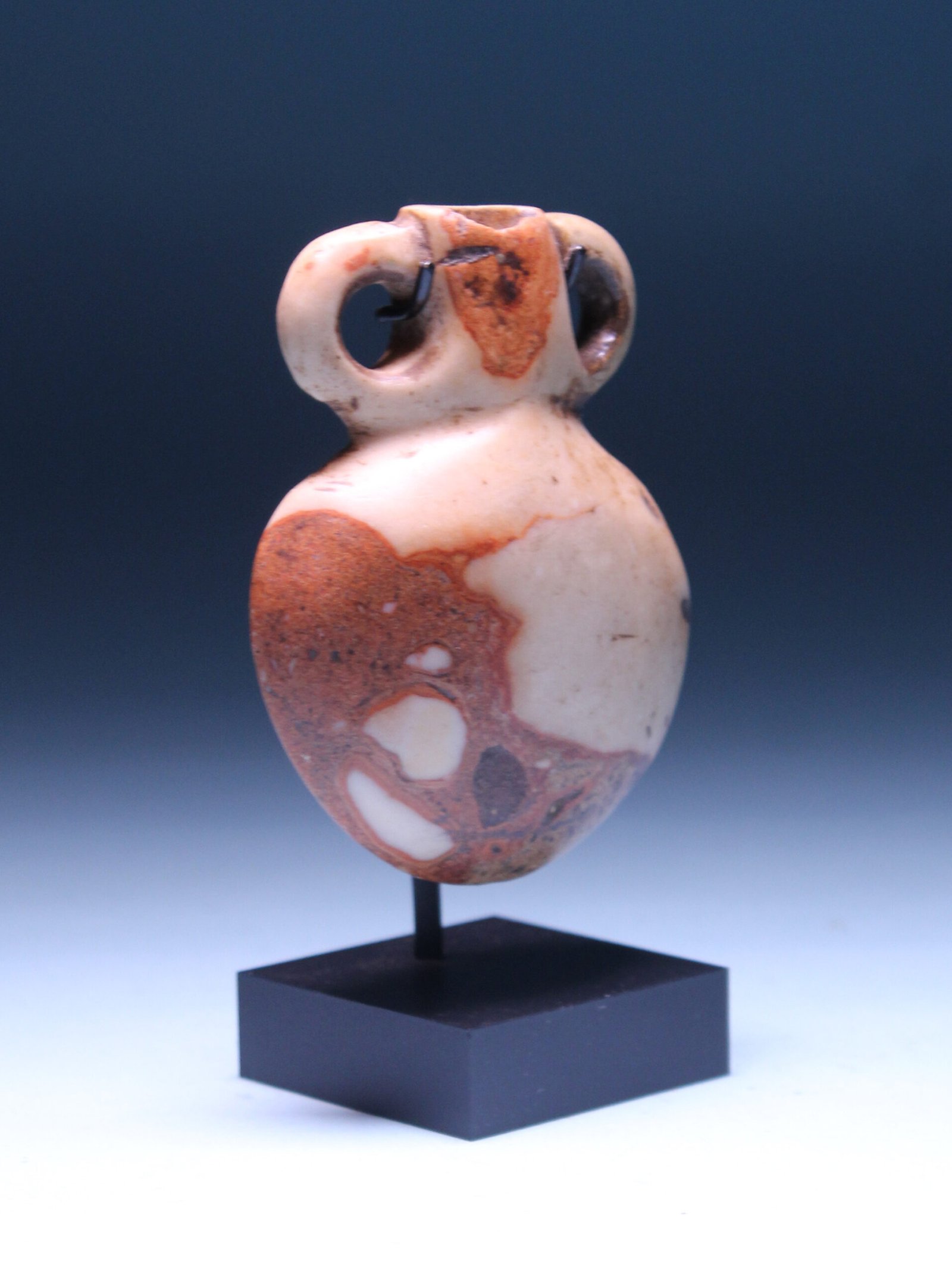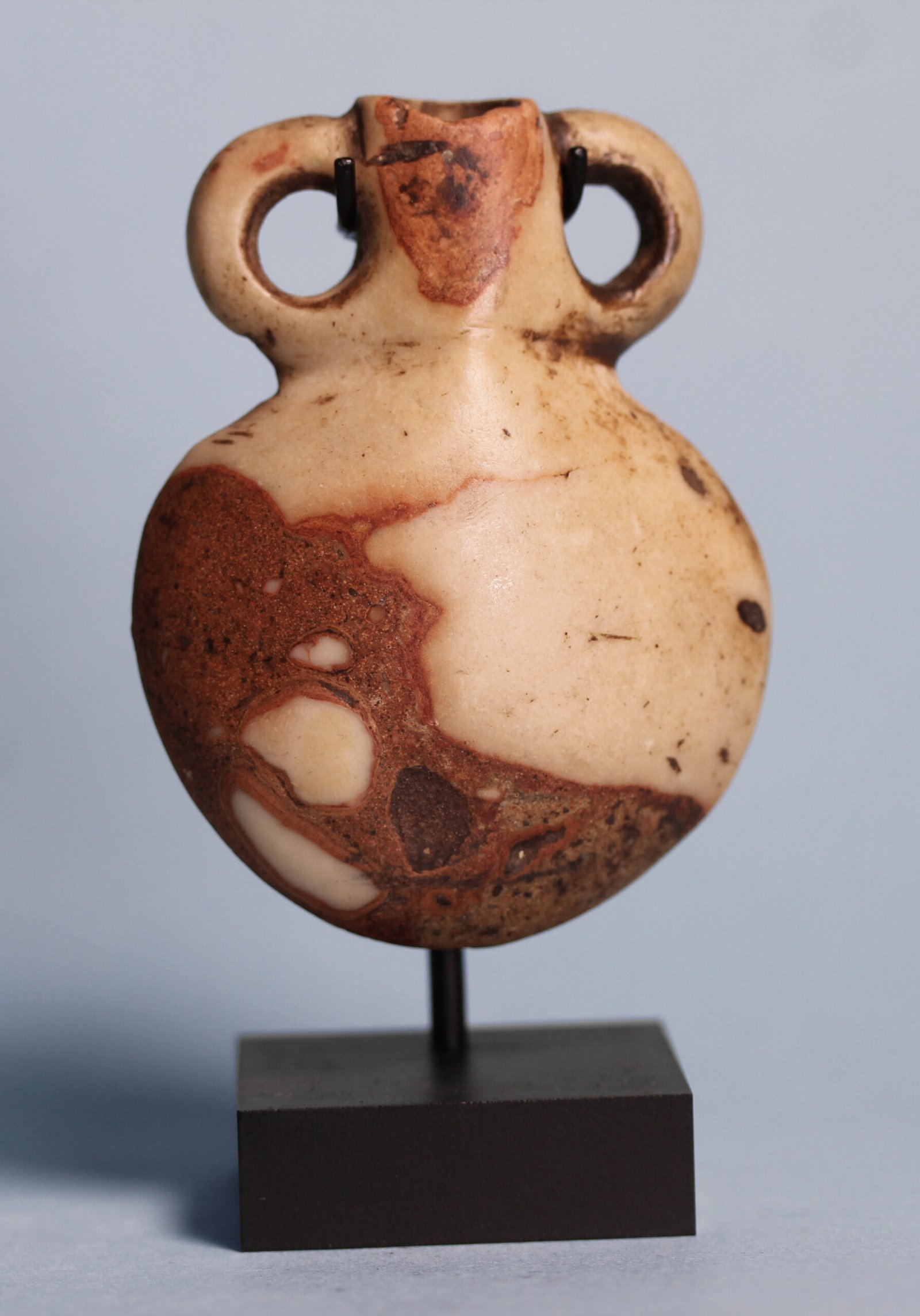 An ancient Egyptian Middle Kingdom breccia flask with tapered circular body and two looped handles.
