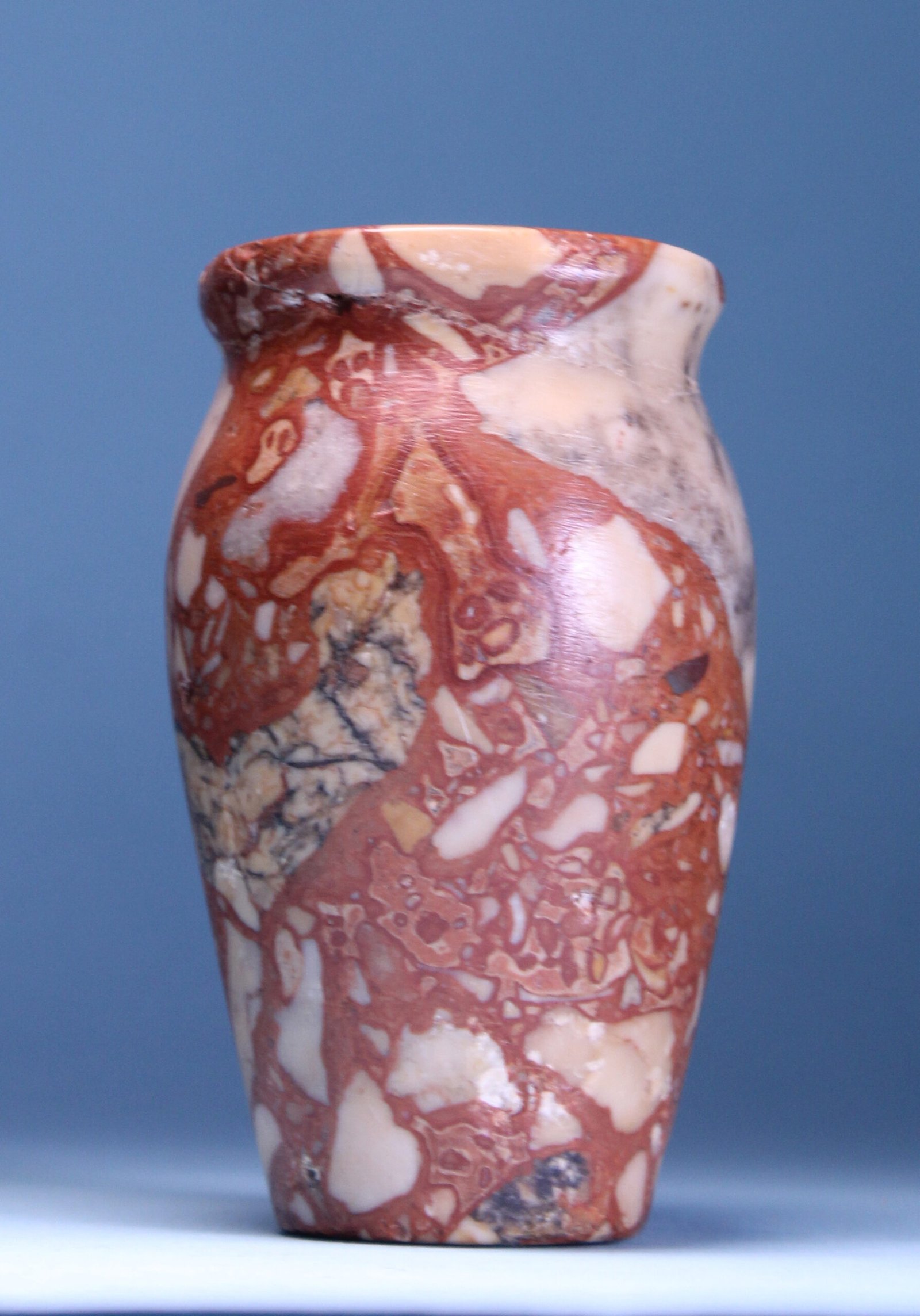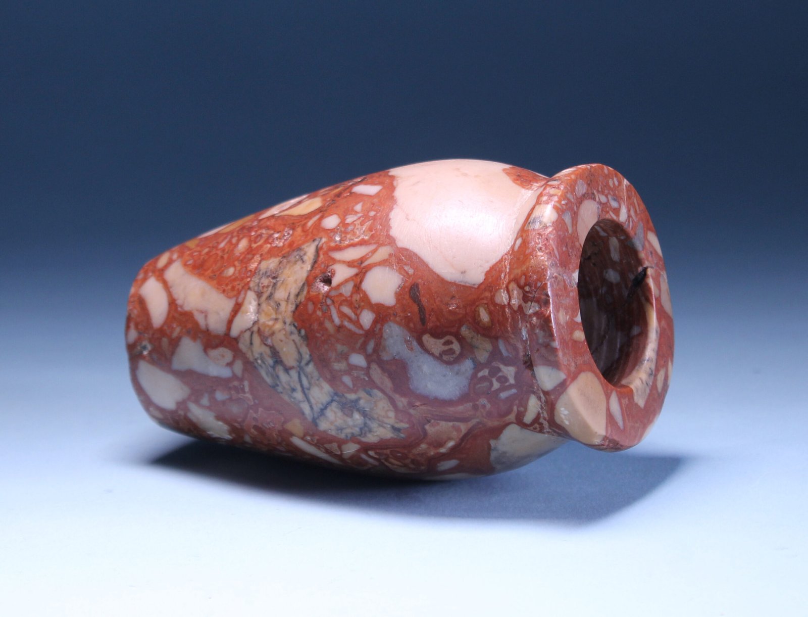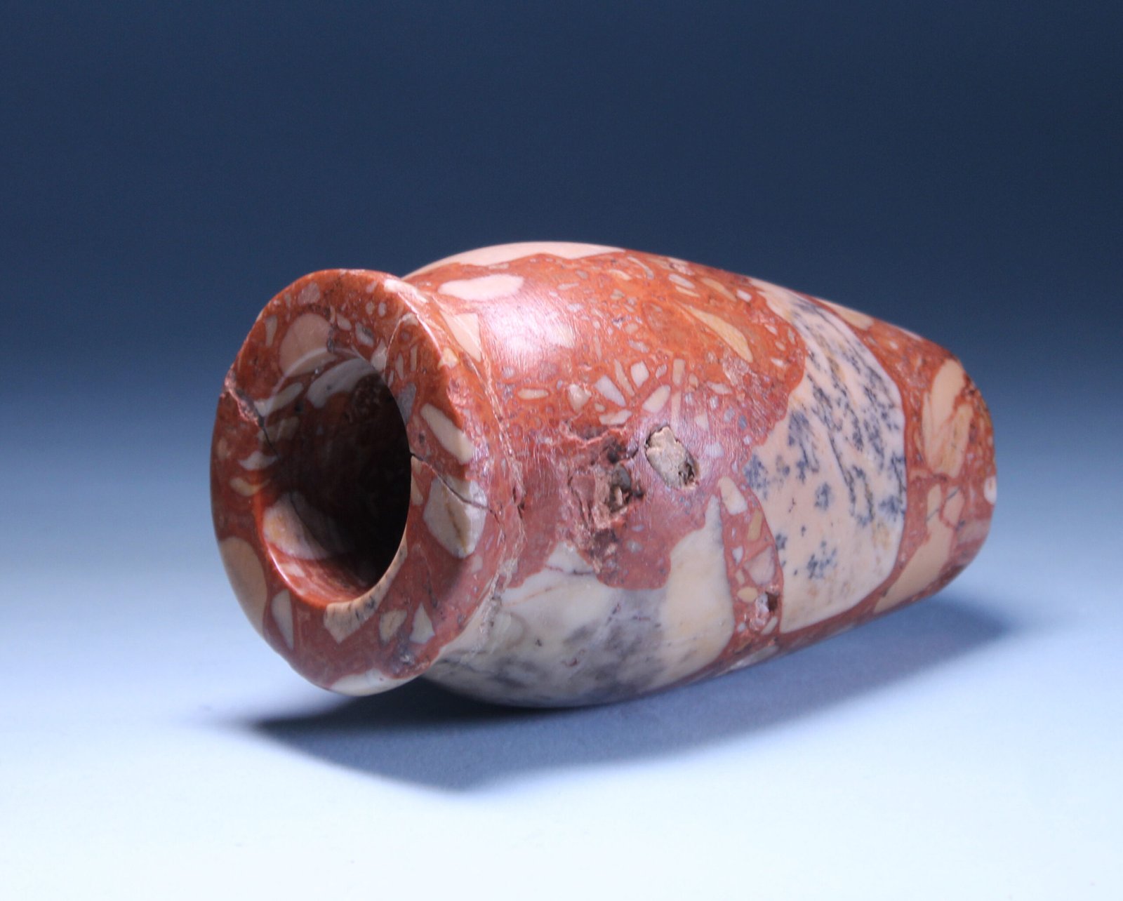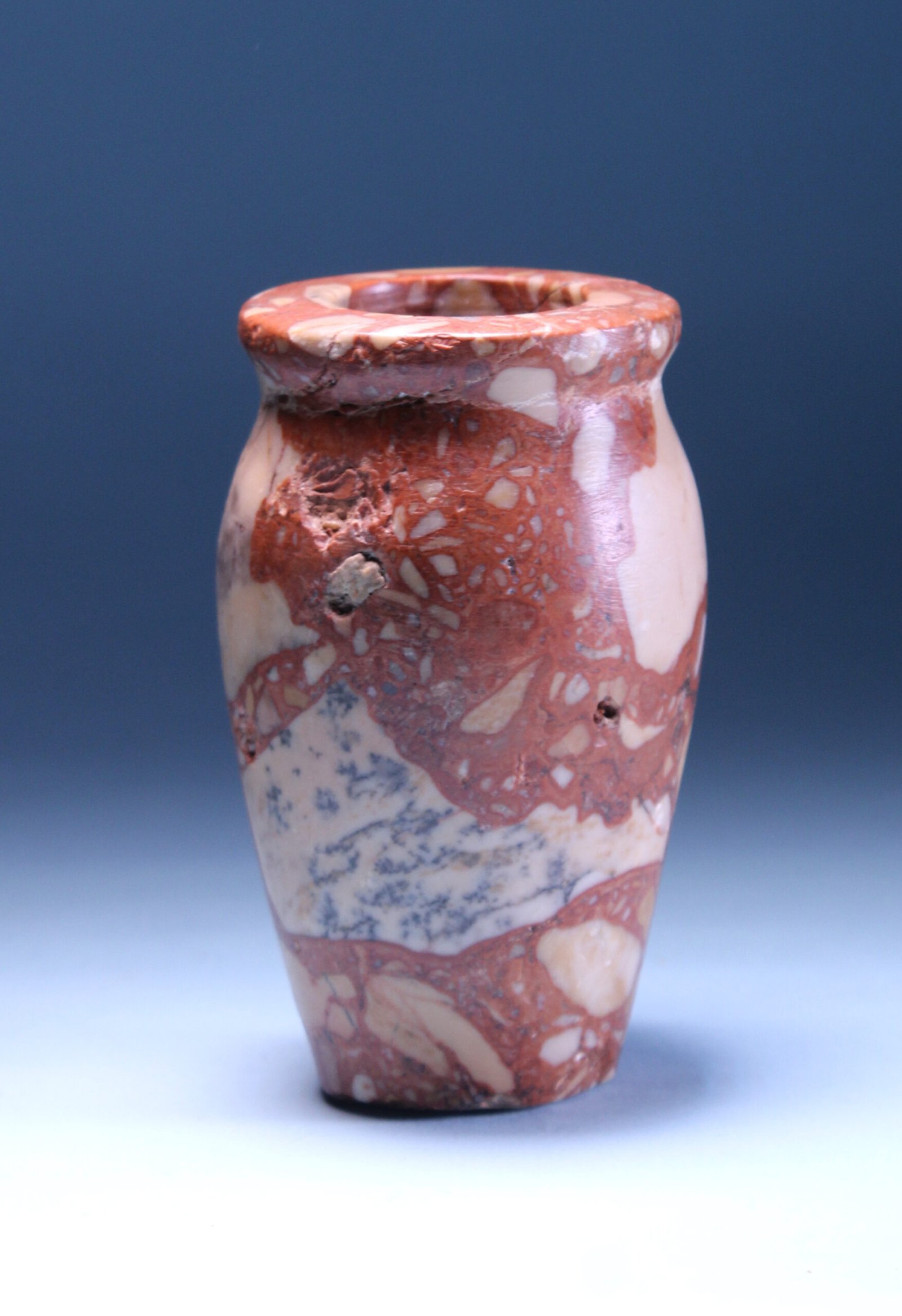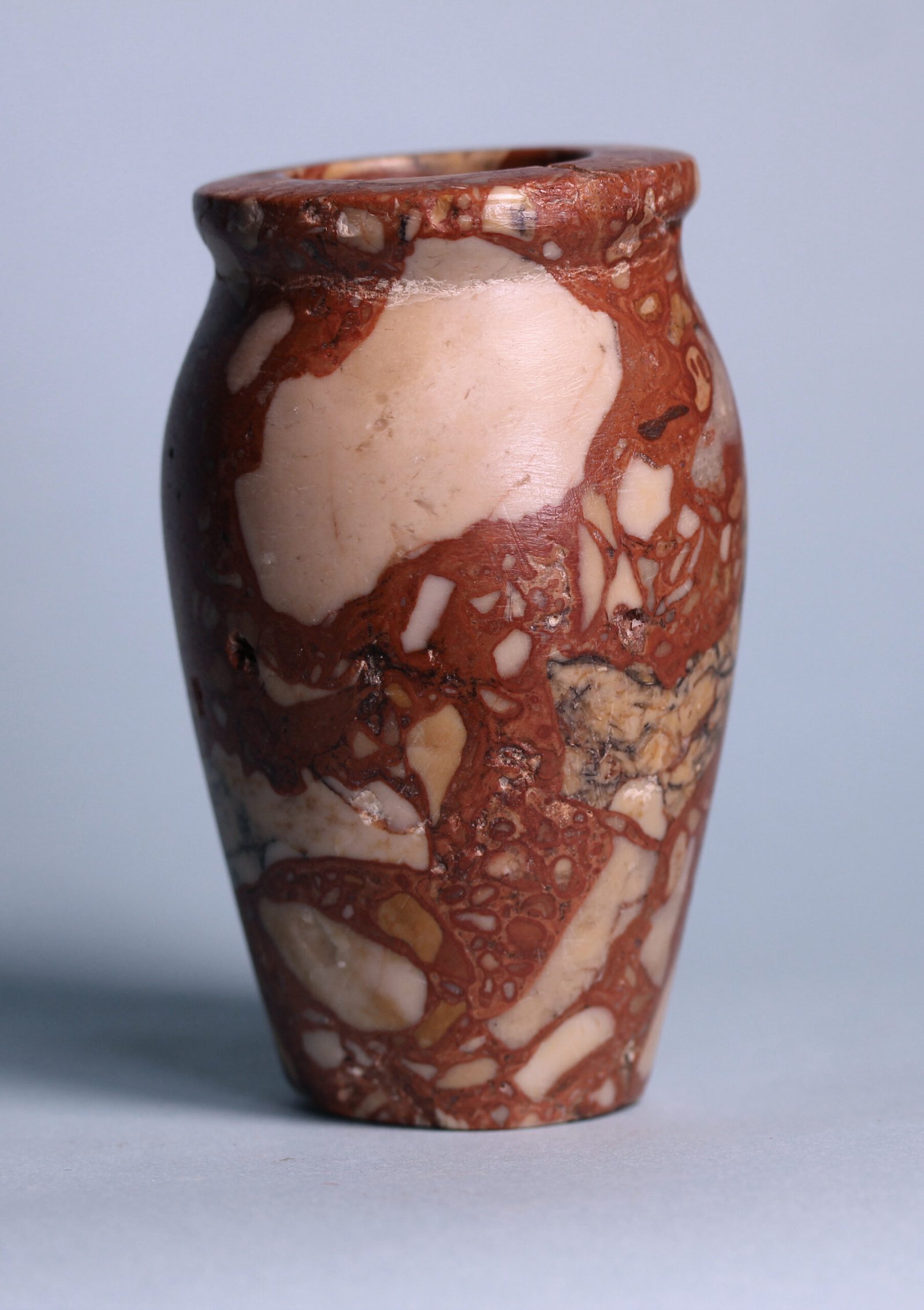 An ancient Egyptian miniature breccia kohl vessel of ovoid form with raised rim and flattened bottom.