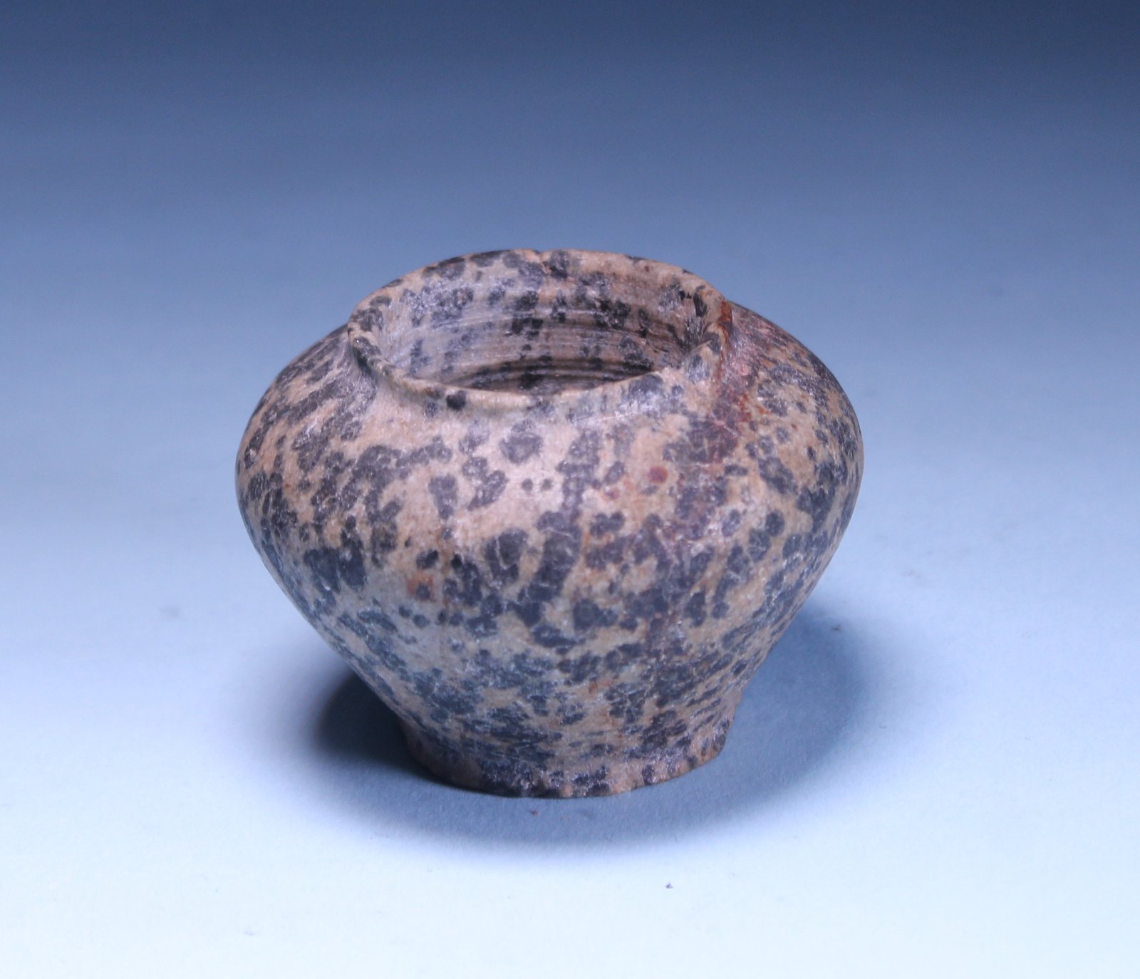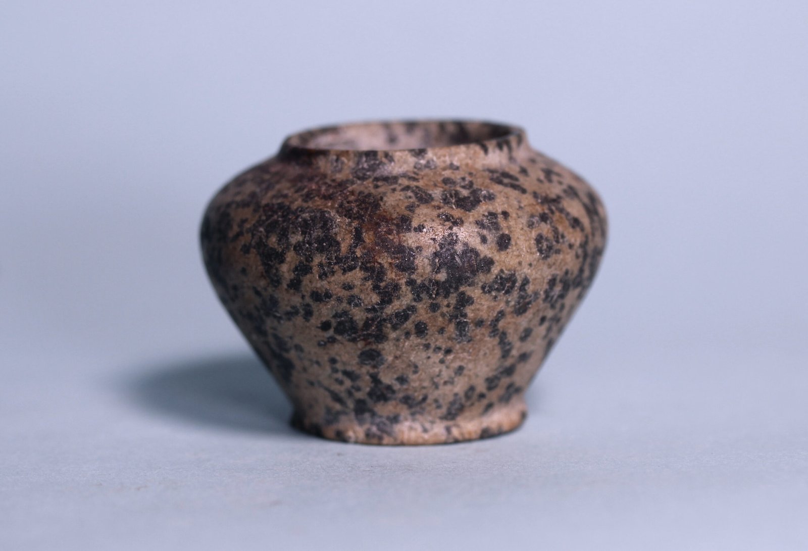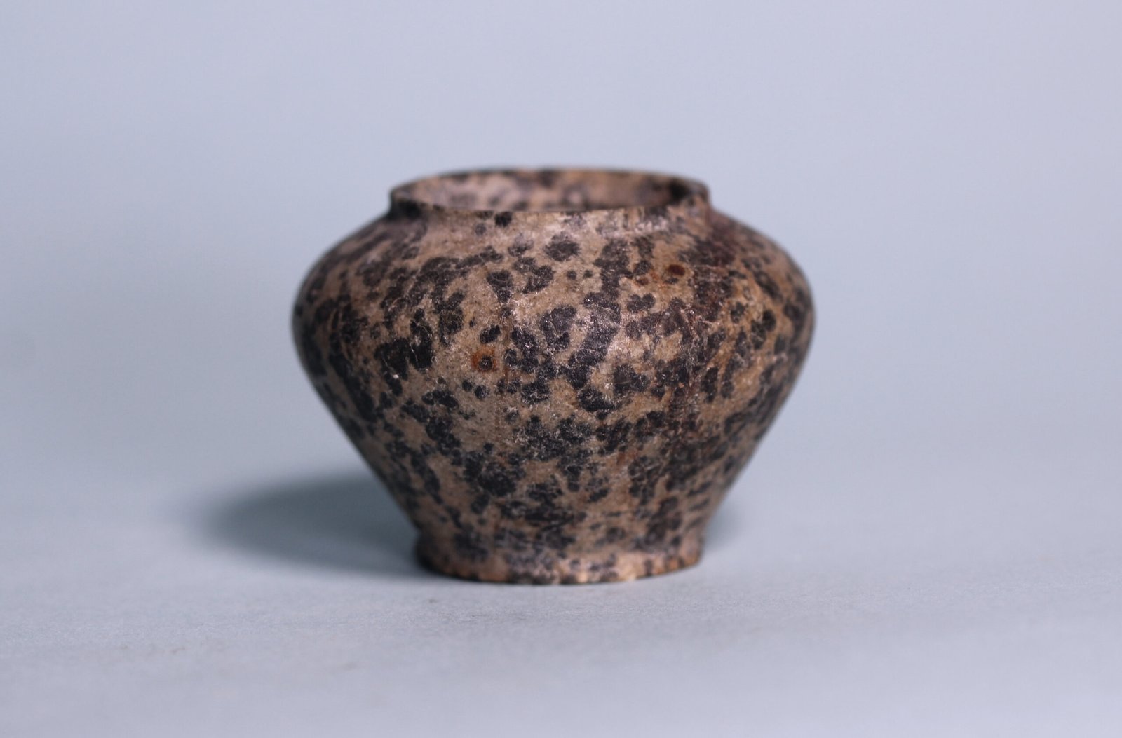 An ancient Egyptian Middle Kingdom diorite kohl vessel of ovoid form with raised rim and flattened bottom.