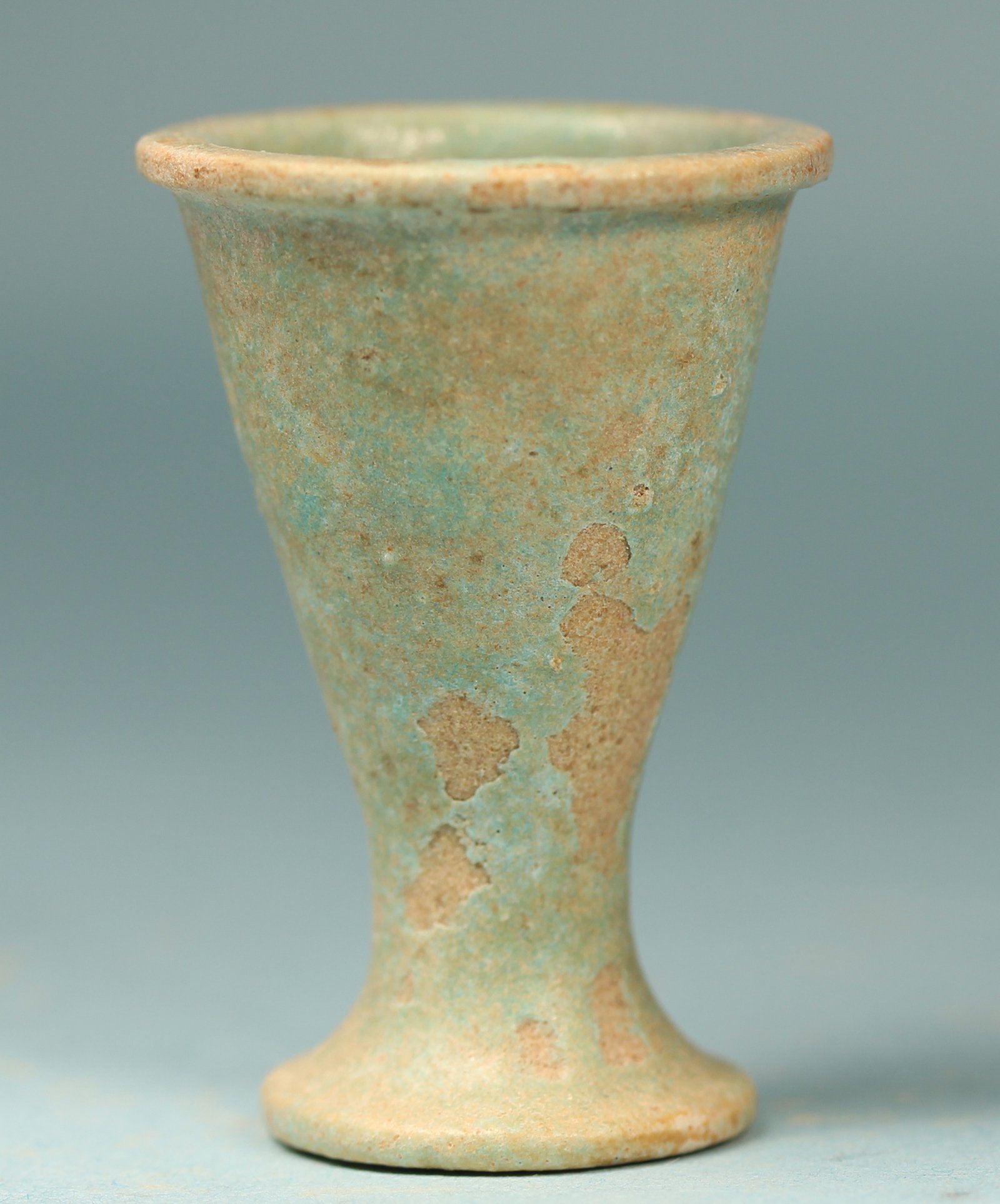 An ancient Egyptian blue-green faience cosmetic or offering cup with an inscribed with Hieroglyphs naming the contents of the vessel.