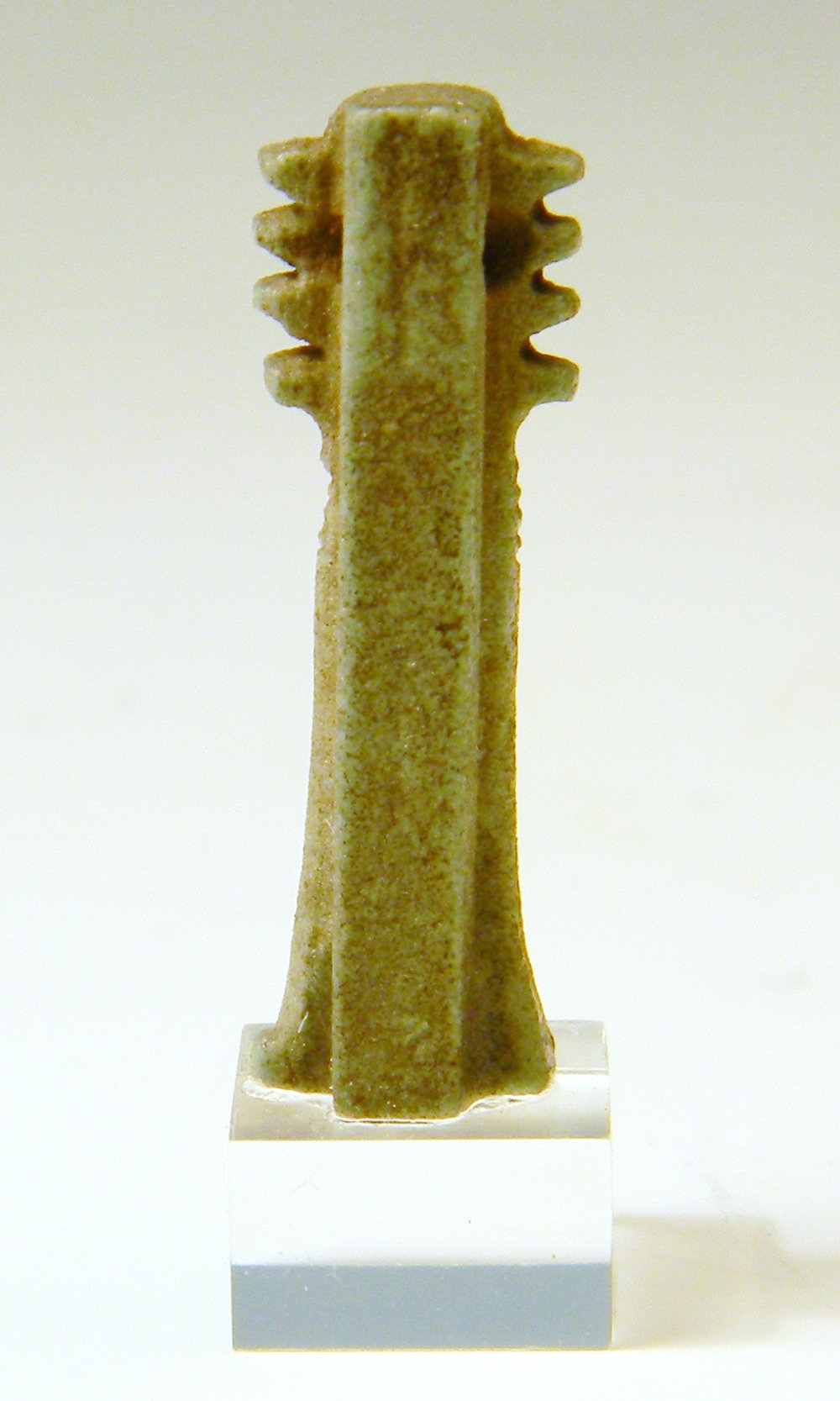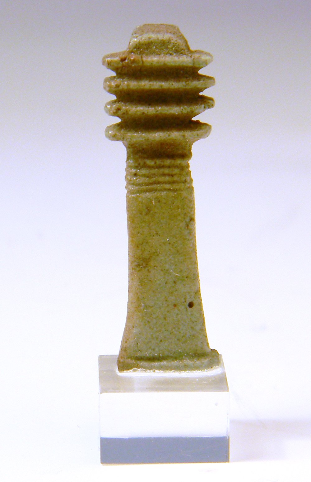 The Egyptian amulet, as with nearly all objects that accompanied the dead into the afterlife, was of magical significance. The Djed pillar was believed to be an especially potent amulet, insuring one’s ability to begin anew in the Afterlife. The Djed pillar was initially associated with the funerary god Sokaris, revered at Memphis. Later the symbol and the ceremony of ritually raising the Djed pillar became associated with Ptah, and finally with the underworld god, Osiris. The Book of the Dead, chapter 155, mentions the words that were to be spoken when the Djed amulet was placed (strung on a fiber of sycamore) upon the deceased’s throat. The text goes on to invoke Osiris’ resurrection, and compare the Djed pillar with the spine of Osiris. The Djed pillar was one of the most common funerary amulets, often dozens were found strung around the mummy.