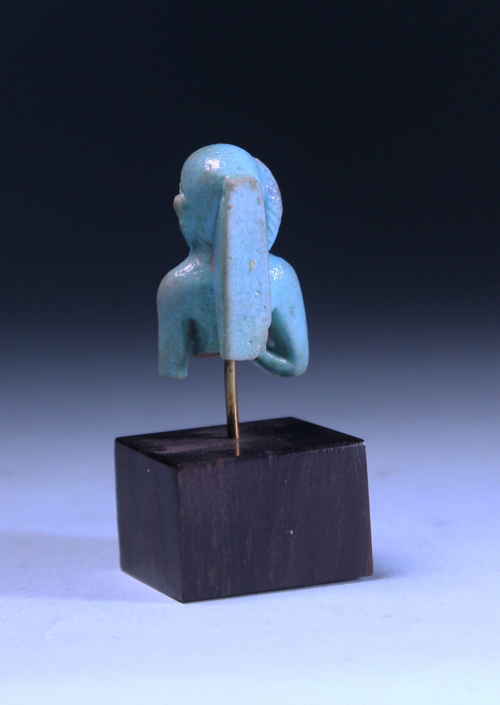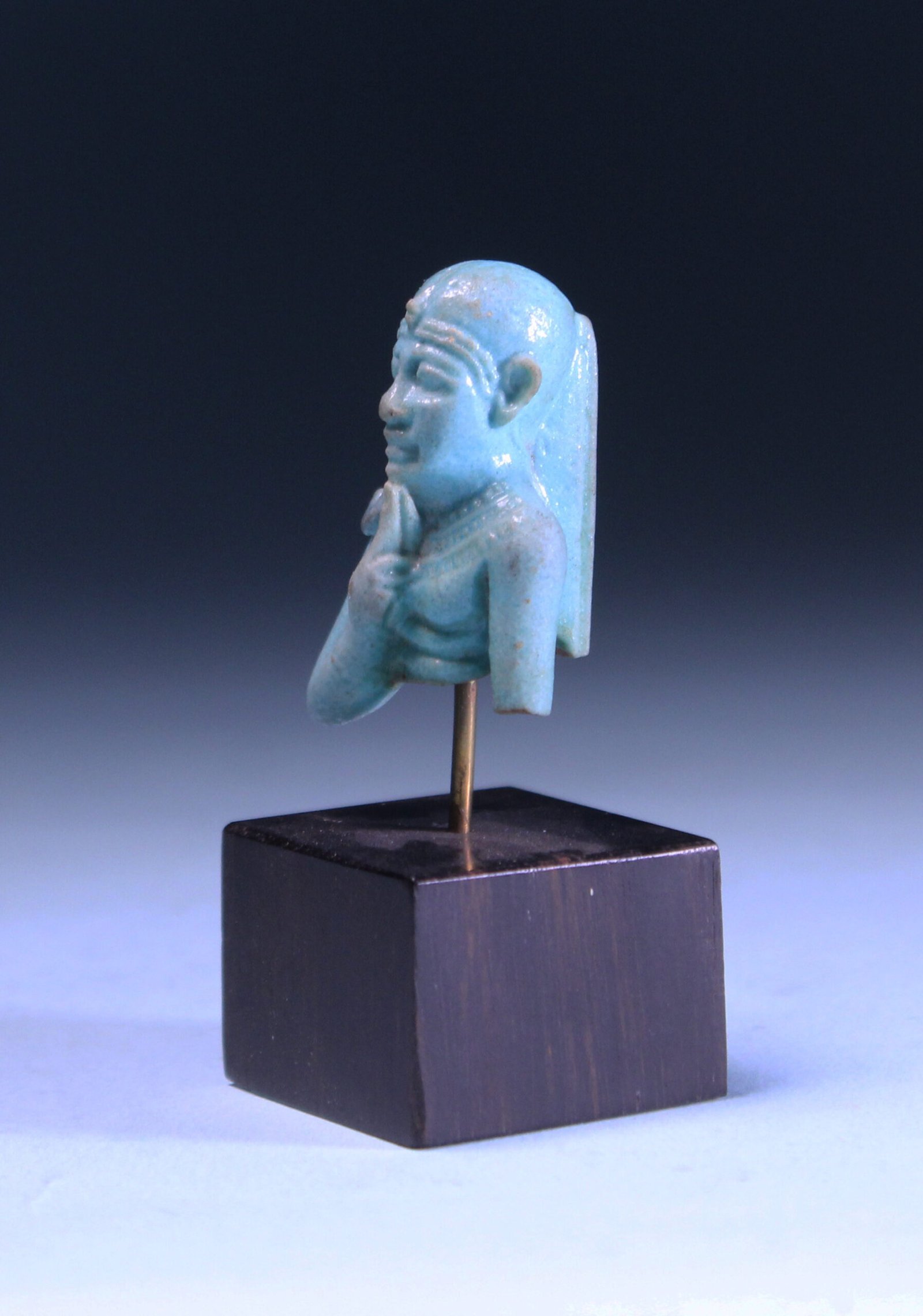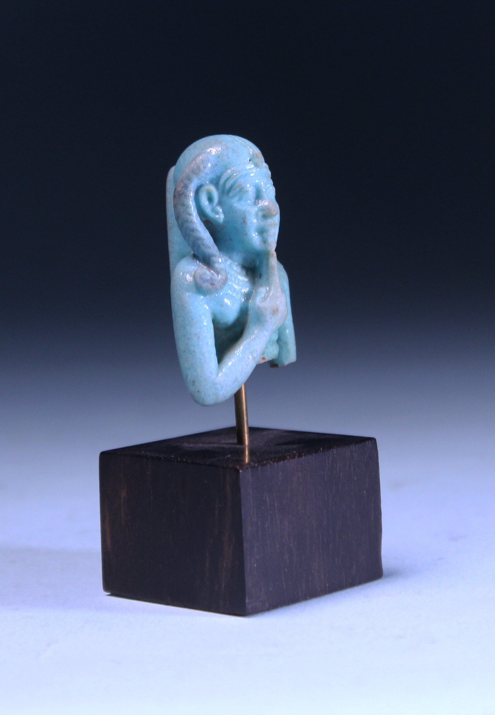 An ancient Egyptian blue faience amulet fragment depicting the child god Harpokrates nude, wearing the sidelock of youth, his right hand to his mouth.