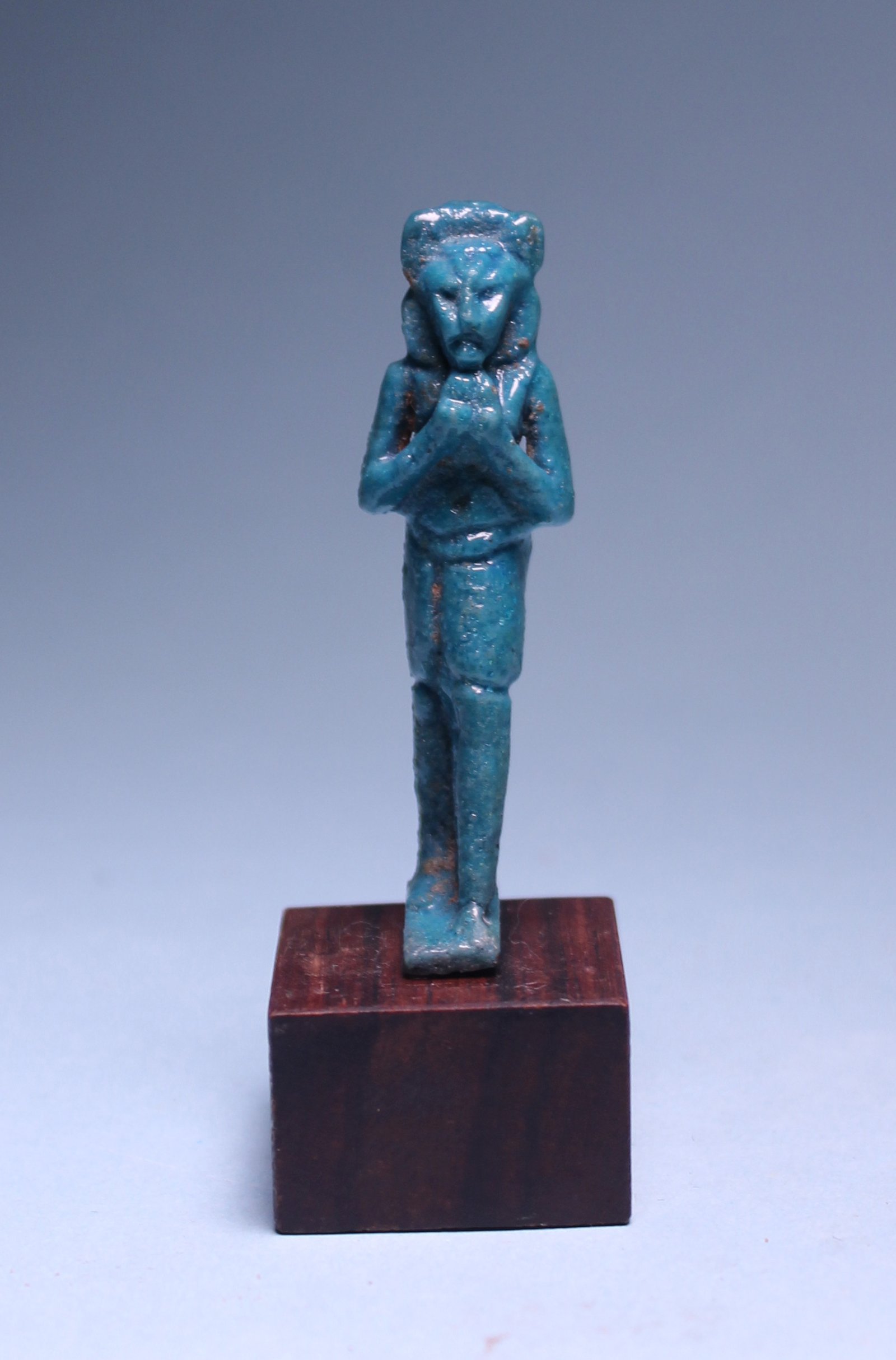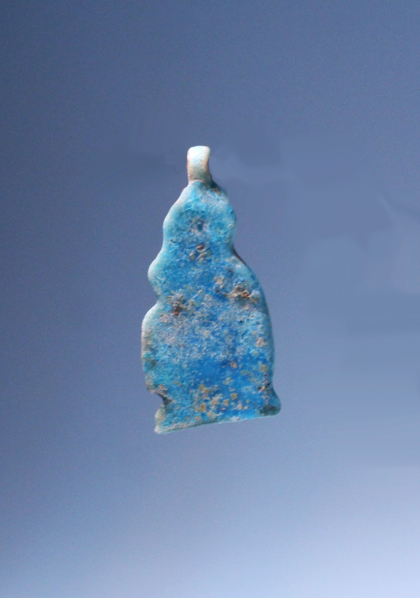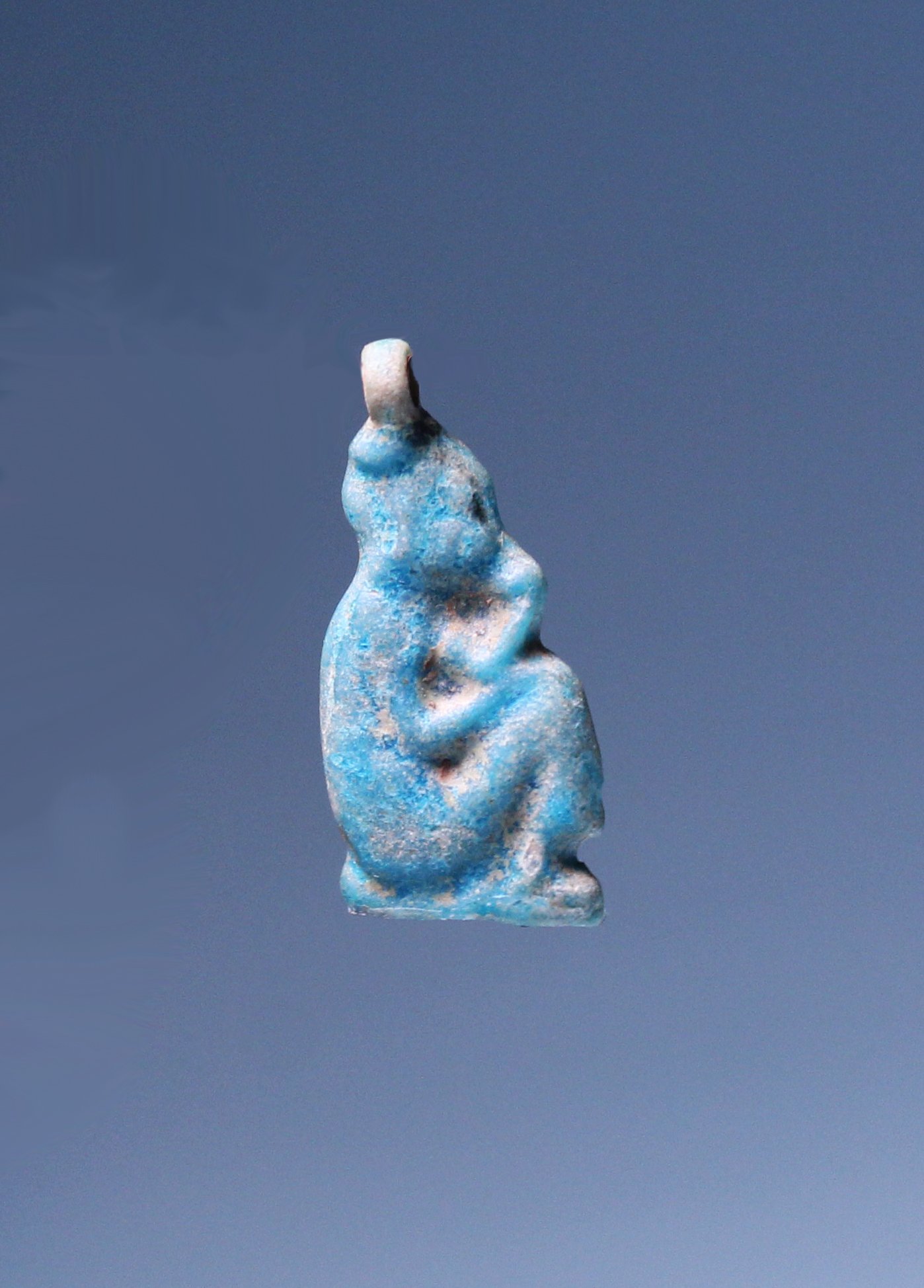 An ancient Egyptian blue faience amulet depicting the child god Harpokrates seated with his left hand to his mouth, wearing the sidelock of youth; with suspension loop at the top.