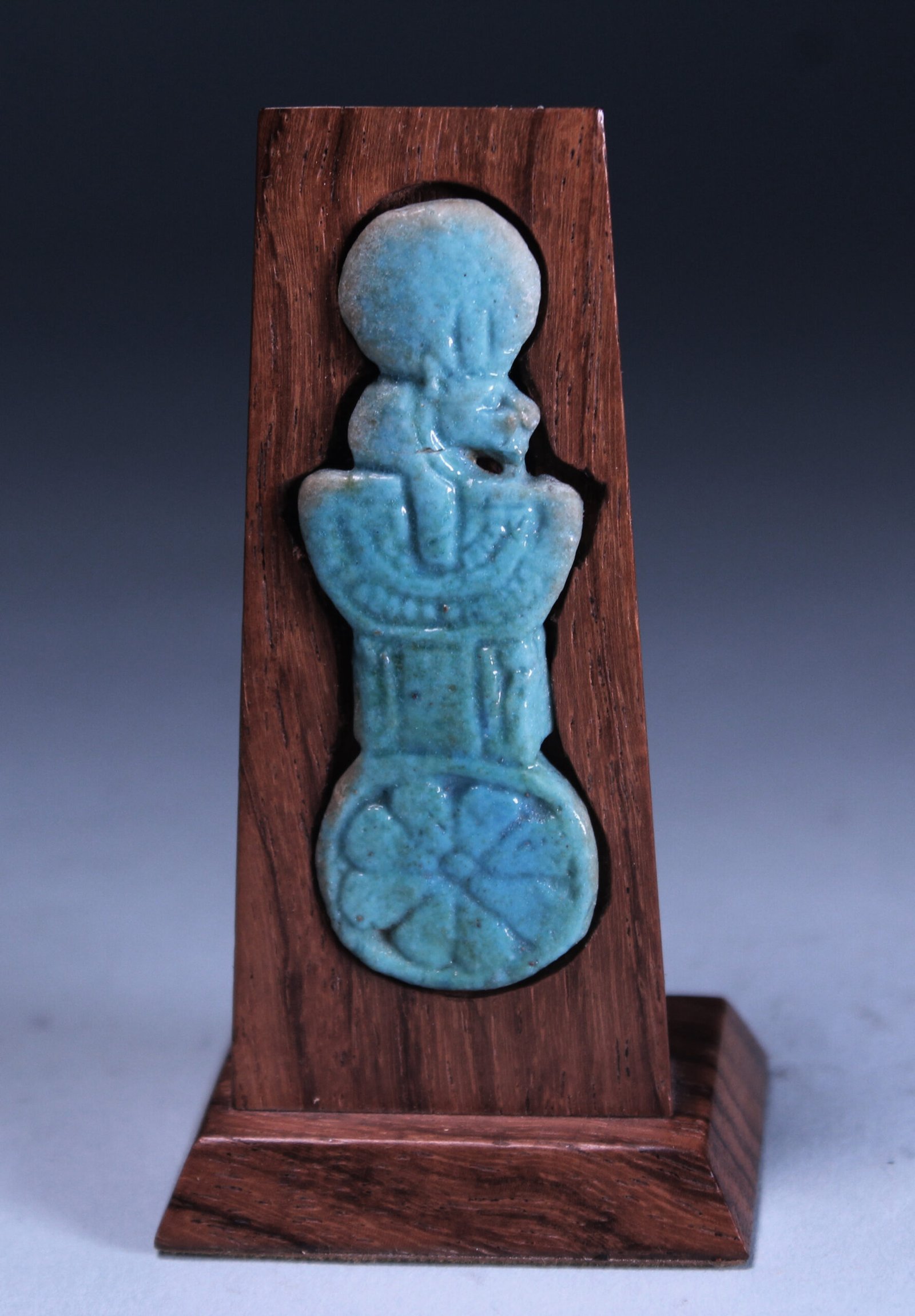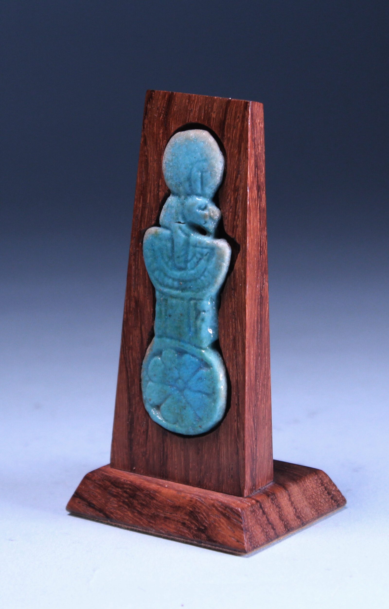 The menat was an elaborate necklace of multiple strings of beads. The heavy weight necessitated a counterpoise, which was worn on the back between the shoulder blades. Menat counterpoises in amuletic form are found from the New Kingdom onwards. The most ornate examples date to the Third Intermediate Period and feature protective feminine feline deities.