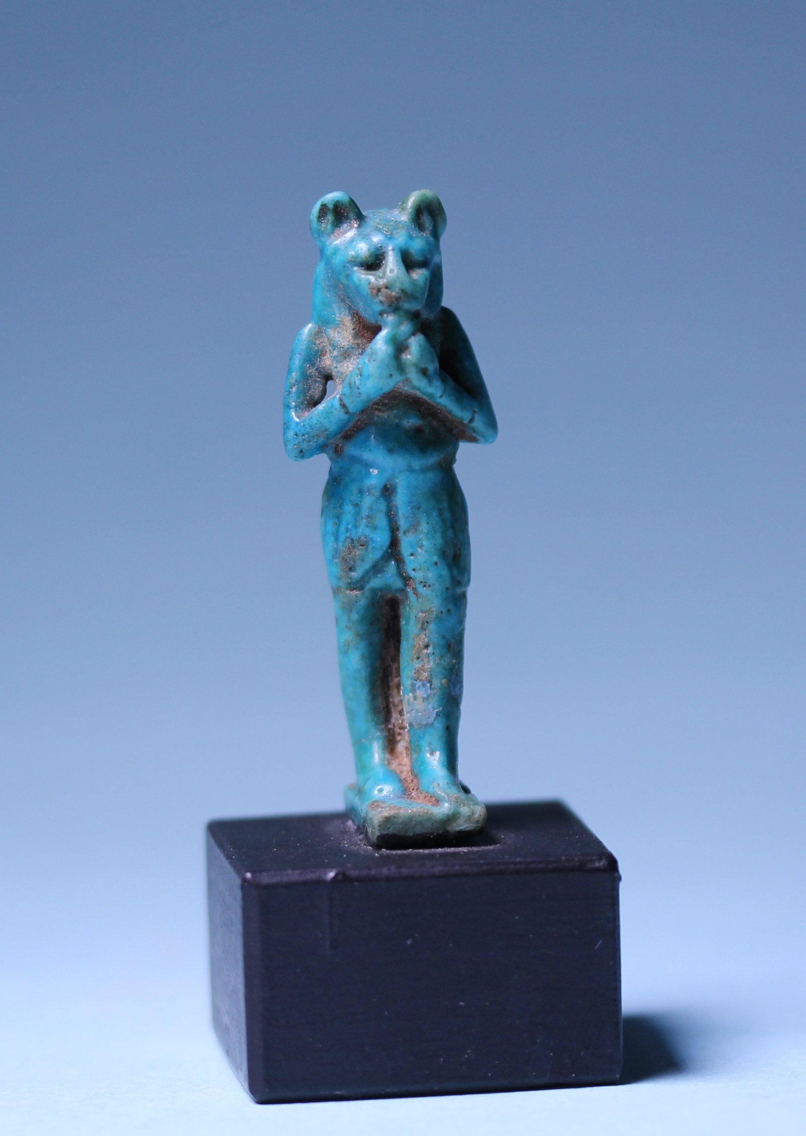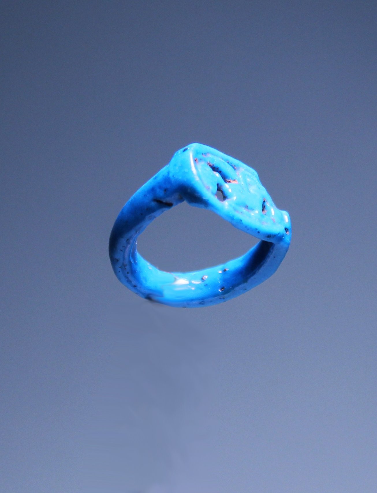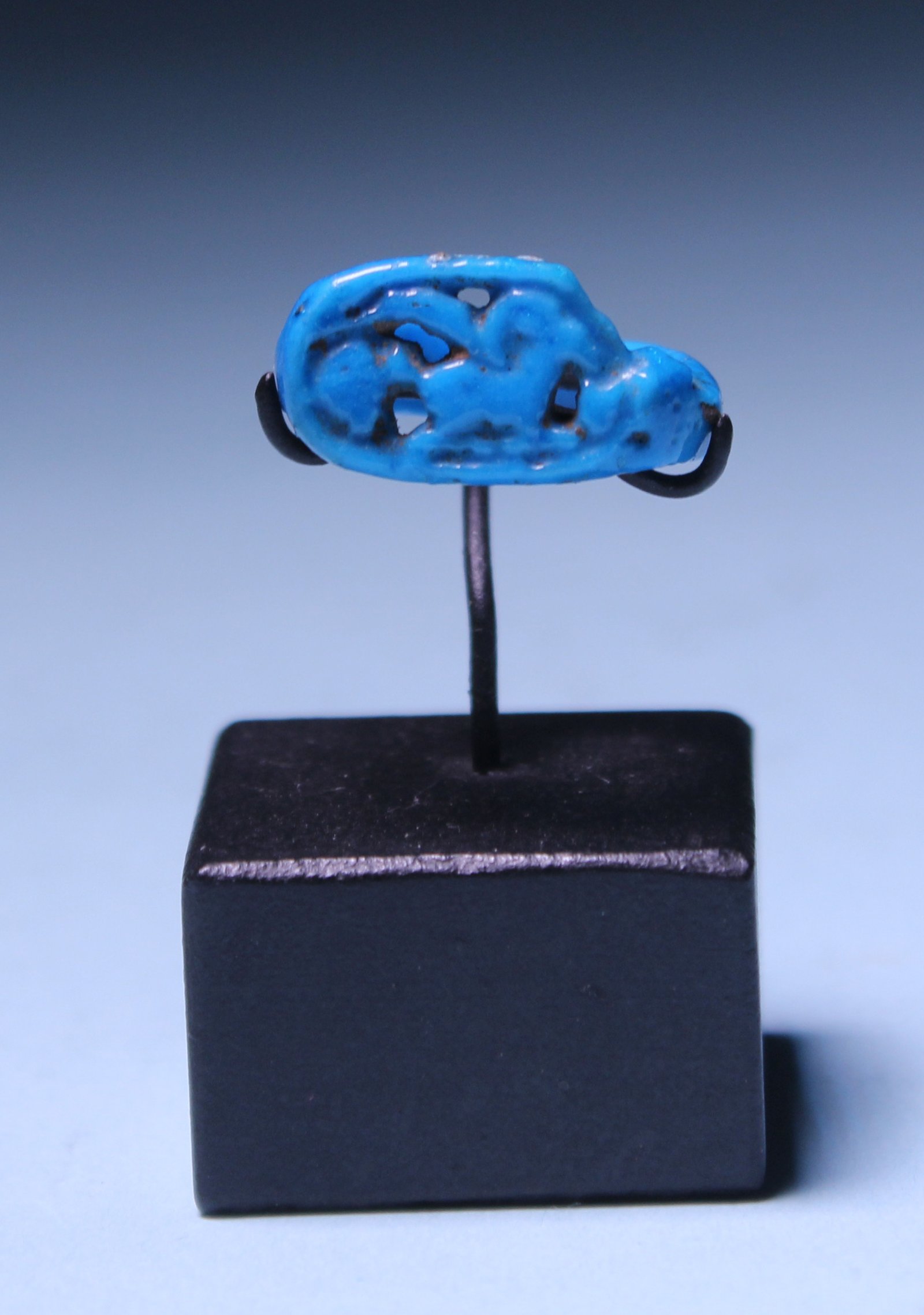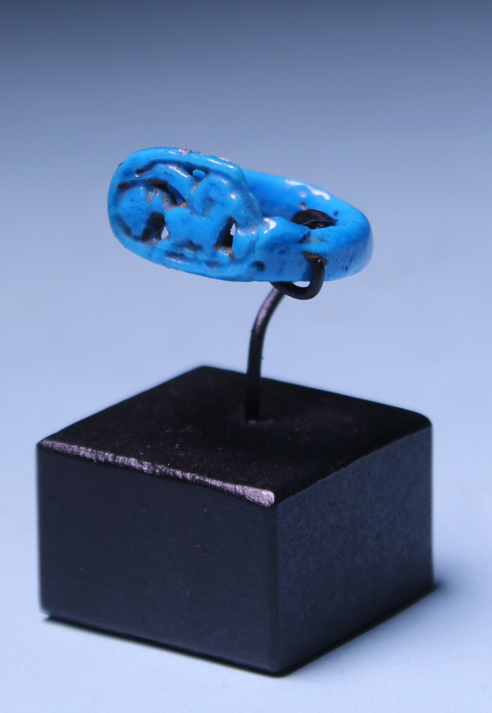 An ancient Egyptian blue faience finger ring with an openwork bezel depicting a recumbent oryx.