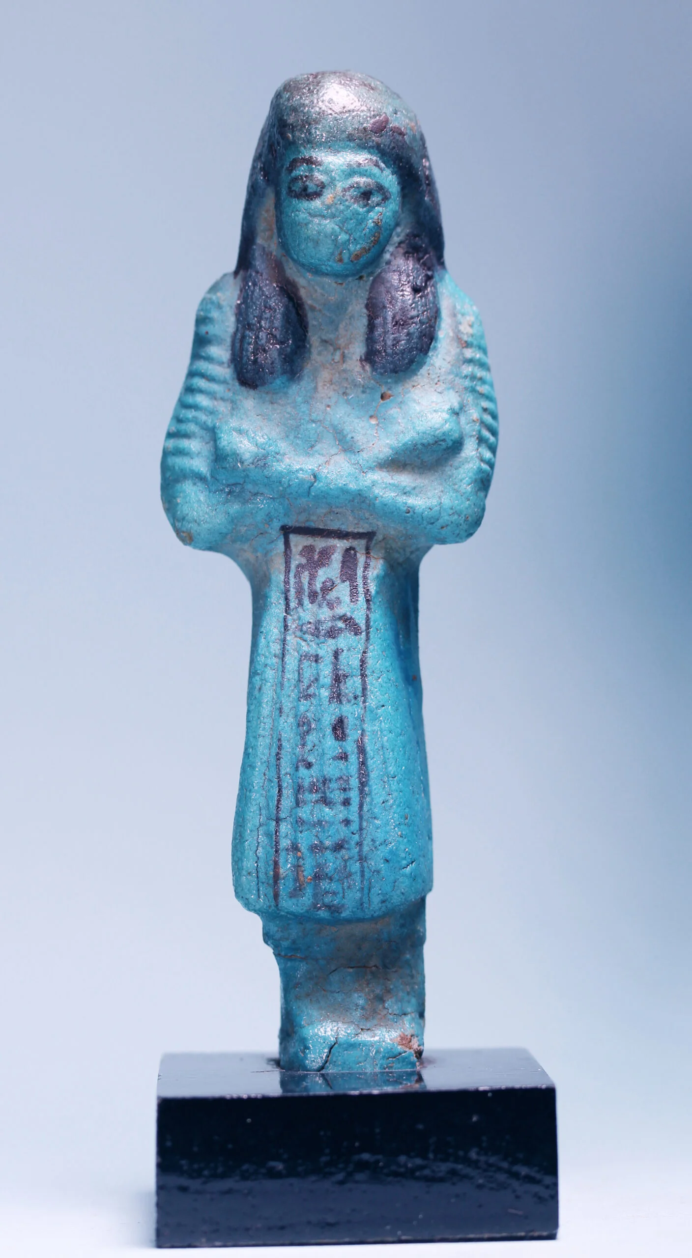 Shabtis were first introduced in the Middle Kingdom as substitutes for the the mummy in case it was destroyed. During the Second Intermediate Period inscribed wooden figures called shawabtis (after the Egyptian word for wood, shawab) began to be placed in tombs. During the New Kingdom, shabtis assumed a new role as servant figures for the deceased. They were now depicted with agricultural equipment. By the Third Intermediate Period, the number of shabtis placed in the tomb was set at 401 (365 workers and 36 overseers). During the Late Period the tomb figures became known as ushabtis (‘answerers’), these figures represented servants who would magically answer when called upon to perform agricultural duties for the Pharaoh (in the form of Osiris) in the afterlife. Their main function was to ensure the individual’s comfort and freedom from daily labor in the next life.