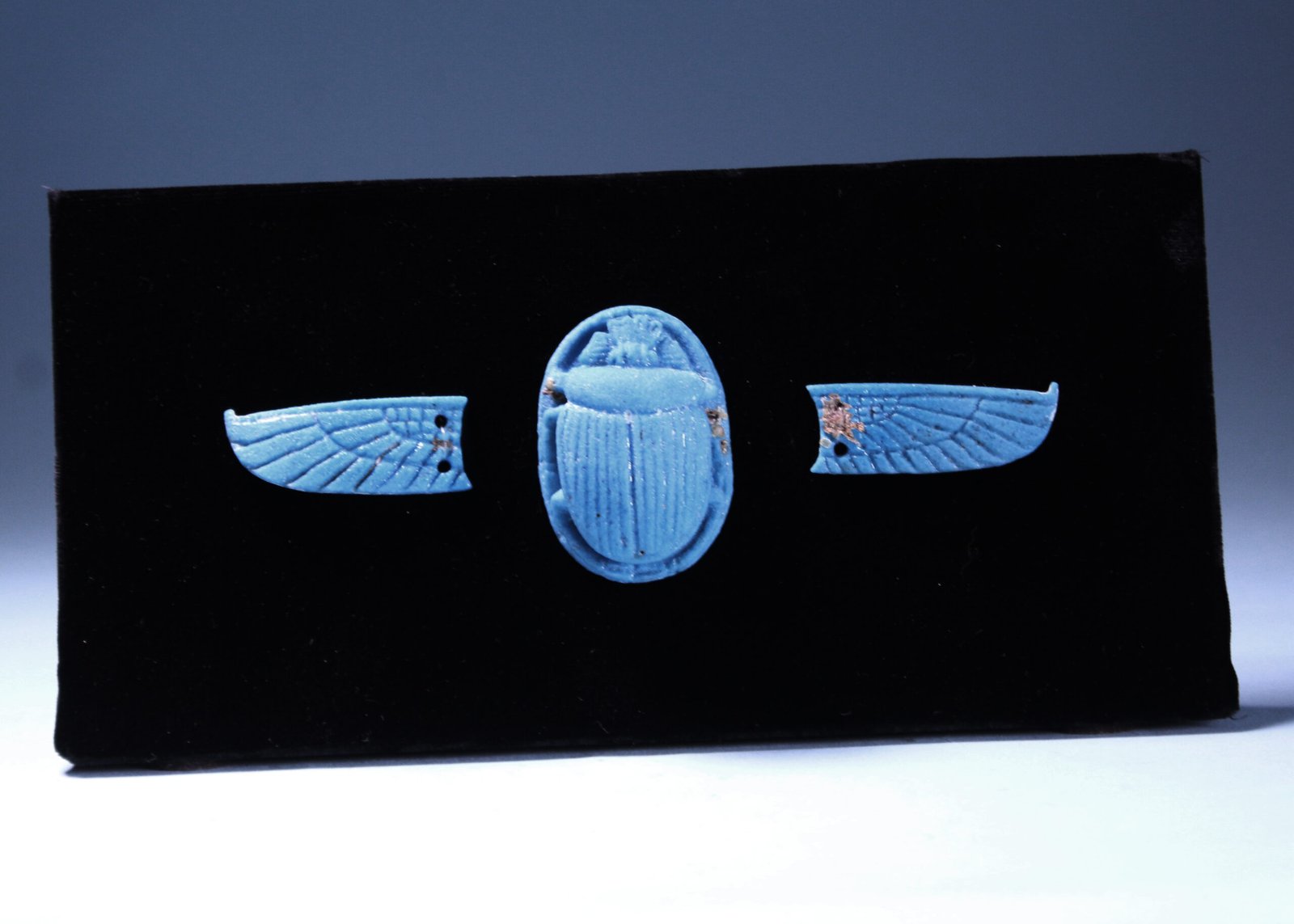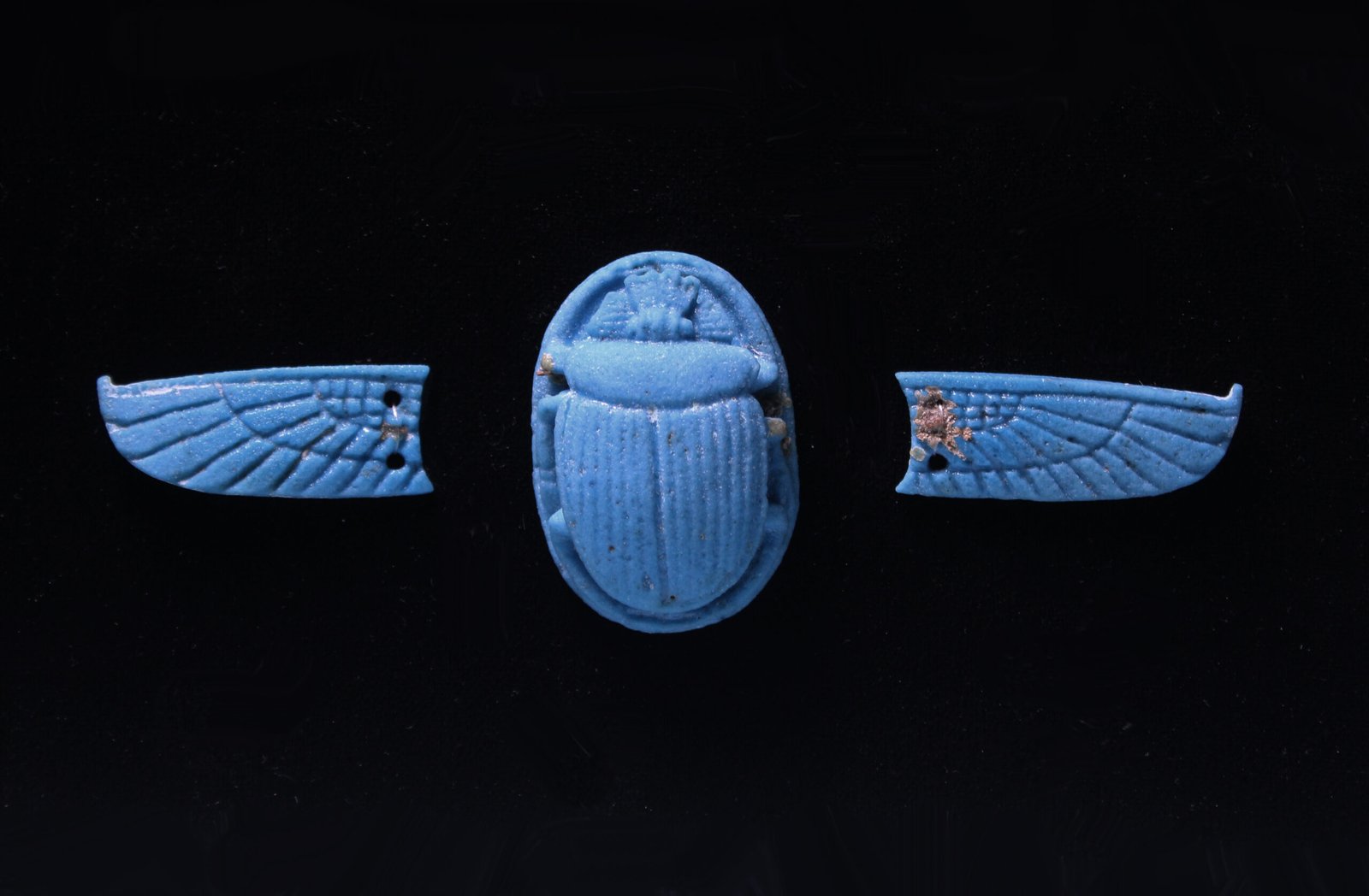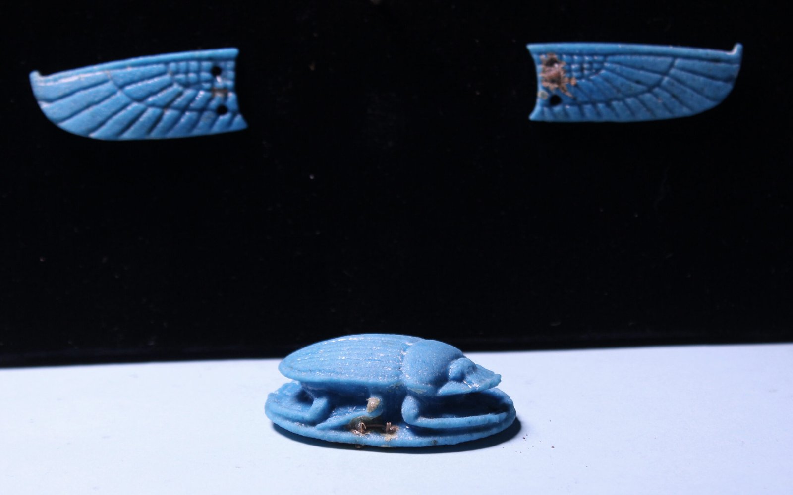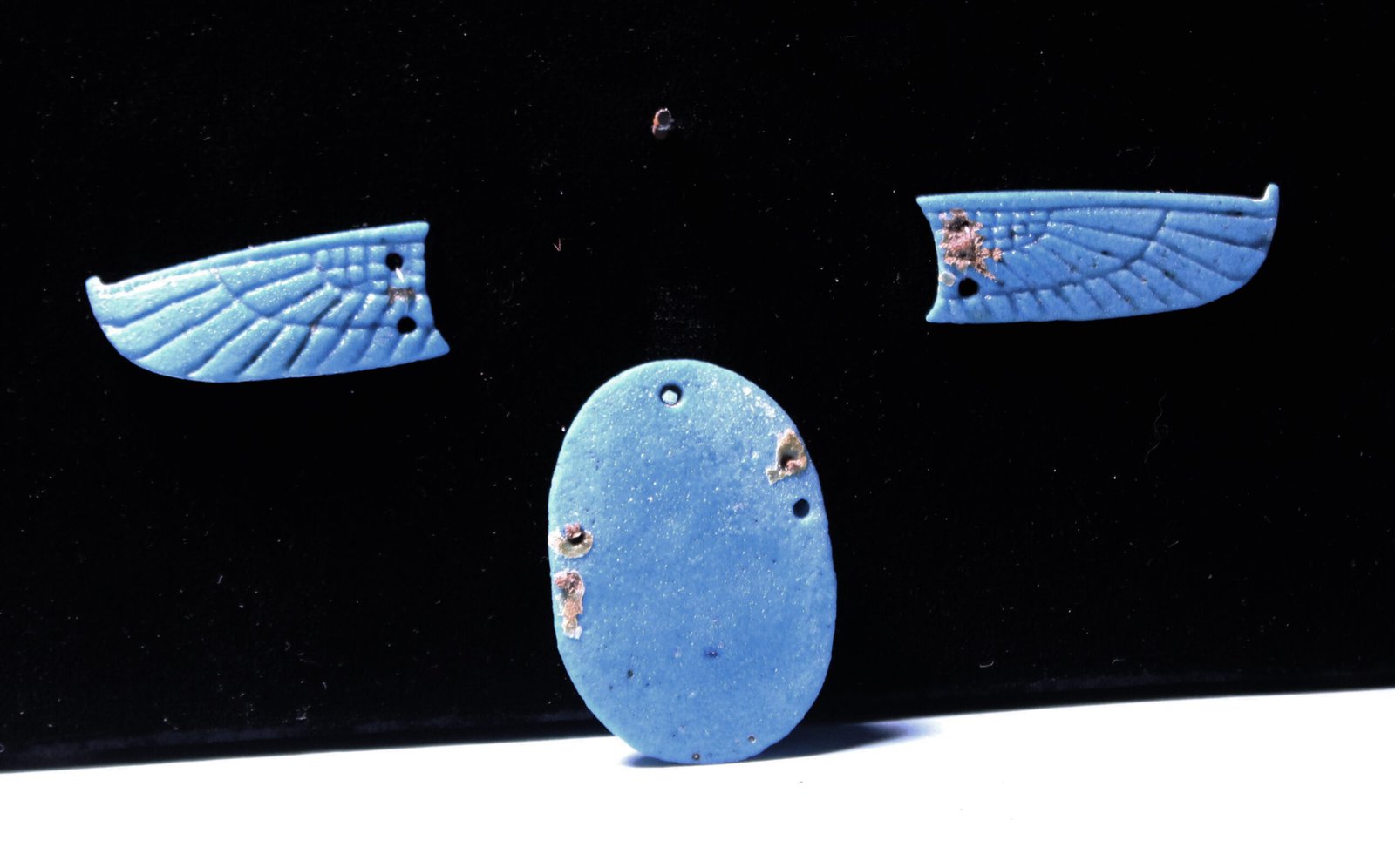 An ancient Egyptian blue faience winged scarab, the beetle finely articulated with anatomical details; both the wings and beetle pierced for attachment.