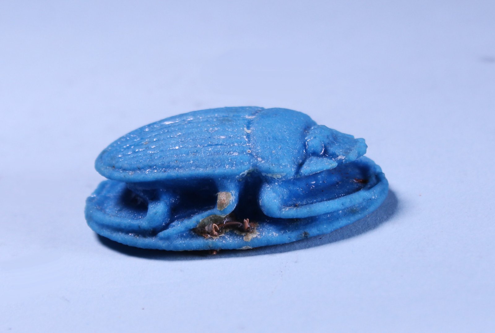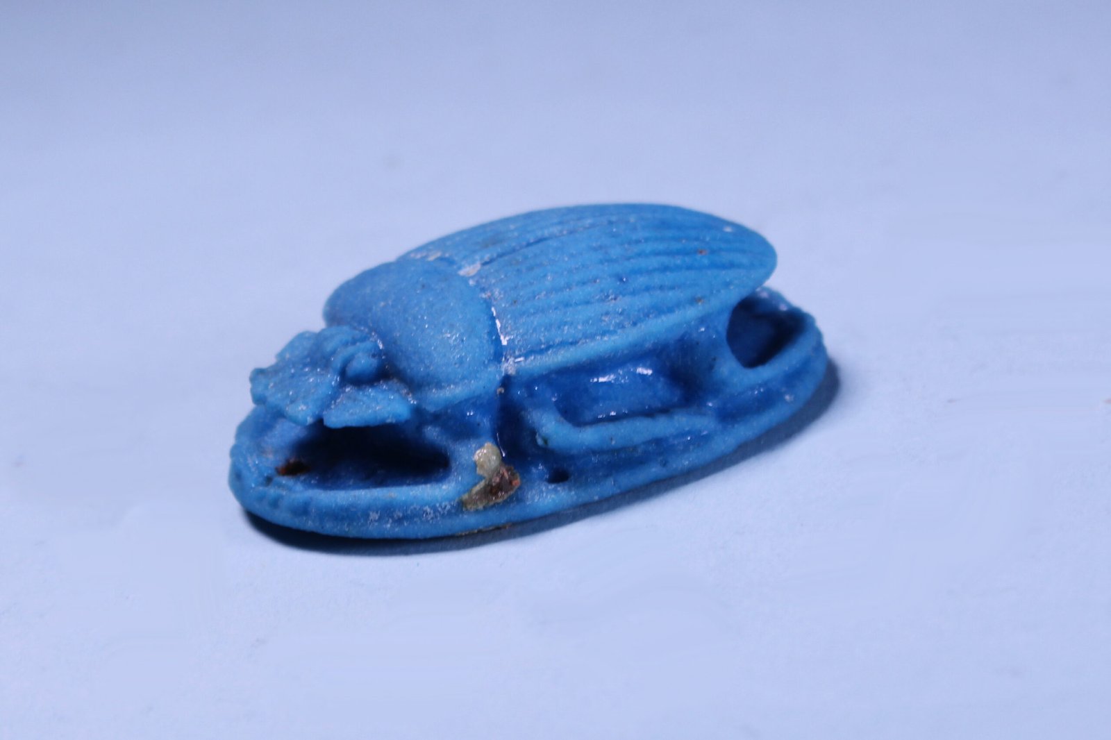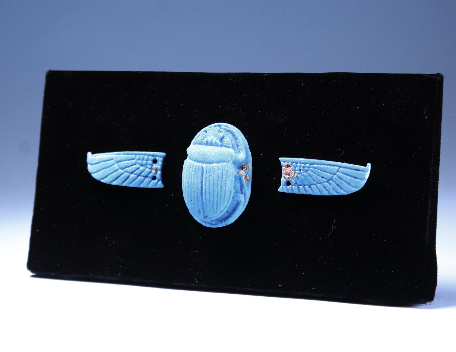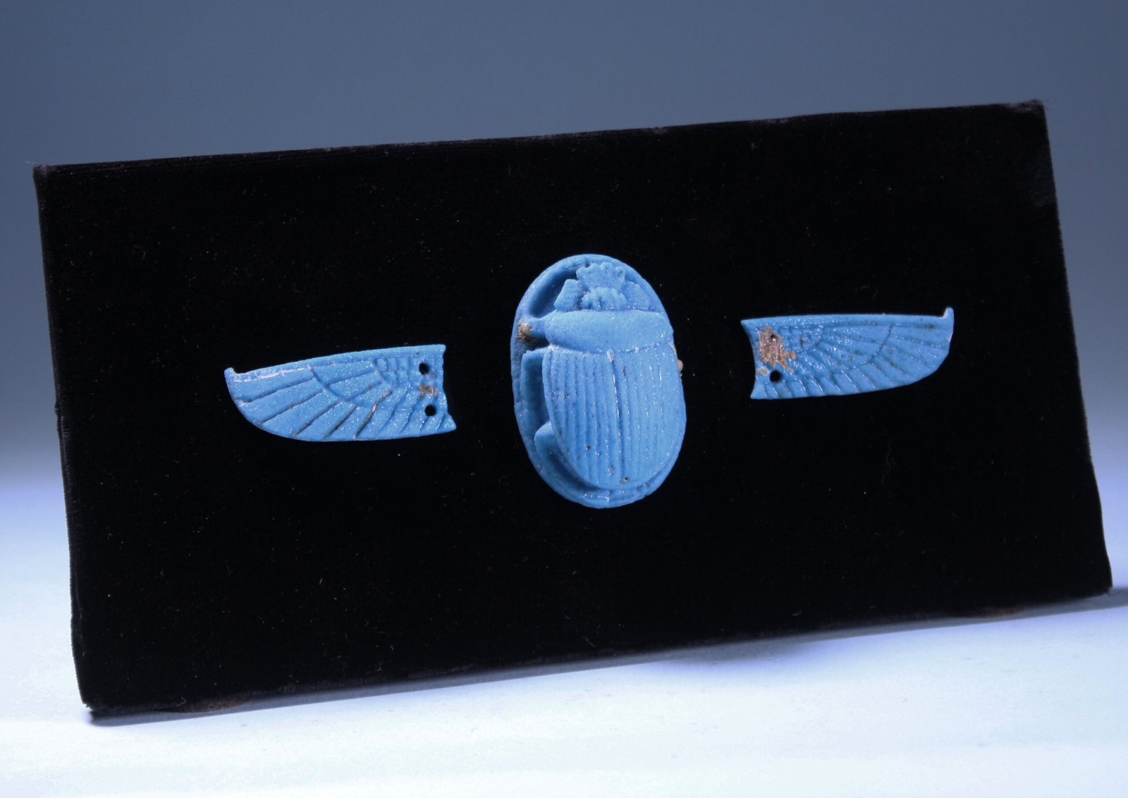 An ancient Egyptian blue faience winged scarab, the beetle finely articulated with anatomical details; both the wings and beetle pierced for attachment.
