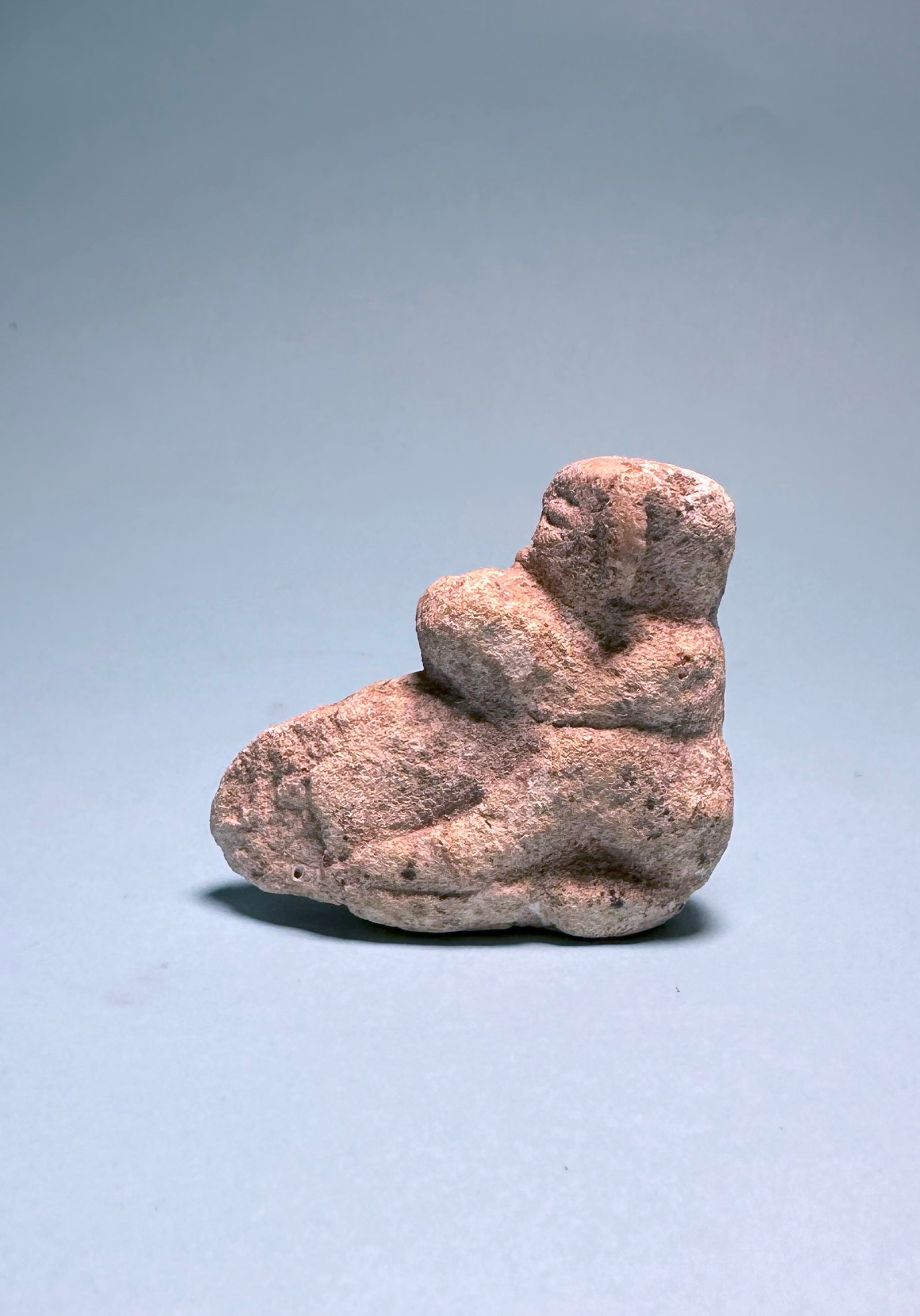 An ancient Egyptian limestone figure of a youth with shaved head and sidelock, holding a rolling pin over his enormous phallus.