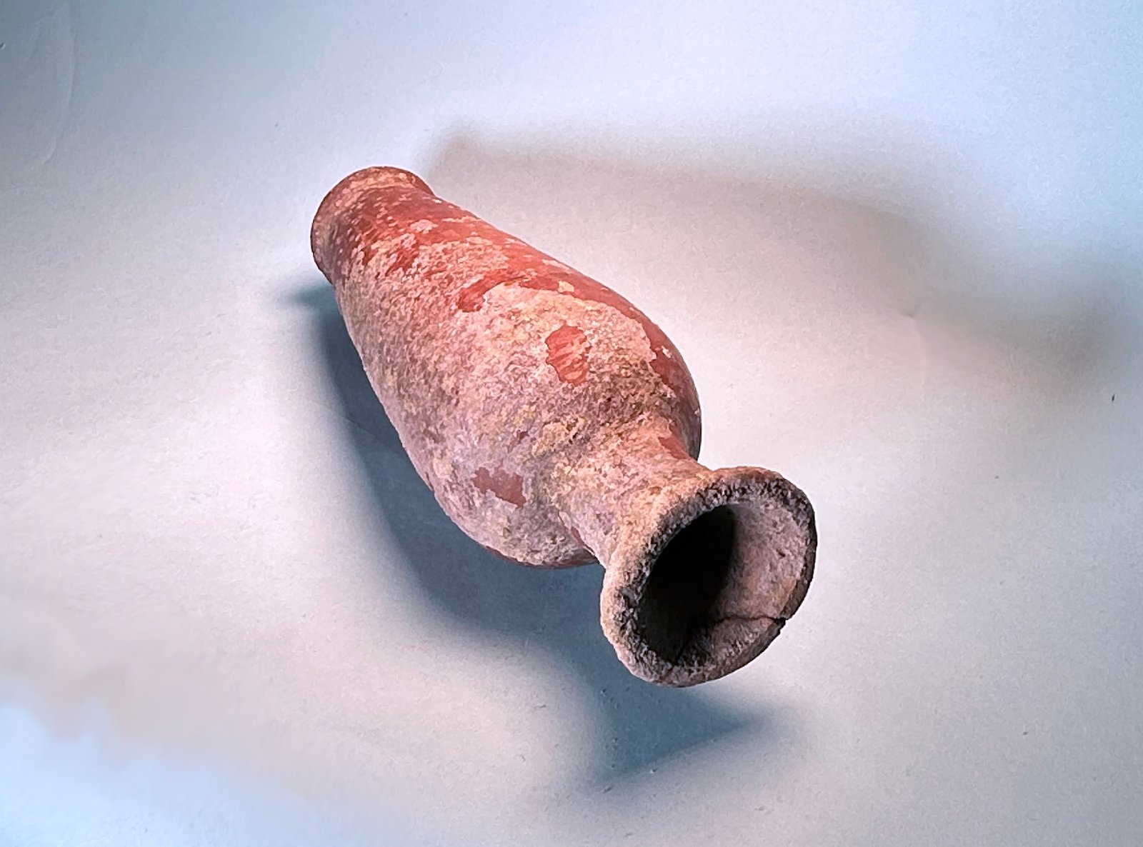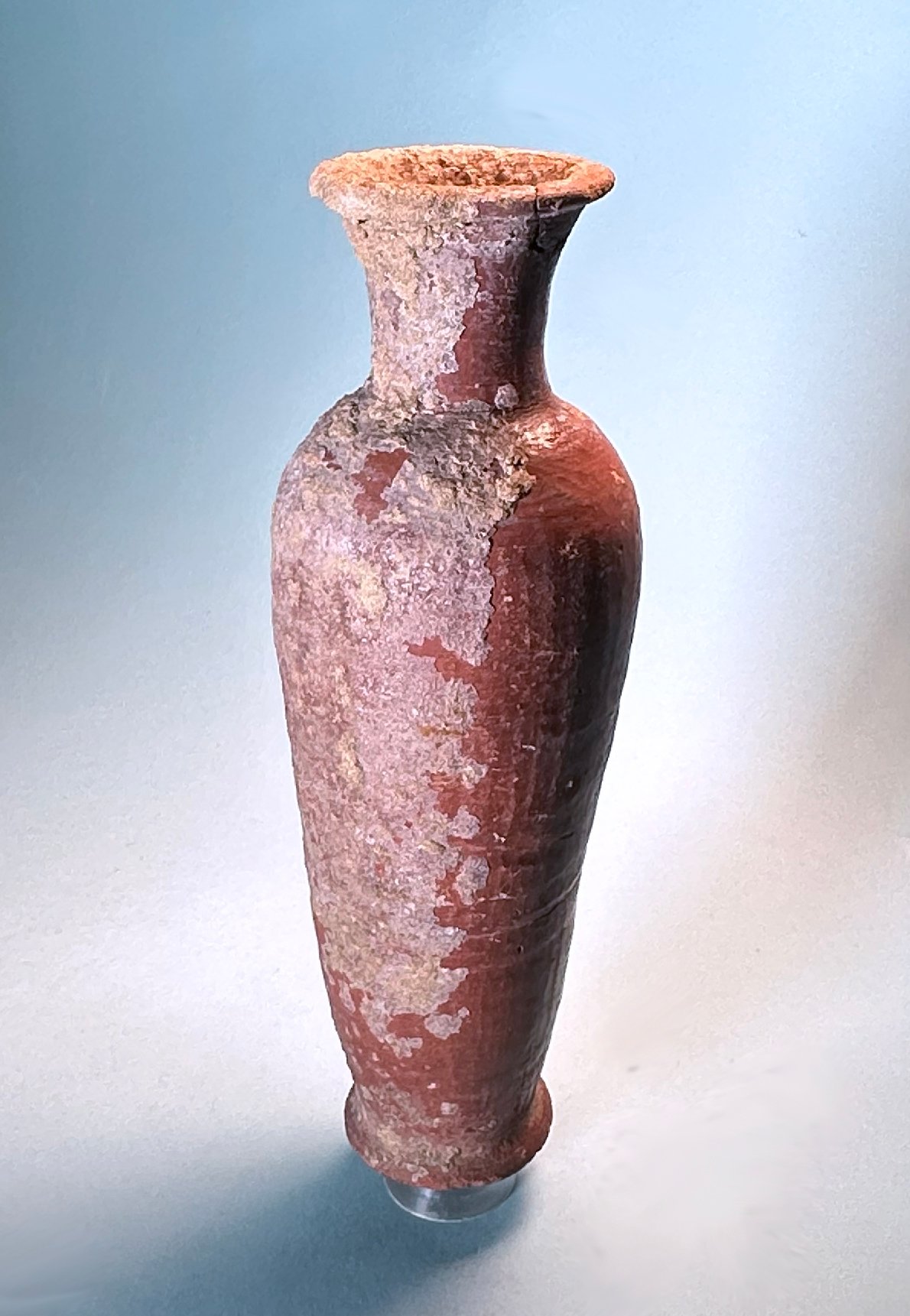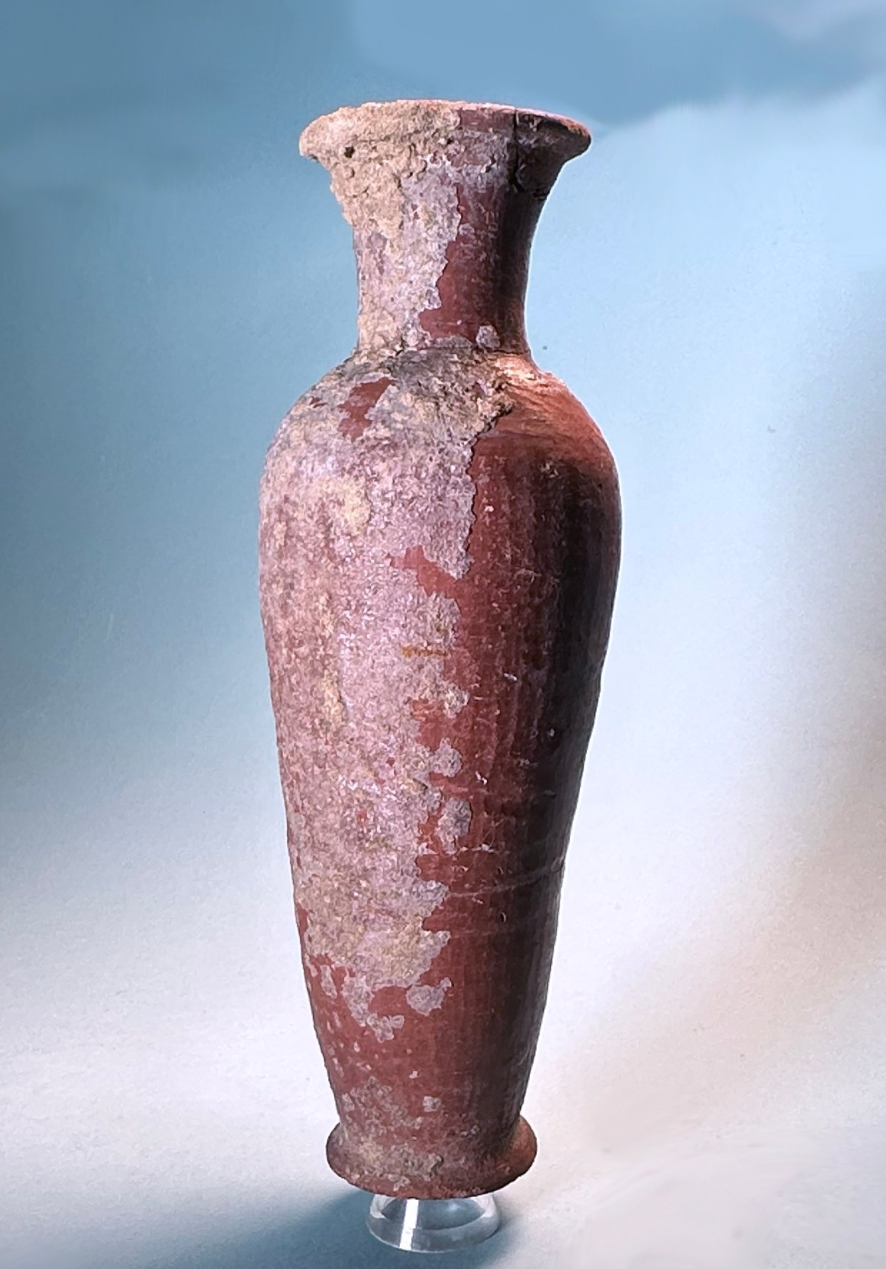 An ancient Egyptian New Kingdom burnished redware vase with a circular foot, elongated conical body with a rounded shoulder, and flared mouth with a flat rim.