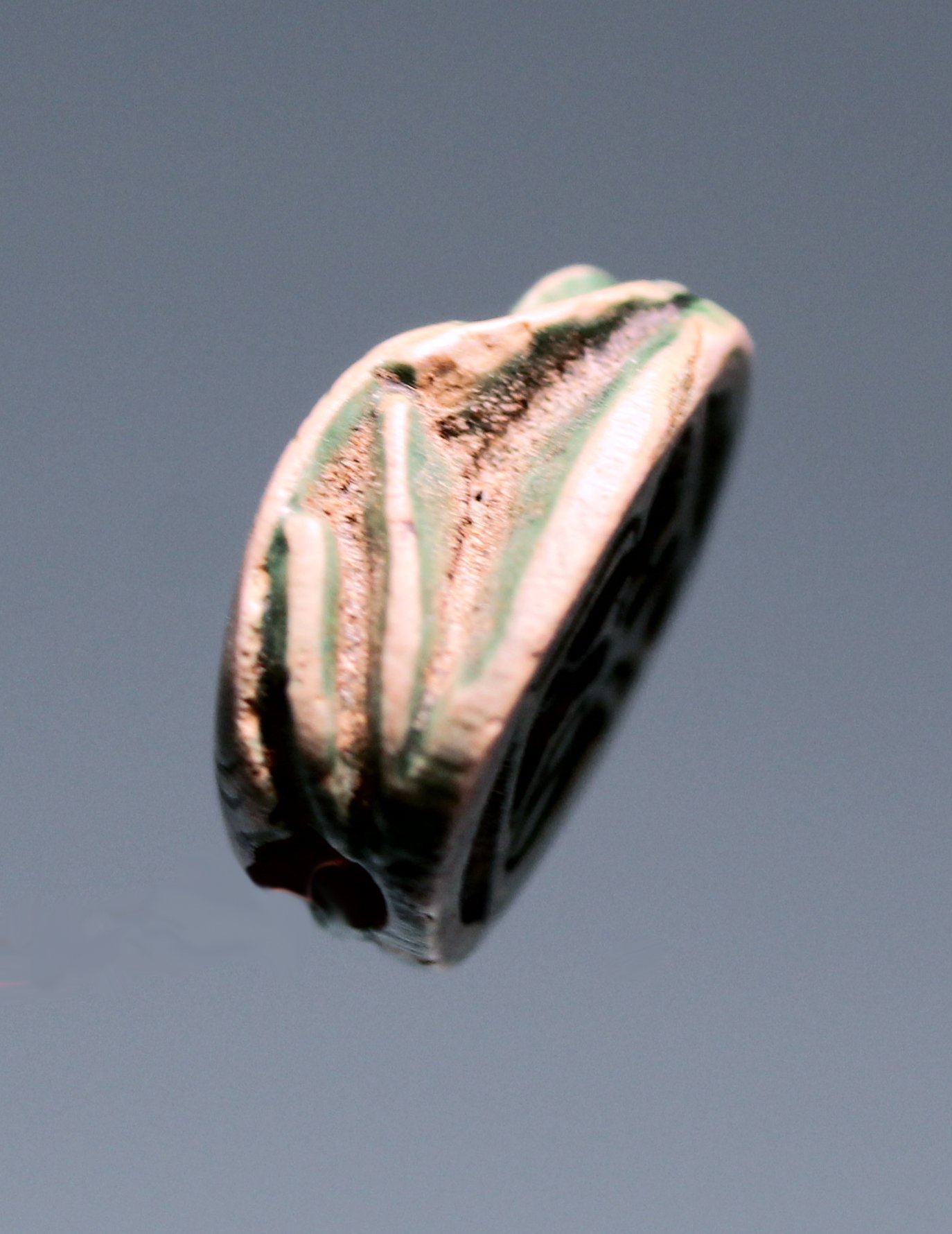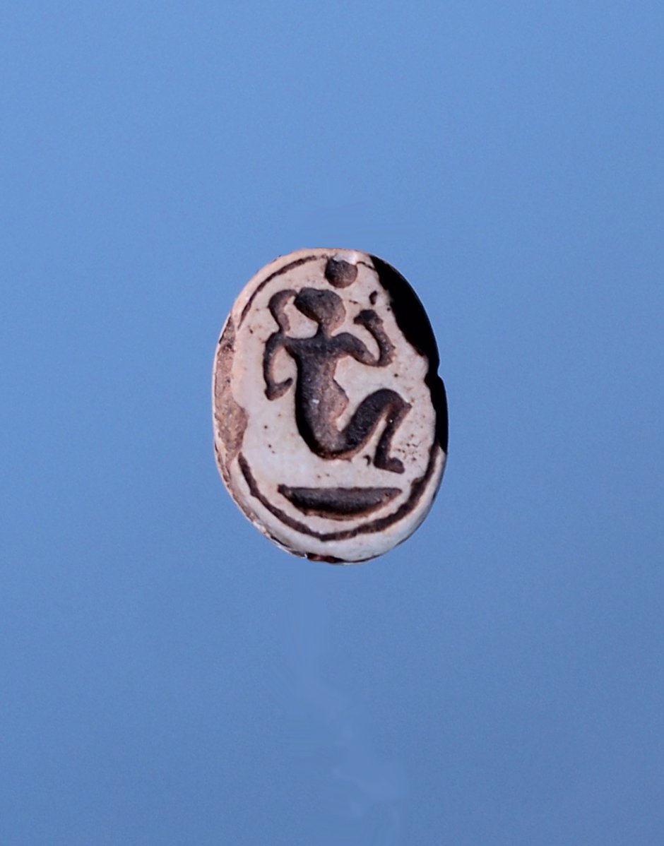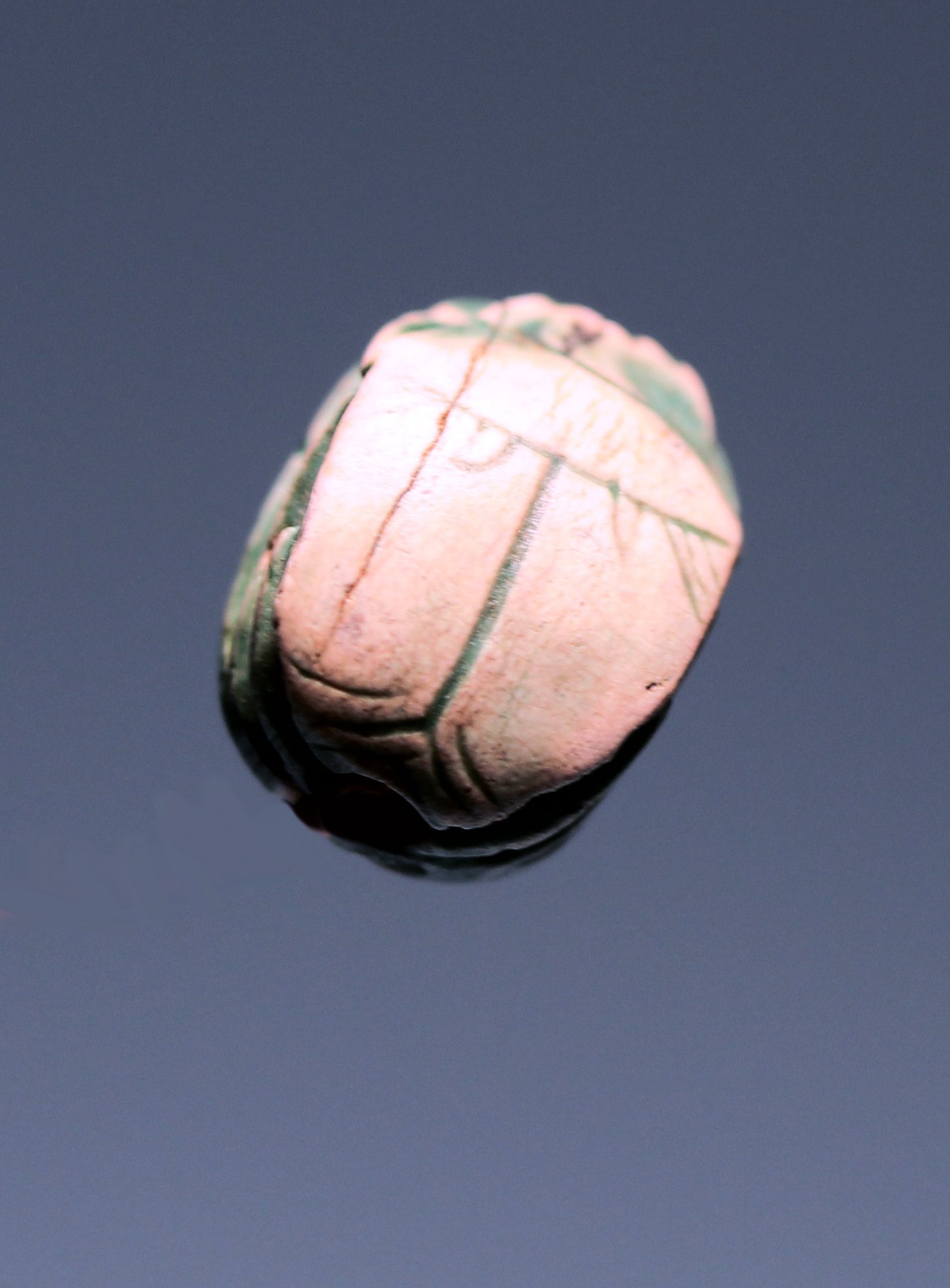 The ancient Egyptians believed the Scarabeus Beetle was able to spontaneously regenerate itself from cow dung, which these beetles can be observed rolling into small balls and burying. Consequently the scarab came to symbolize a spontaneous continuation of the life cycle. These finely carved amulets were worn in life and in necklaces around the mummy. Often the bases were inscribed with symbols or “words of power,” intended to magically invigorate the wearer.