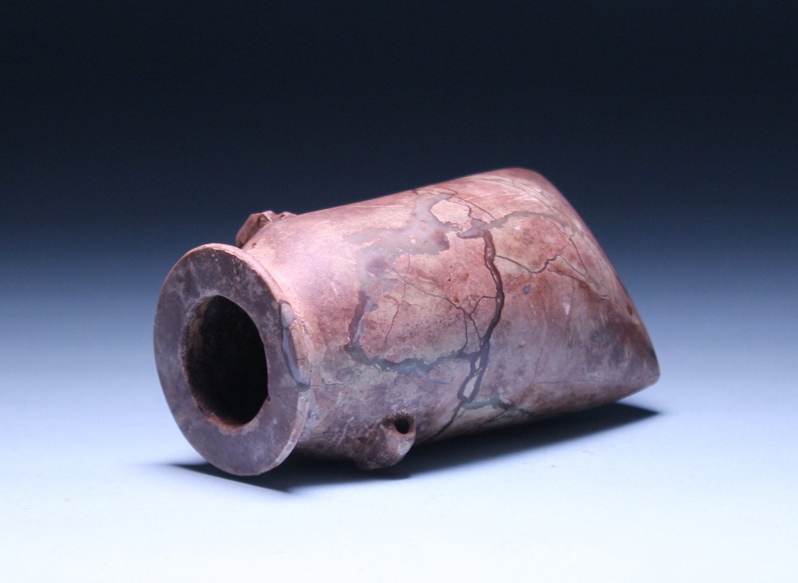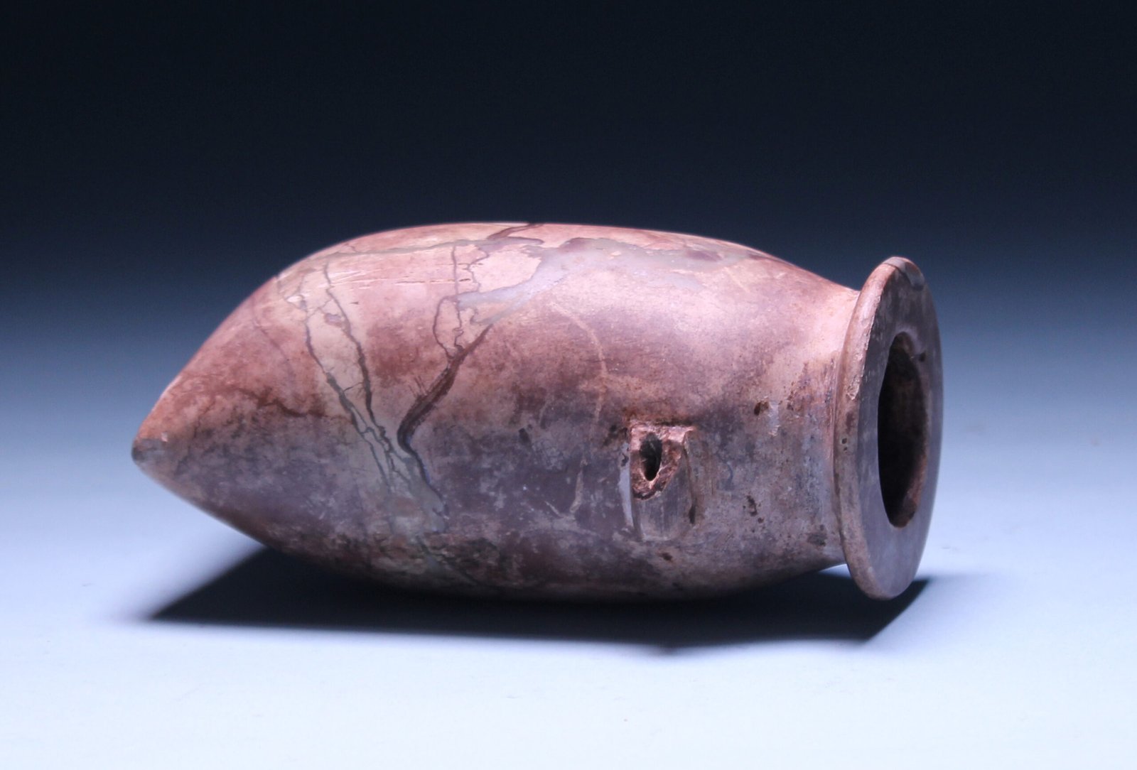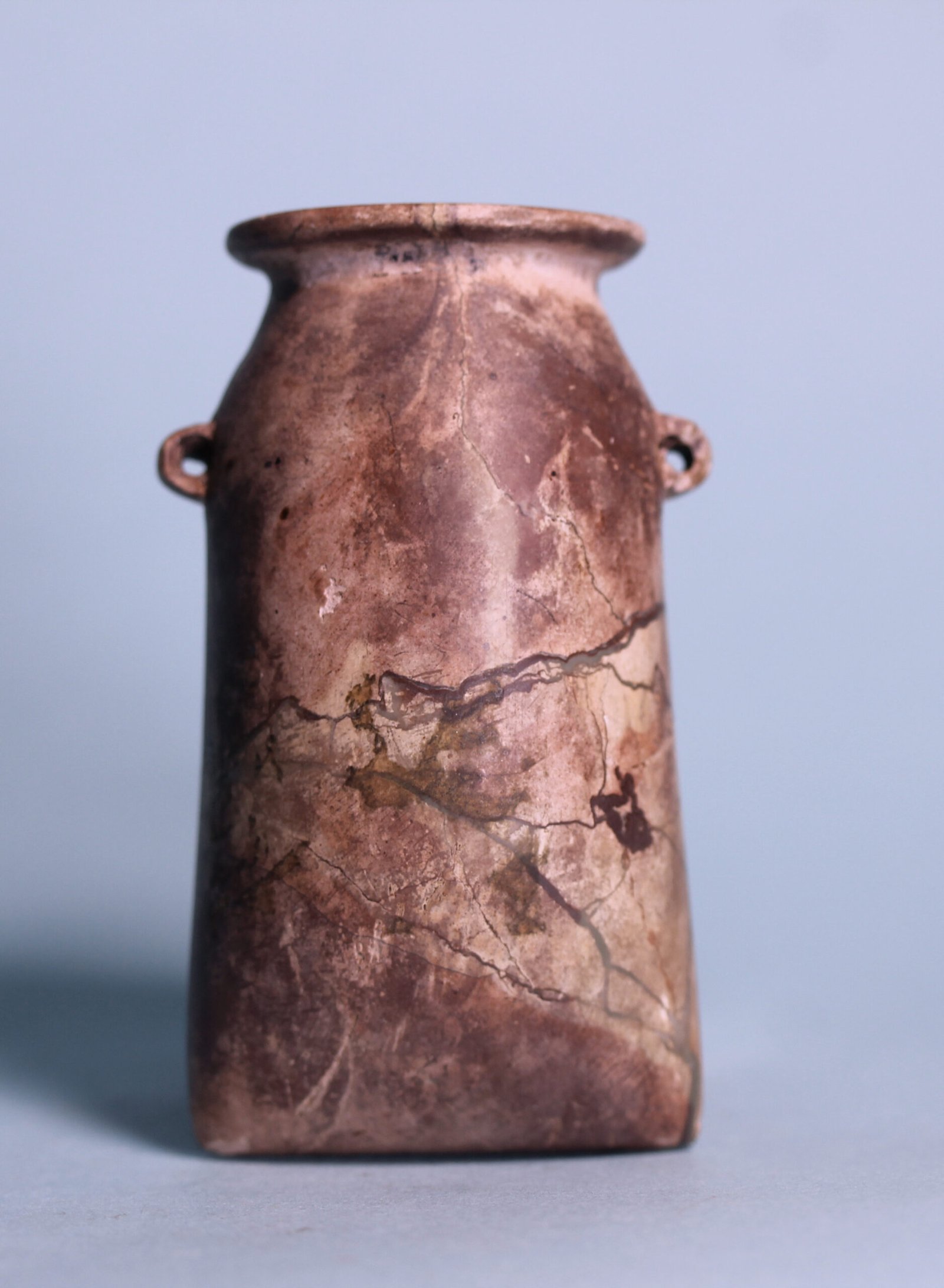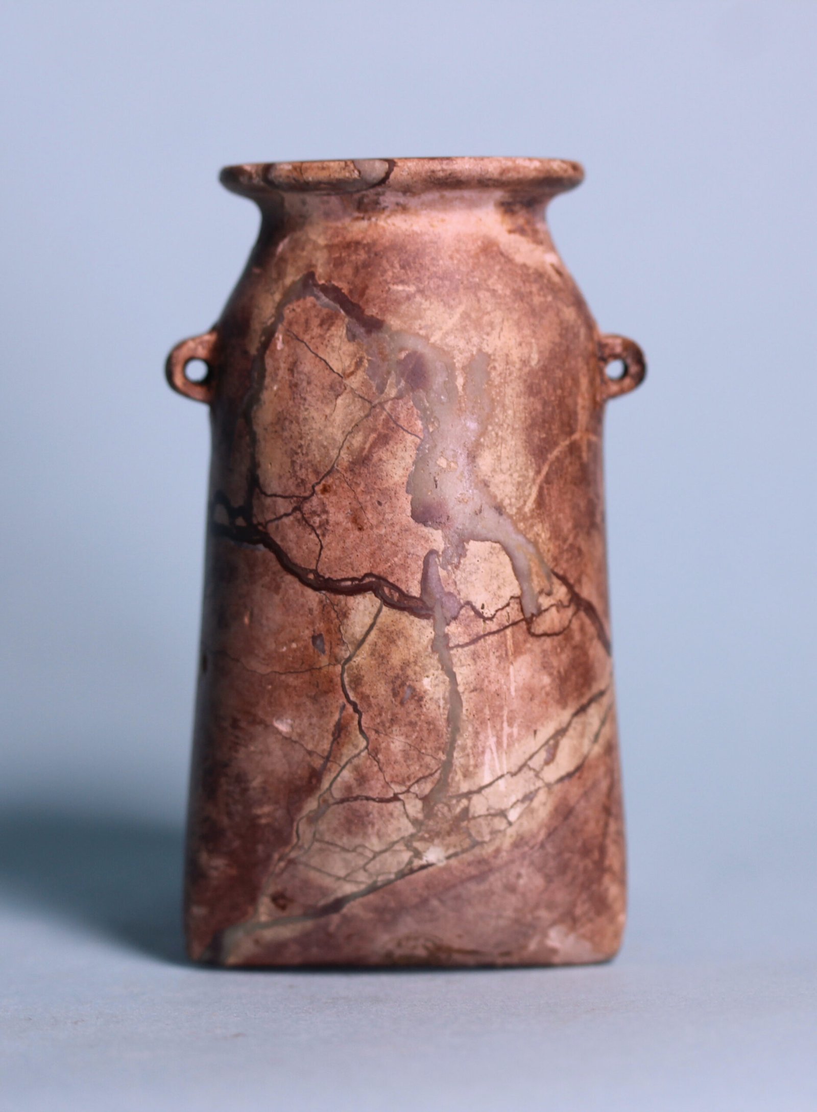 An ancient Egyptian Early Dynastic veined pink stone sack vessel with broad everted lip and two pierced lug handles.