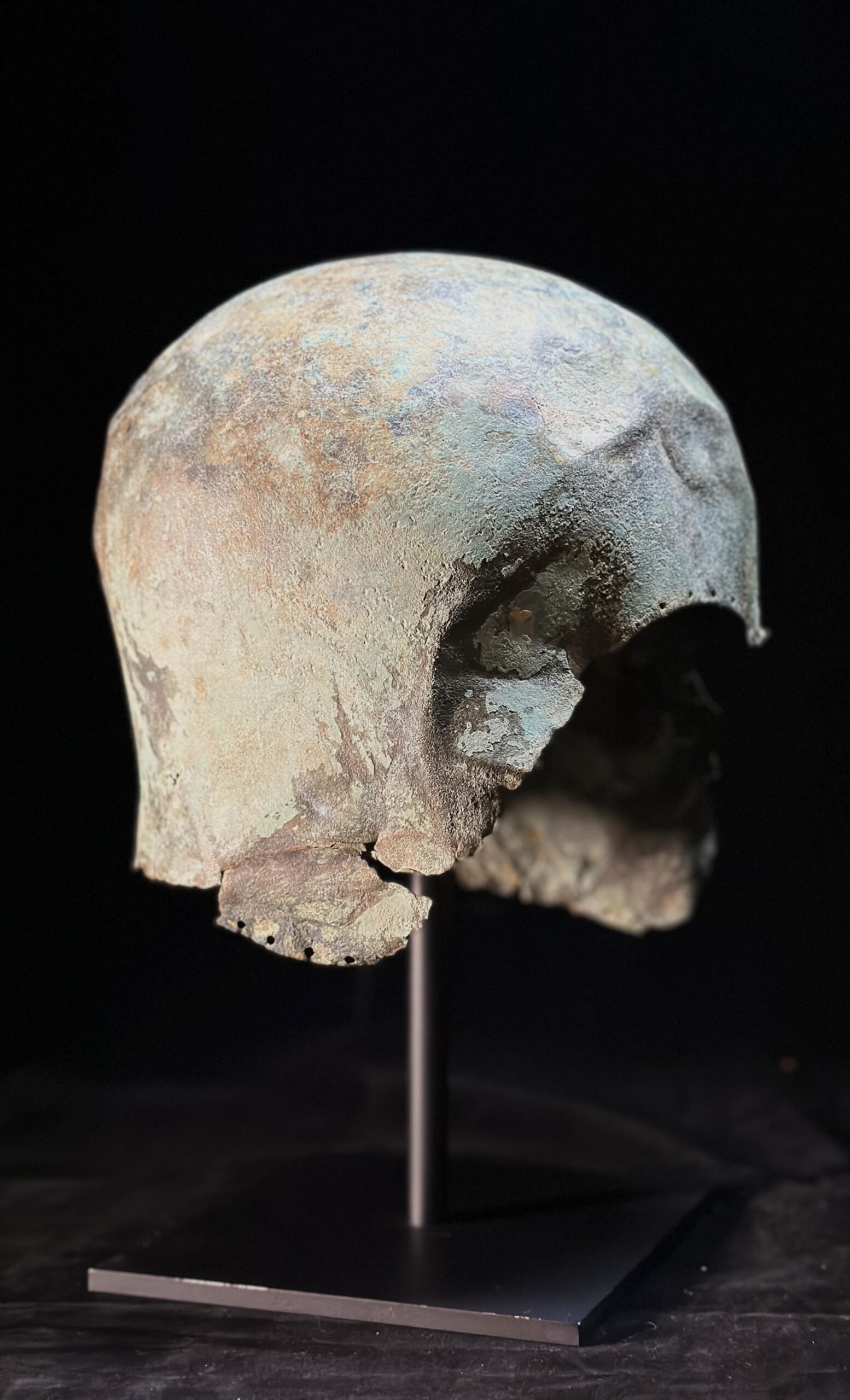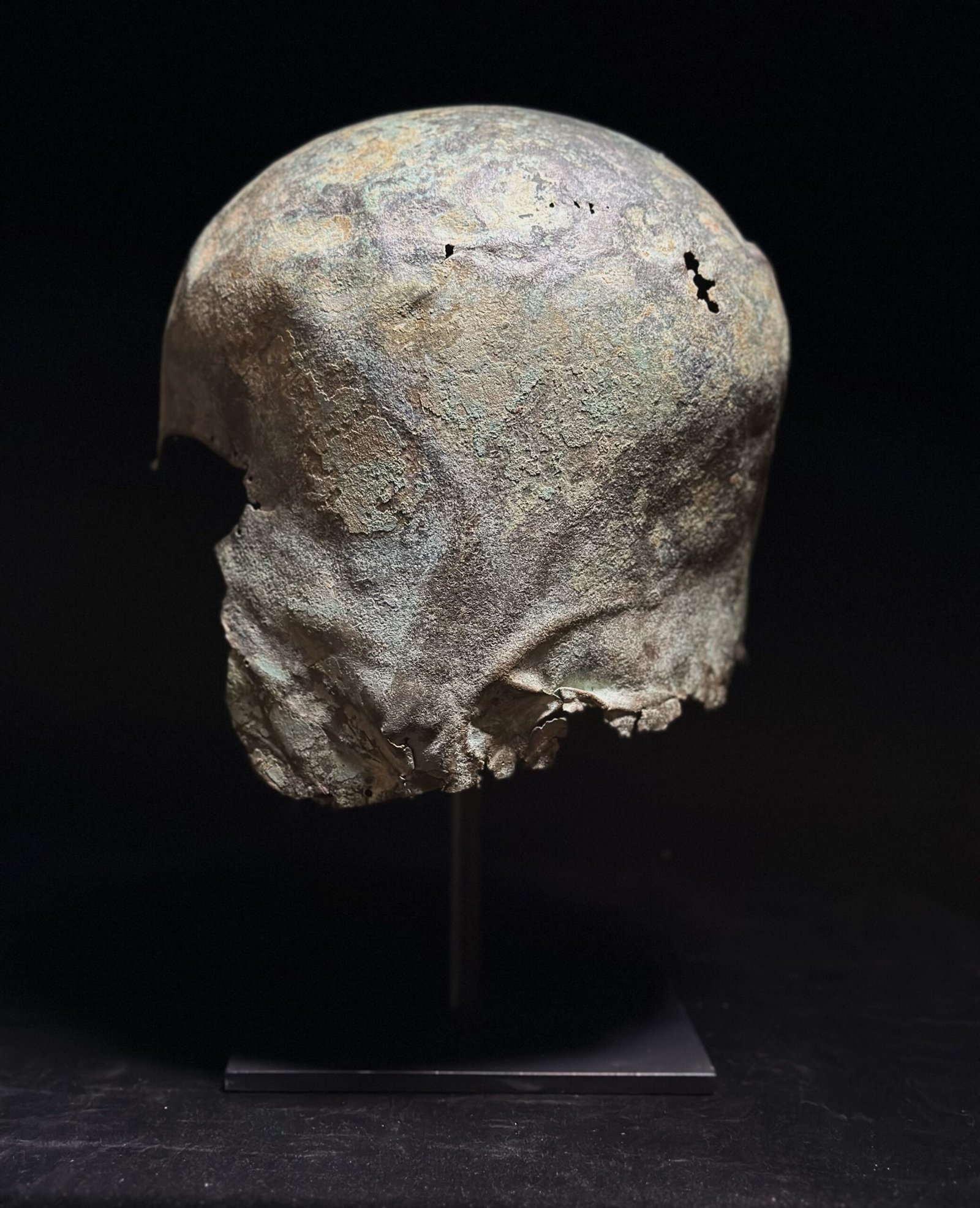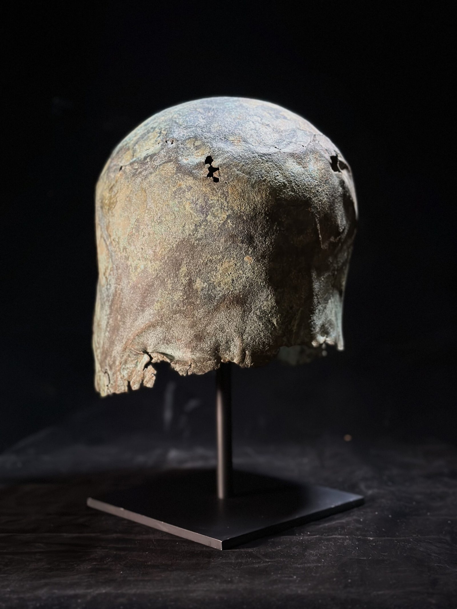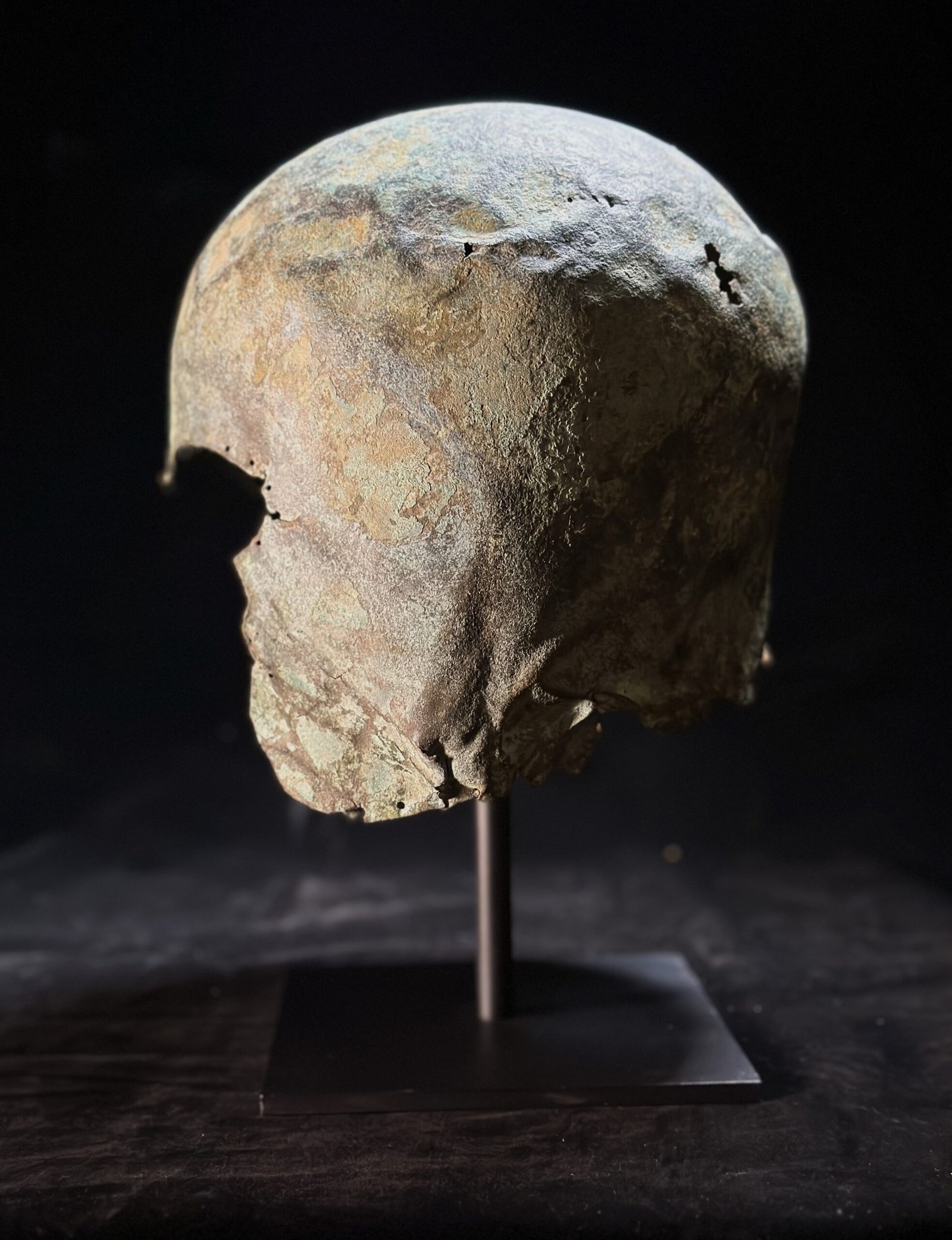 The Corinthian helmet was first developed in the Peloponnese in the early 7th century BC. Its closed form, shielding the face of the soldier, was preferred by generations of hoplites in their distinctive phalanx combat. The early examples are austere and upright. Later examples have extended cheek pieces, carinated upper sections, and finely worked borders. The Corinthian helmet fell out of use in the later 5th century BC.