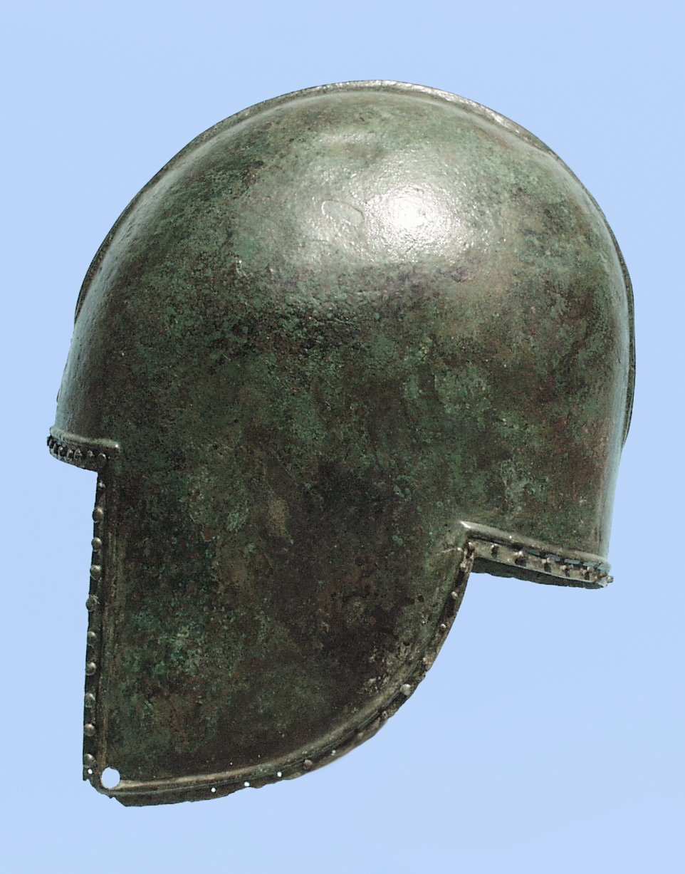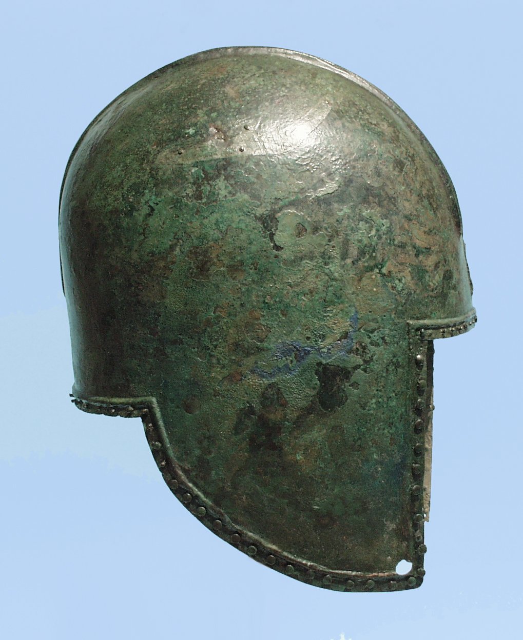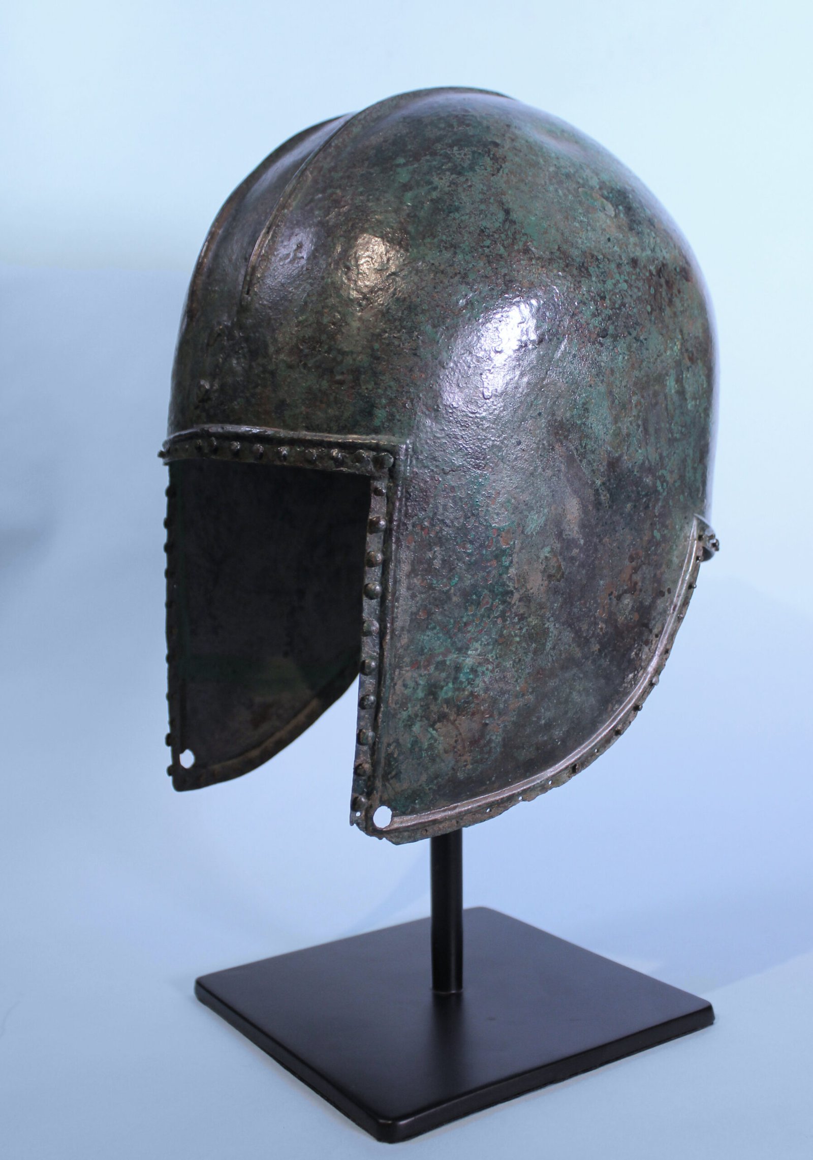 The Illyrian helmet was first developed in the Peloponnese in the mid-7th century BC and continued to be produced into the mid-5th century BC. The main design feature was the large quadrangular opening for the face and integral channel over the top to accommodate the horse hair crest. Earlier examples have borders of large rivets, later ones have plain, incised or punched borders.