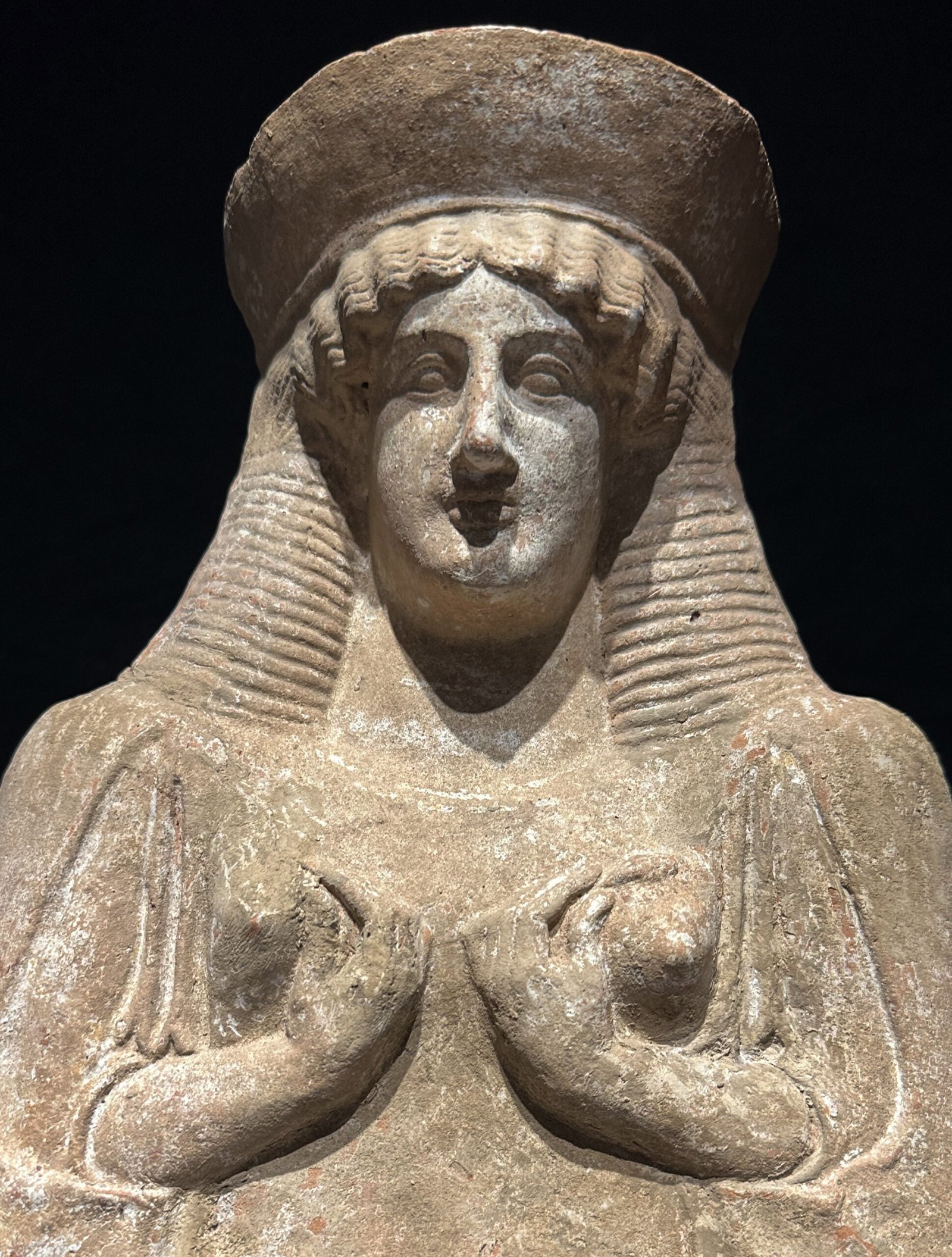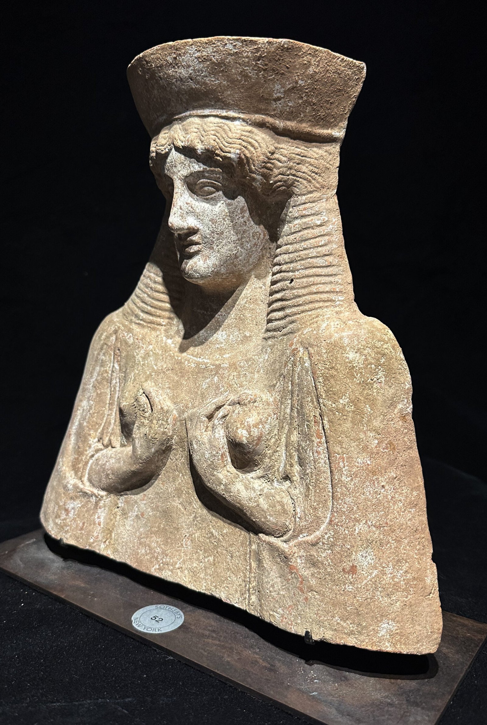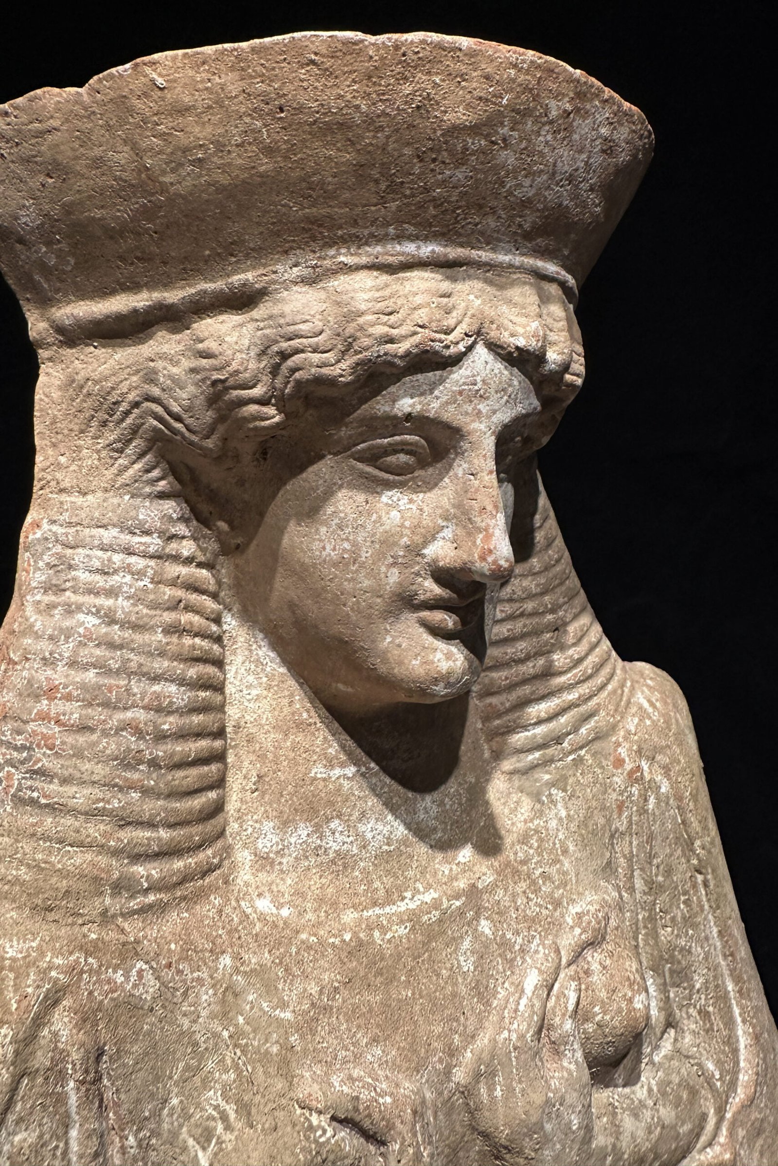 An ancient Boeotian Greek large terracotta protome of the goddess Demeter, her hands cupping her breasts, wearing a peplos over a chiton with pleated sleeves, with serene expression and melon coiffure with spiraled locks at the sides.