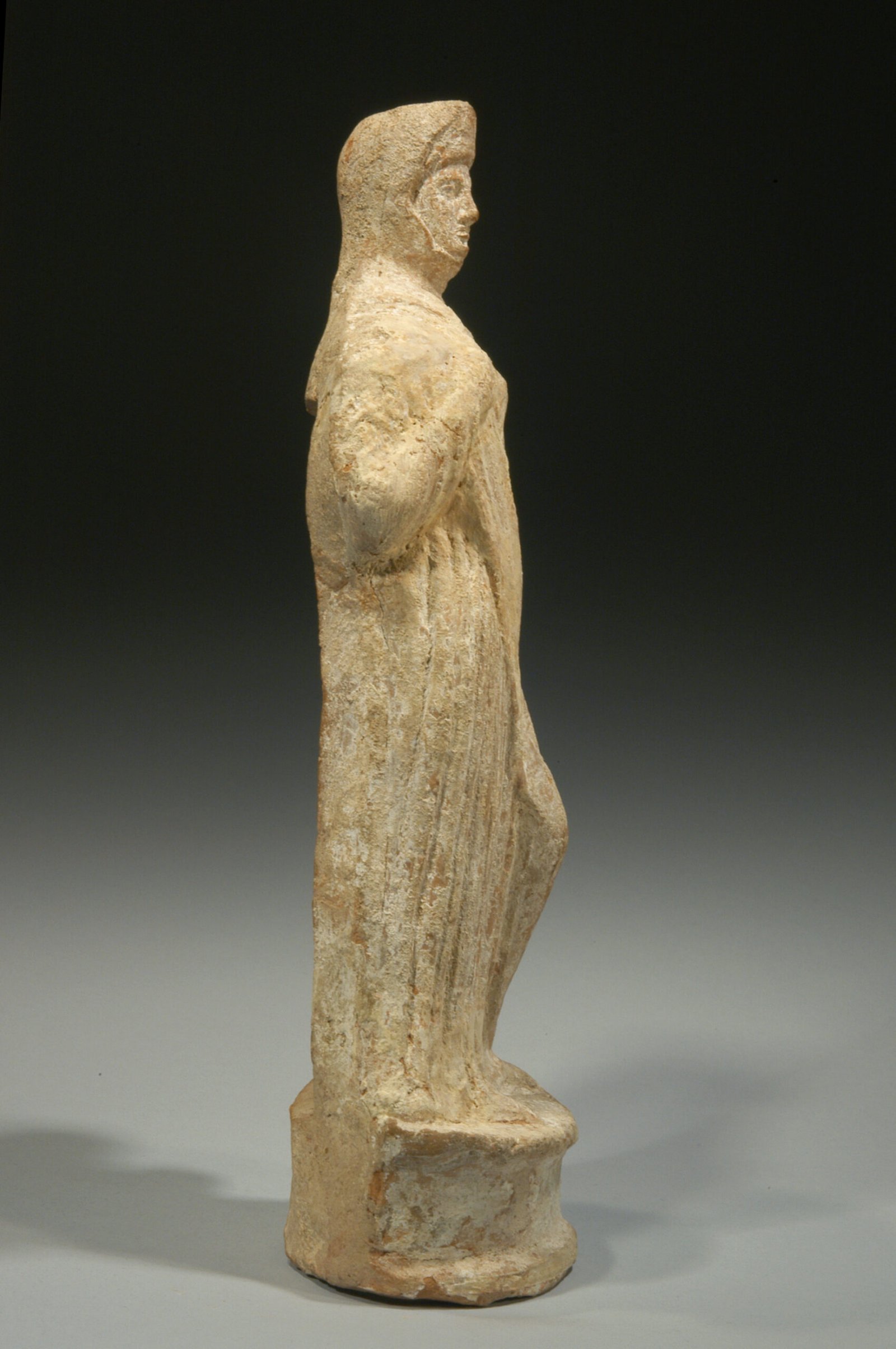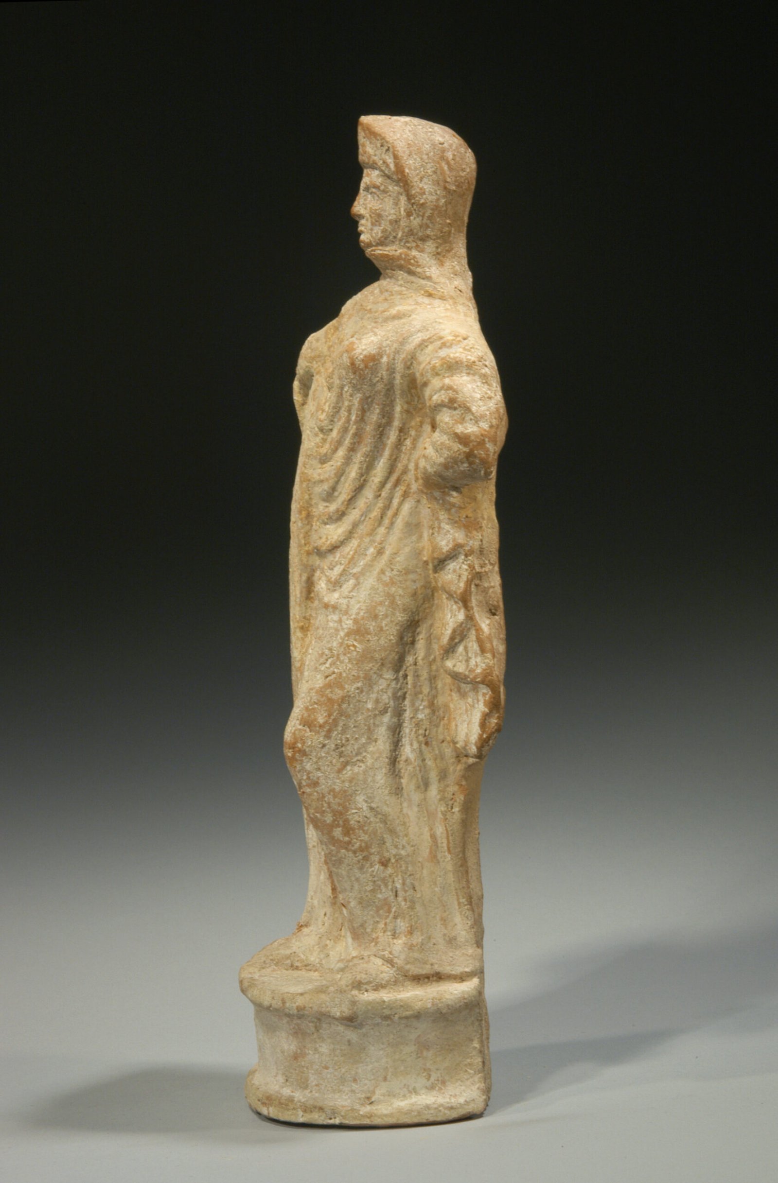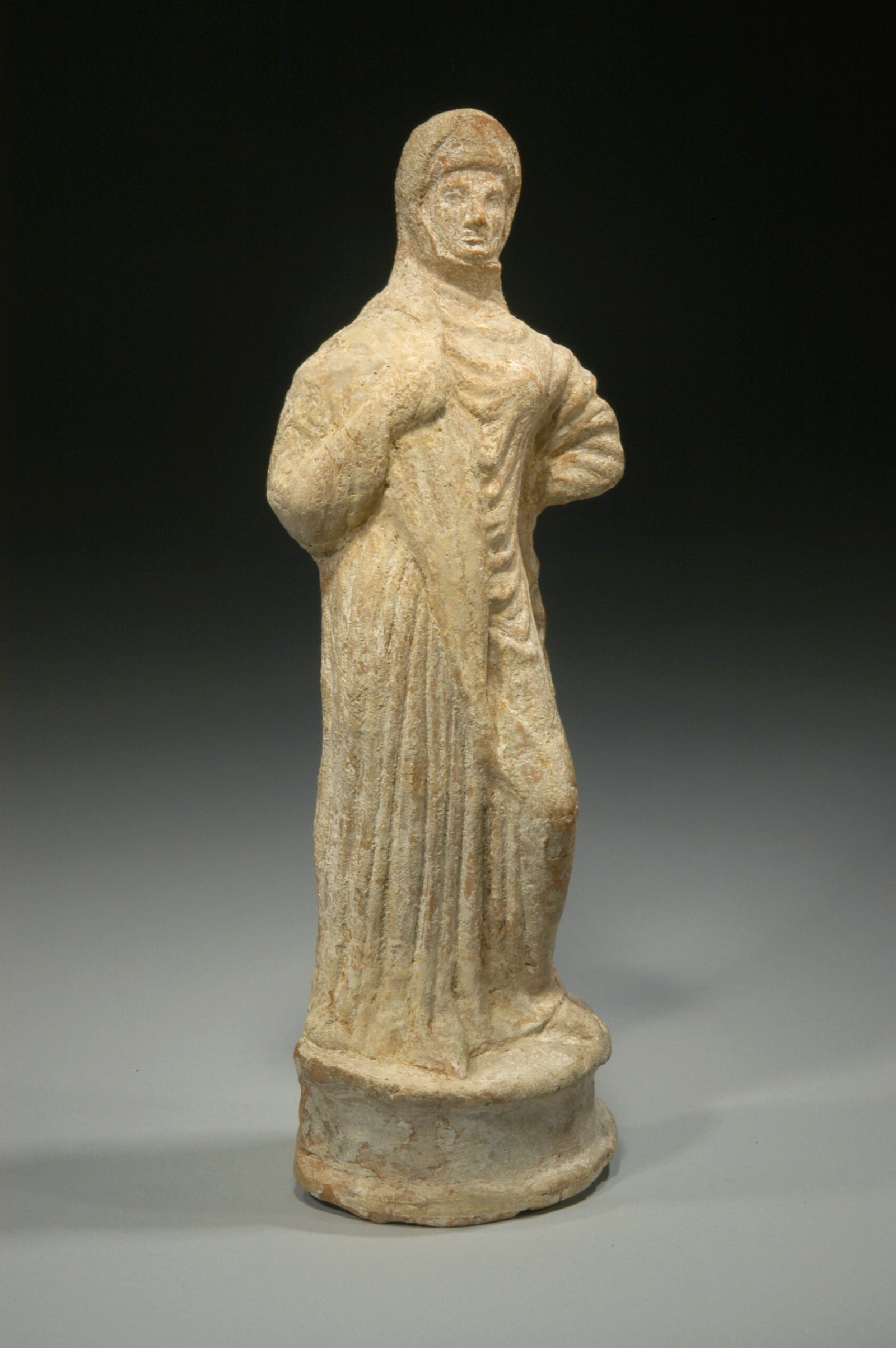 An ancient Hellenistic Greek terracotta figure of a standing young woman dressed in a voluminous himation wrapped around her body and pulled up over her head, on an integral round plinth.