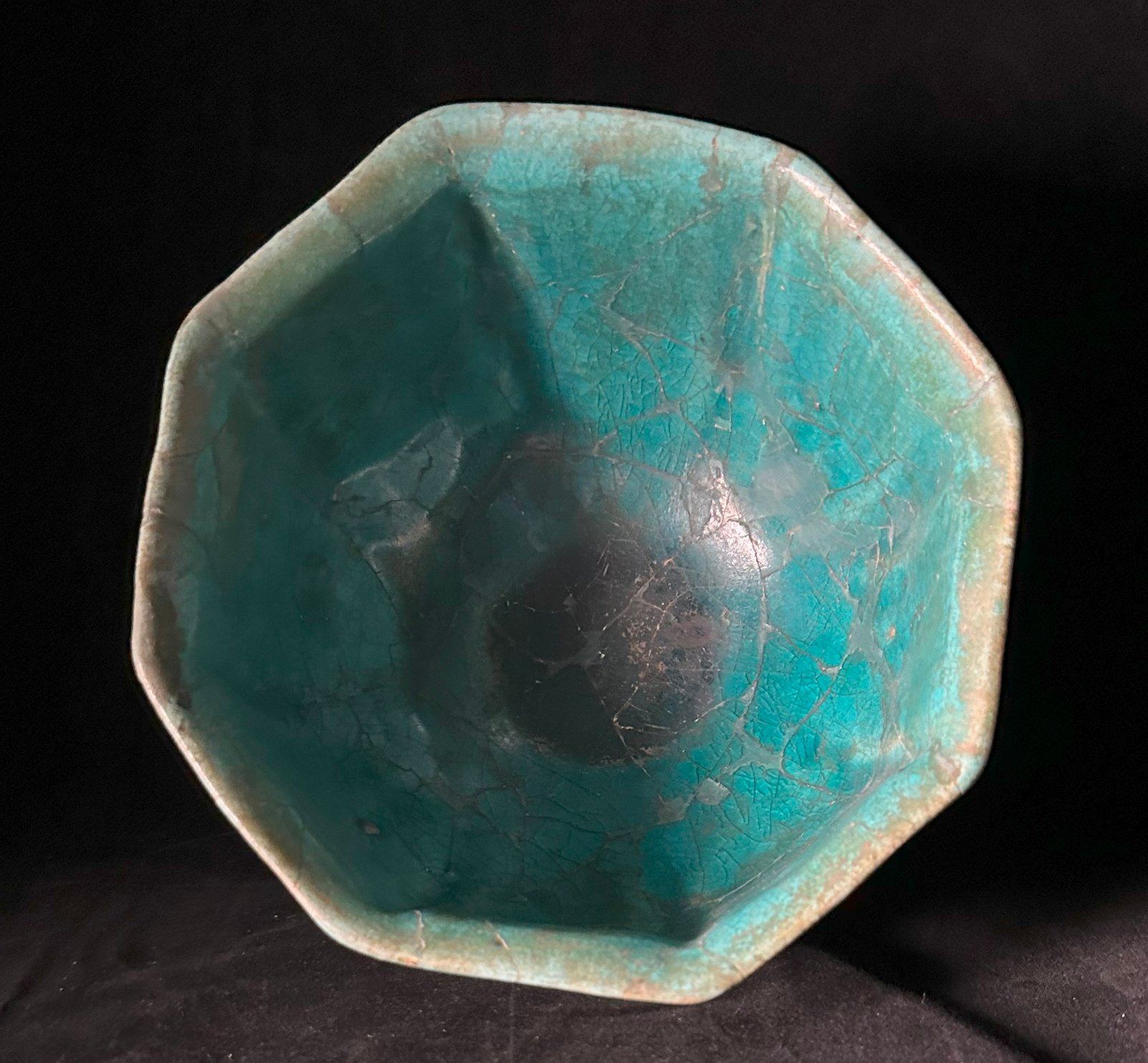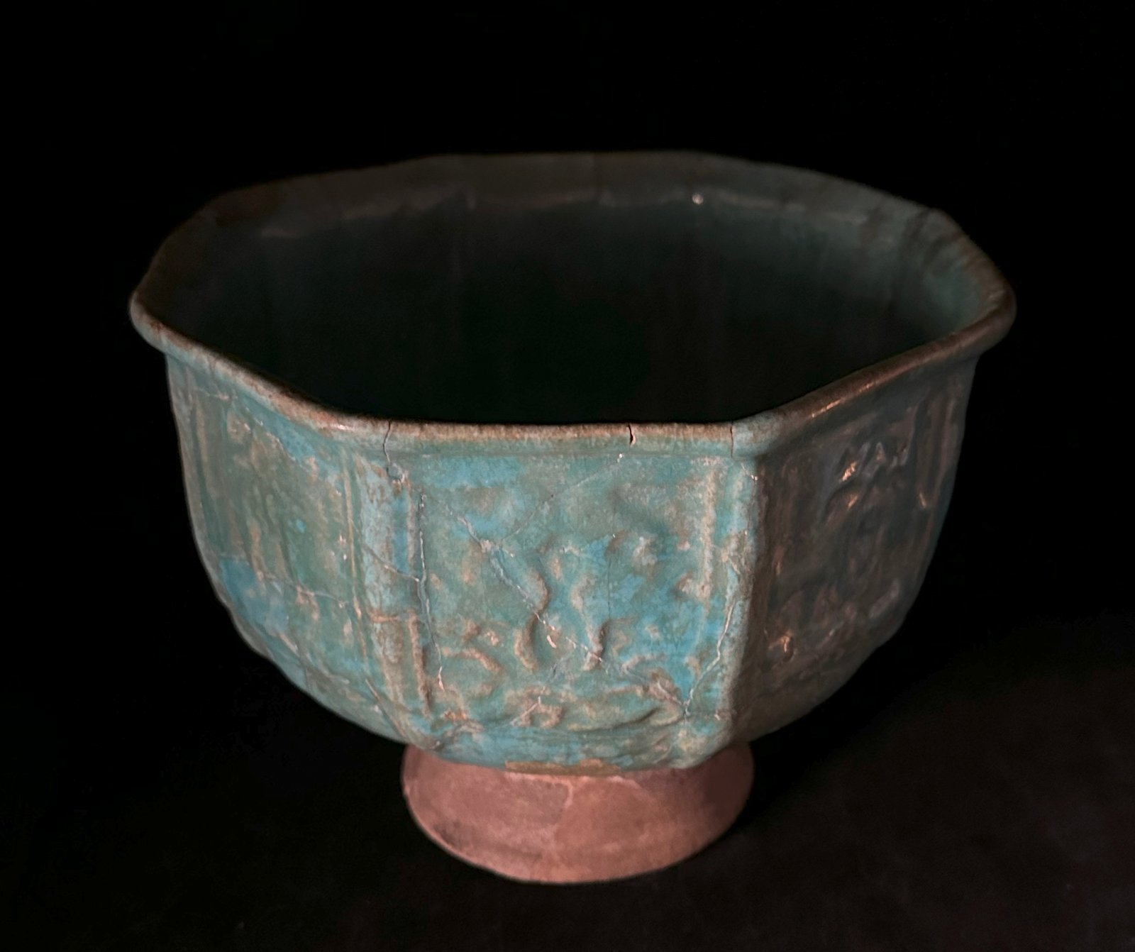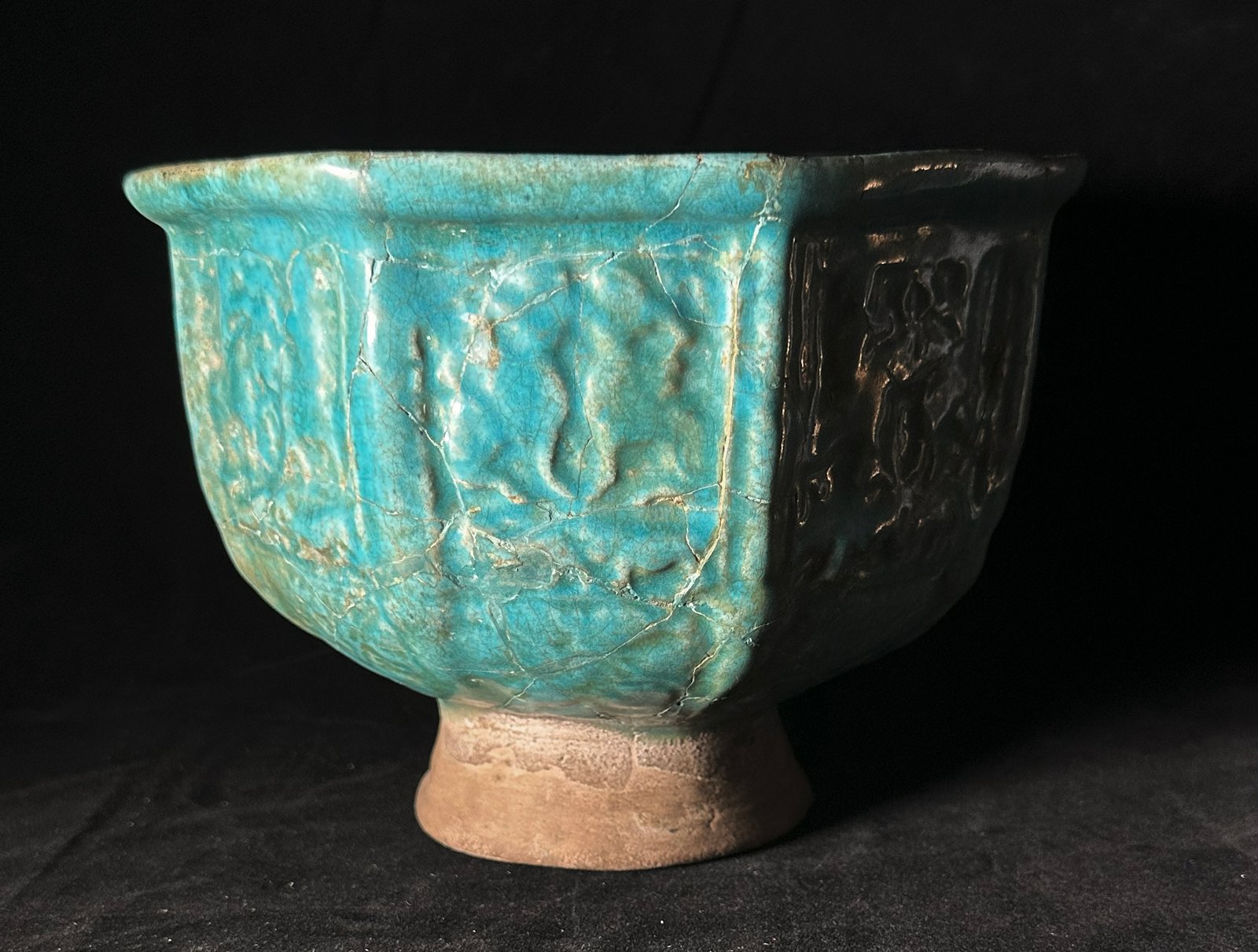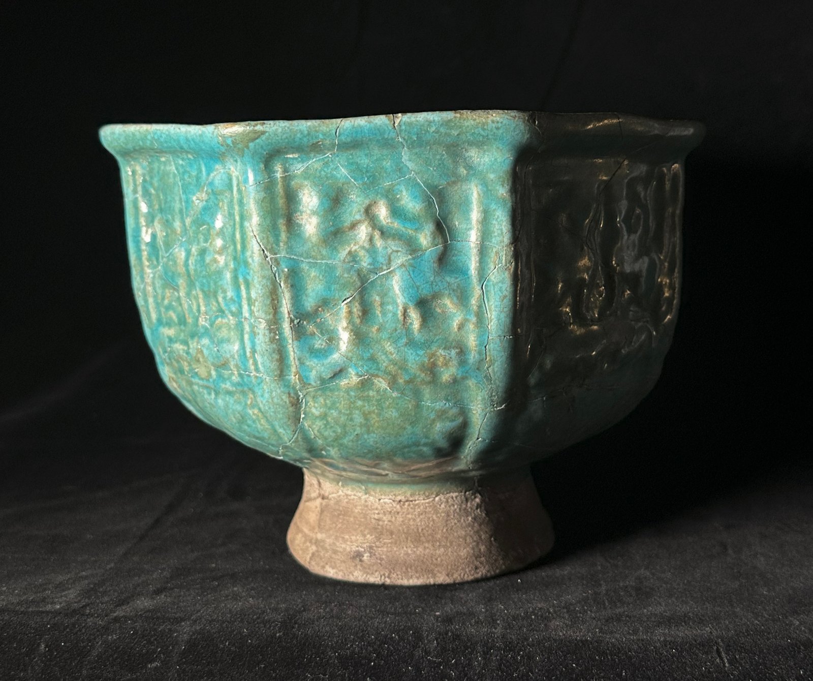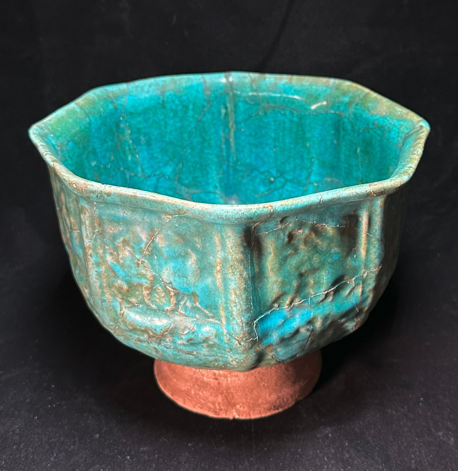 An Islamic Seljuk octagonal turquoise glazed bowl with reliefs of pairs of animals.