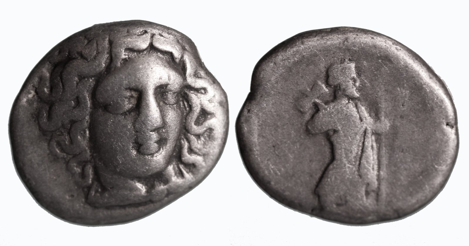 Silver drachm, 12 mm, 3.52 gm. Obverse: Head of Apollo facing slightly right, wearing laurel wreath, drapery around neck Reverse: Zeus Labraundos standing right with ax