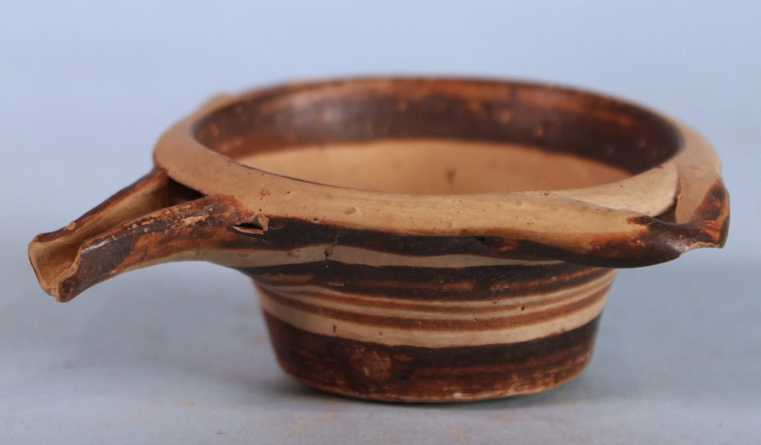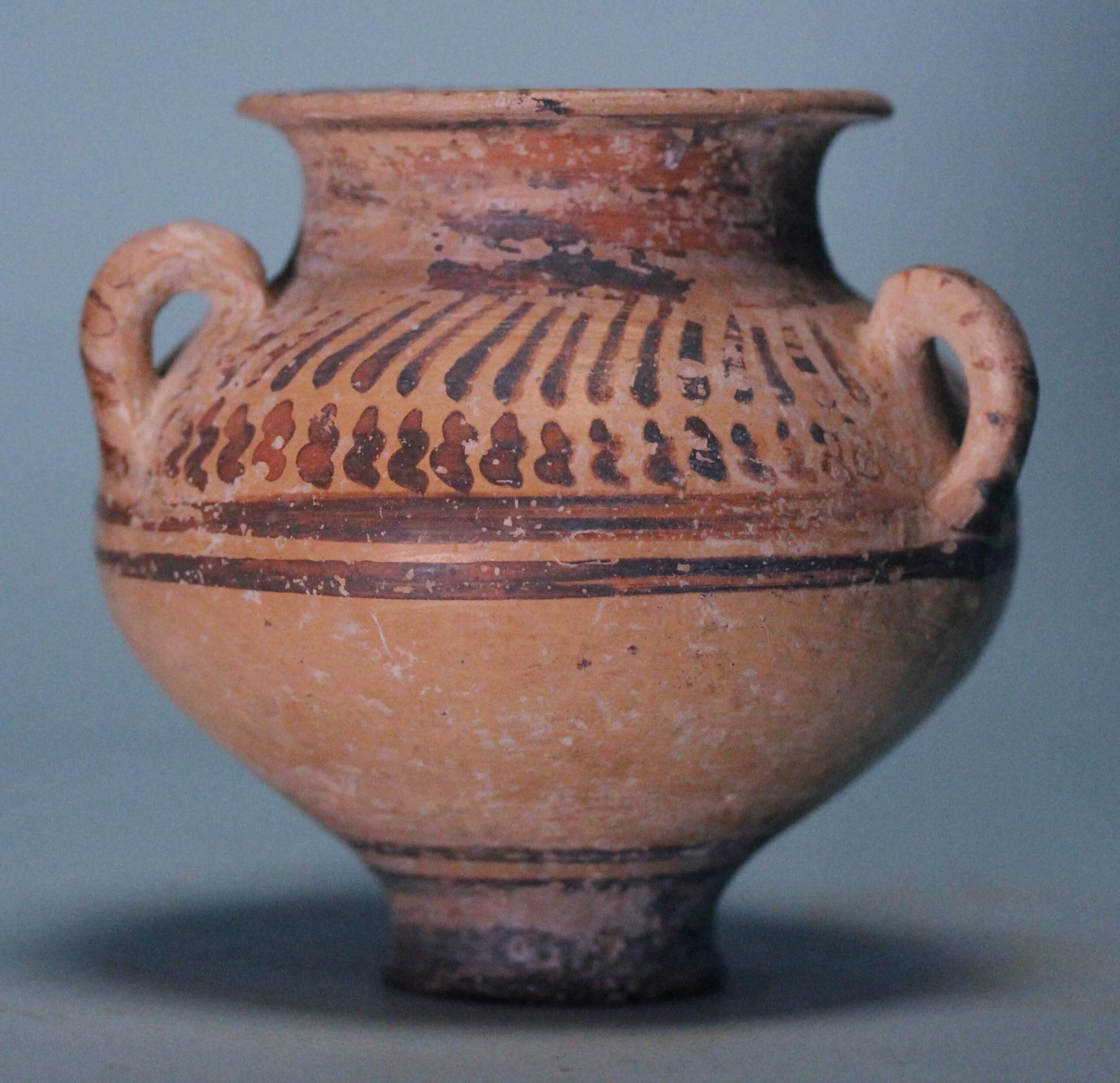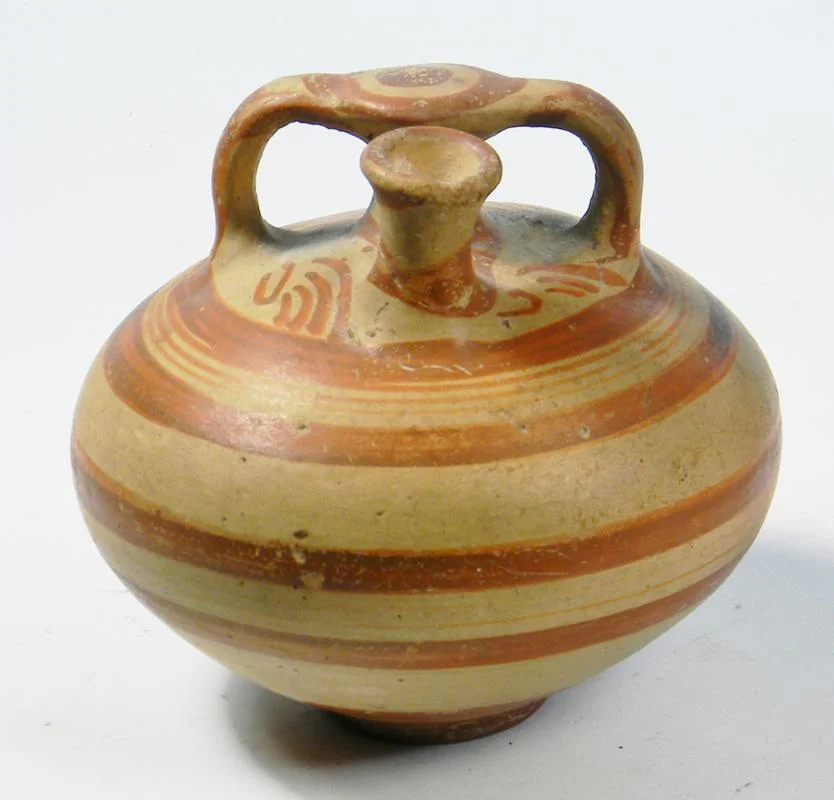 An ancient Mycenaean pottery amphora-form flask with a round body painted with concentric circles on both sides, cylindrical neck with arching handles, and chevrons on the sides.