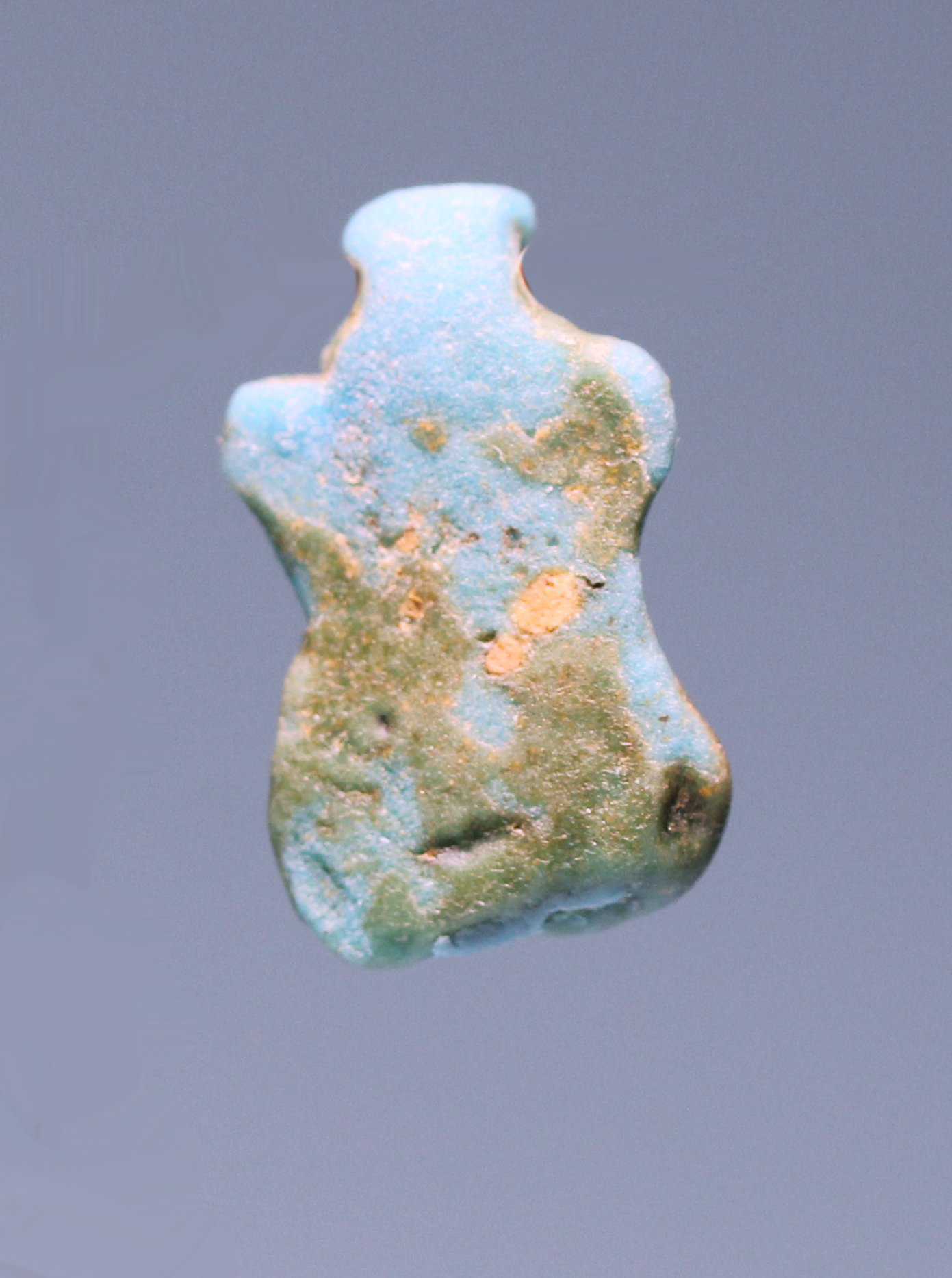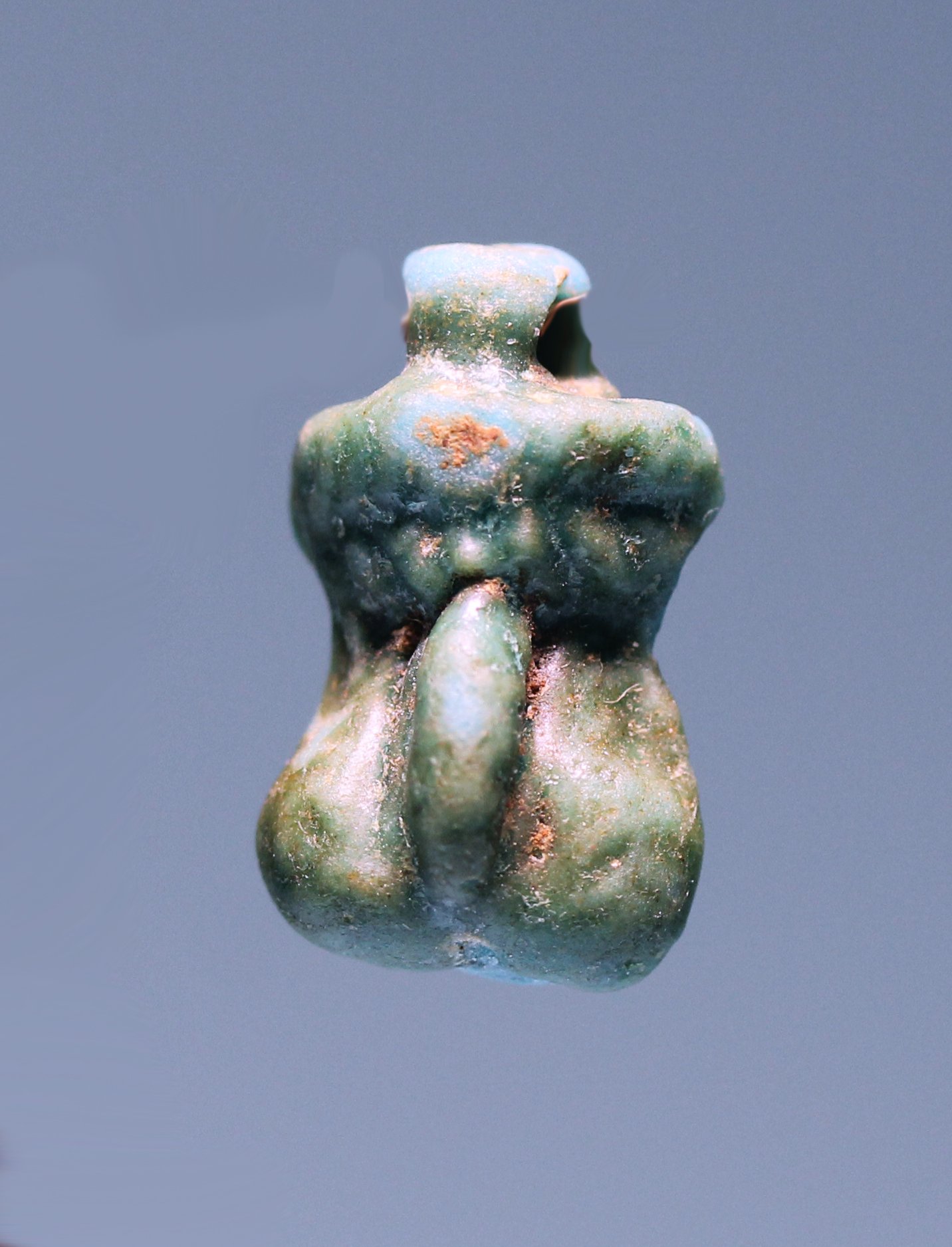 An ancient Roman Egyptian faience phallic amulet; looped for suspension.
