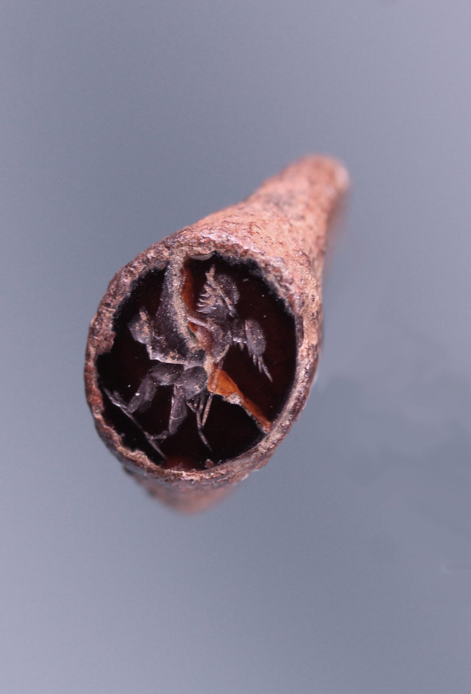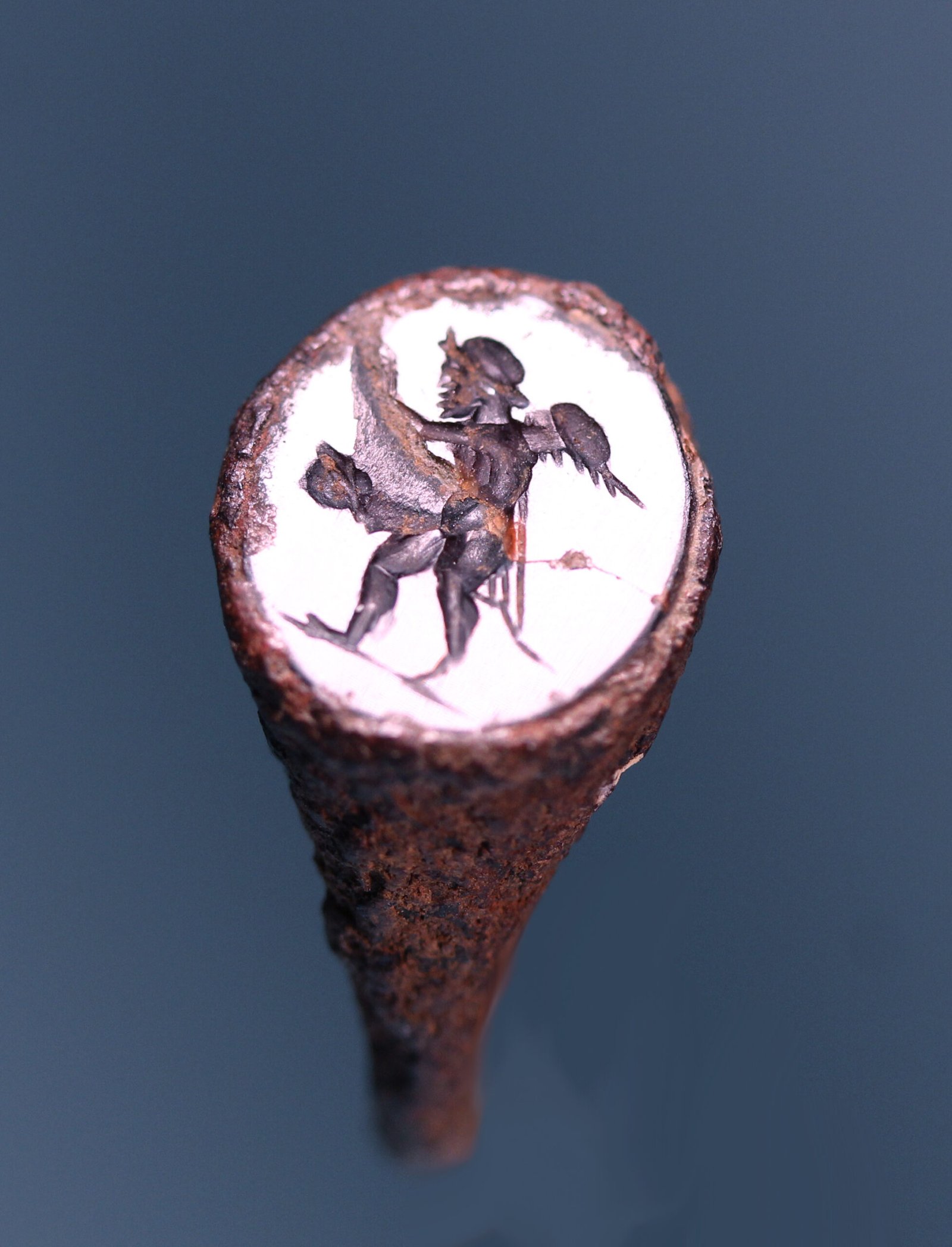 An ancient Roman iron finger ring set with an agate intaglio of striding winged Eros (Cupid).