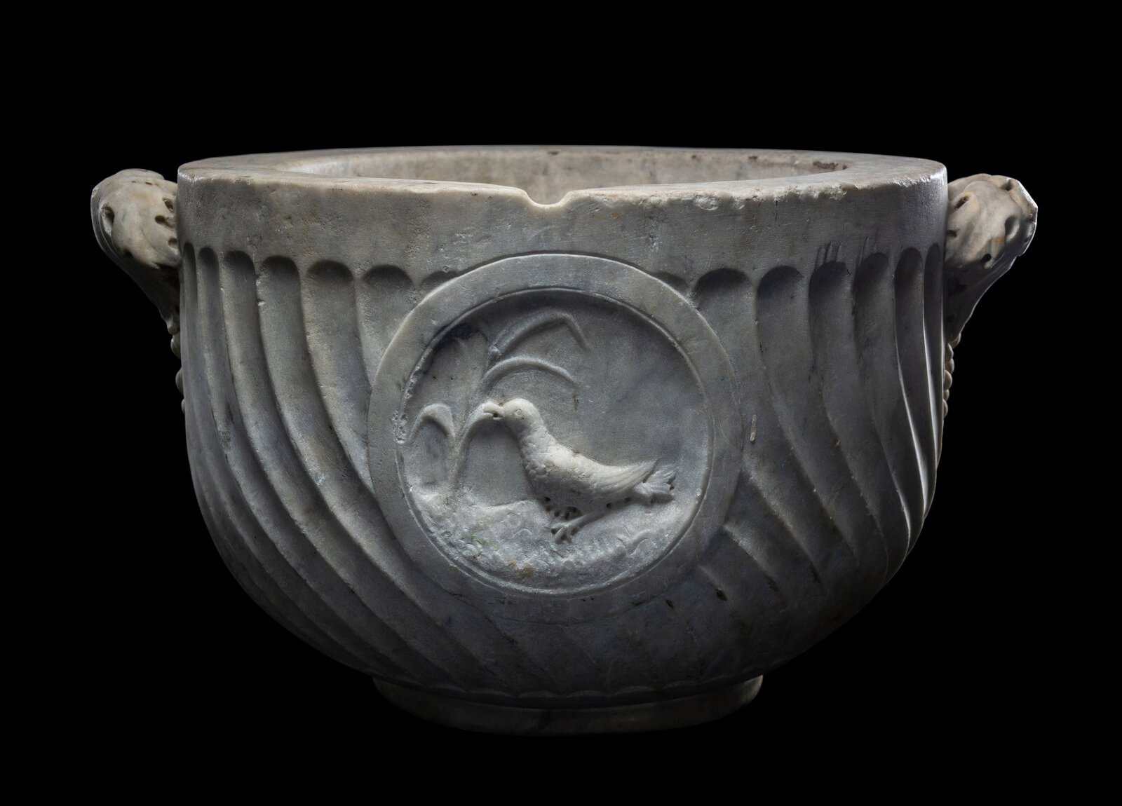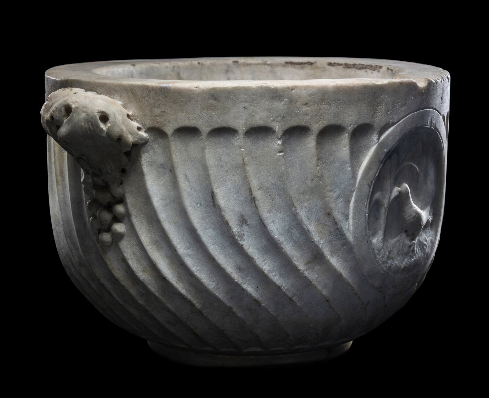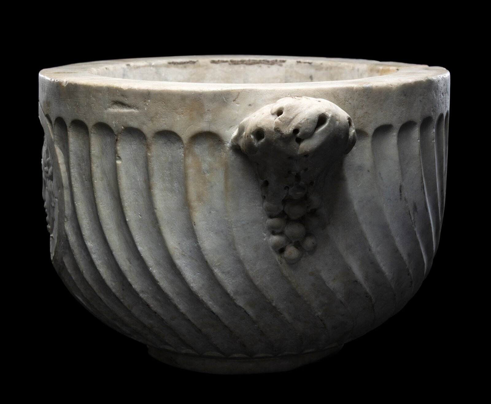 An ancient Roman large marble strigillated basin, with roundels in low relief on each side, one with a partridge feeding on berries, the other with a head of Eros with leaves and berries in his hair surrounded with a twelve petal flower; with a spout on the broad rim and ivy leaf handles at each side.