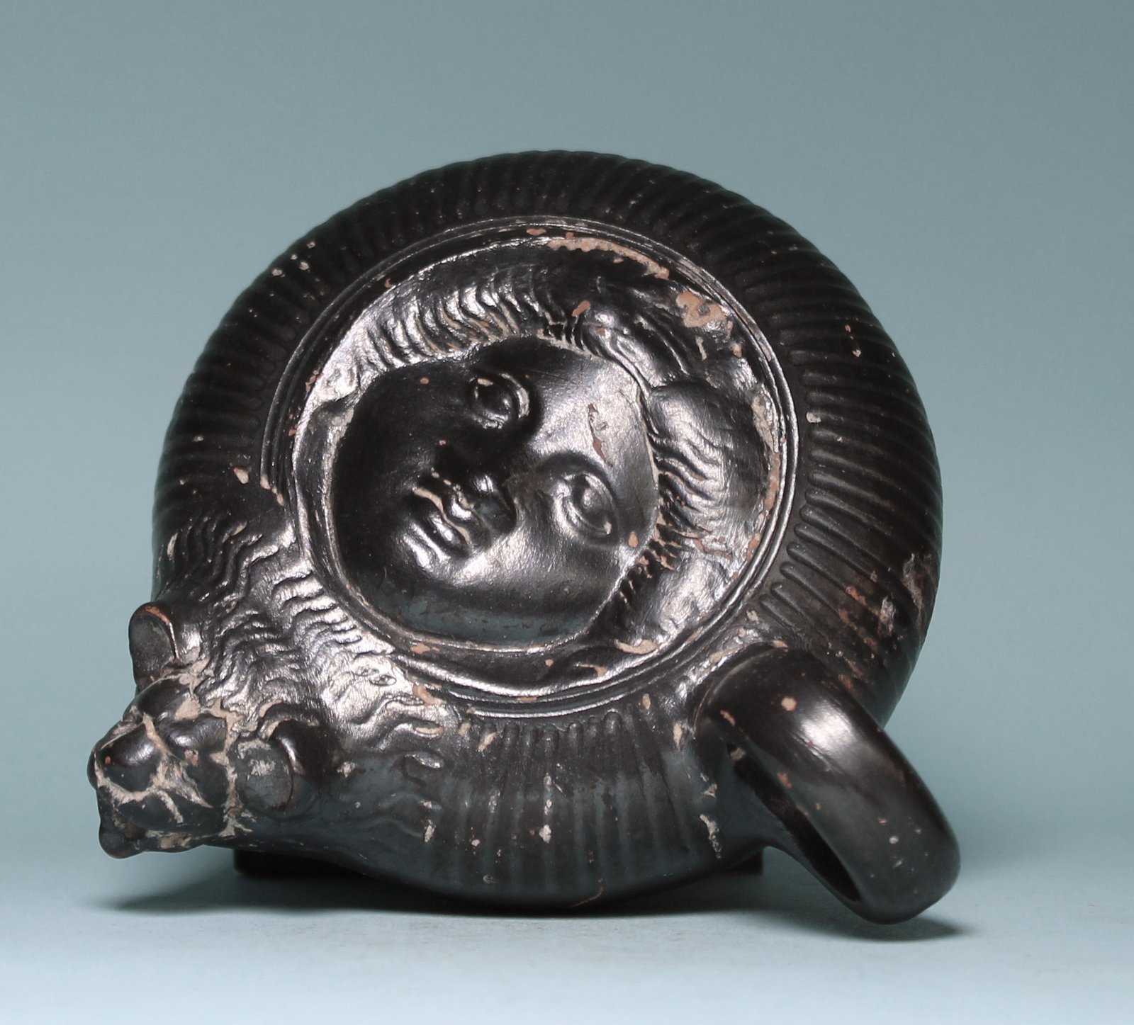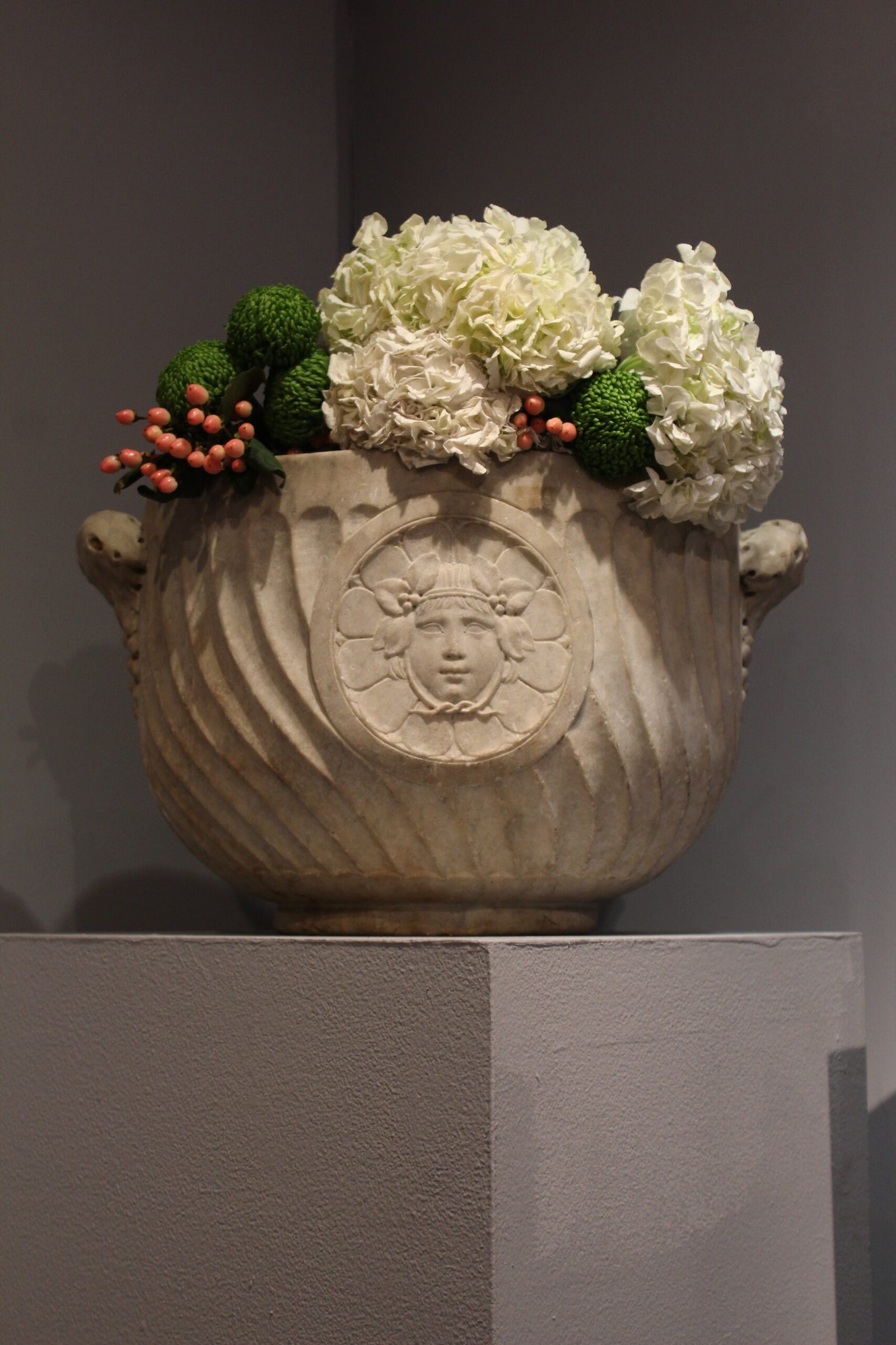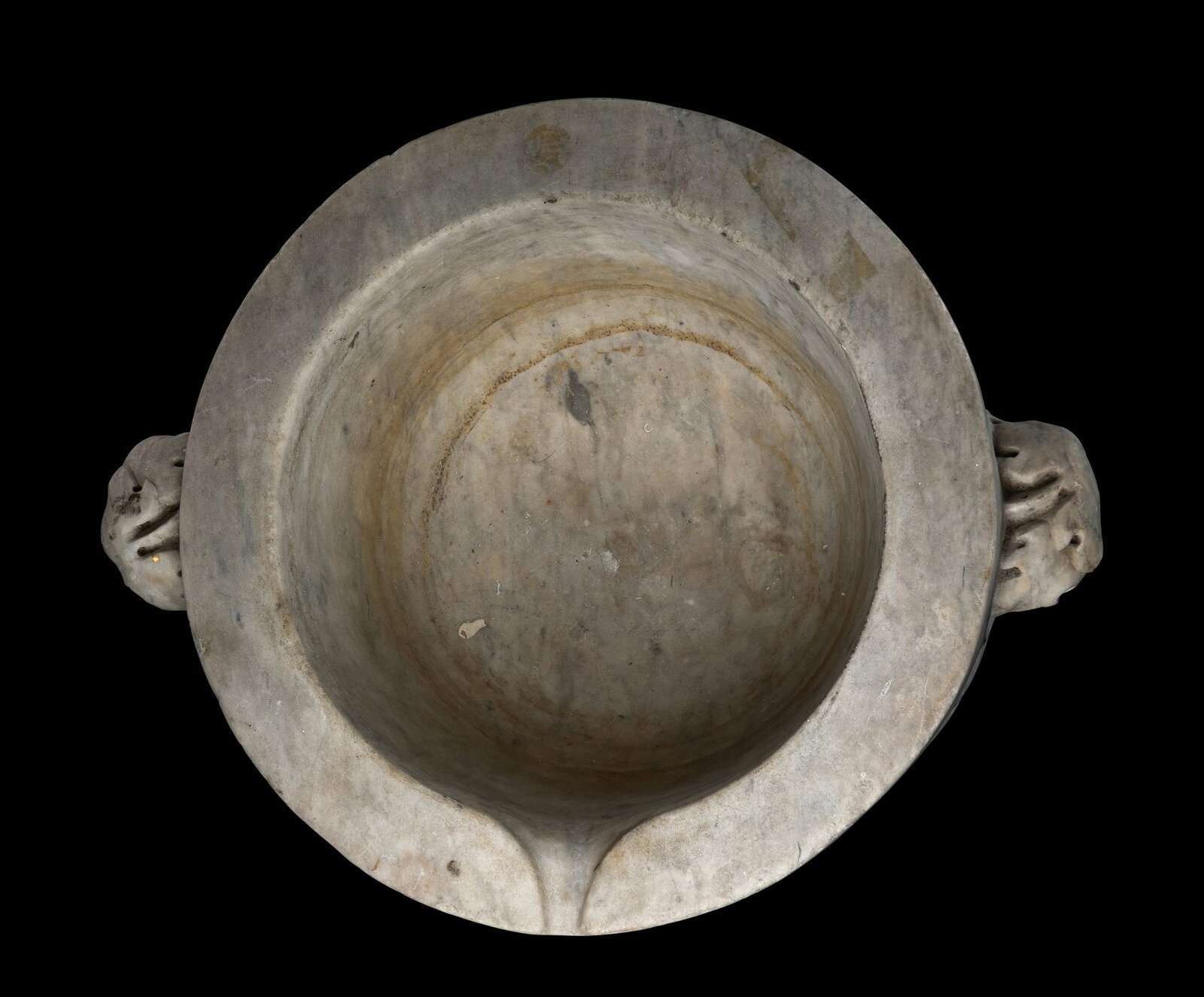 An ancient Roman large marble strigillated basin, with roundels in low relief on each side, one with a partridge feeding on berries, the other with a head of Eros with leaves and berries in his hair surrounded with a twelve petal flower; with a spout on the broad rim and ivy leaf handles at each side.