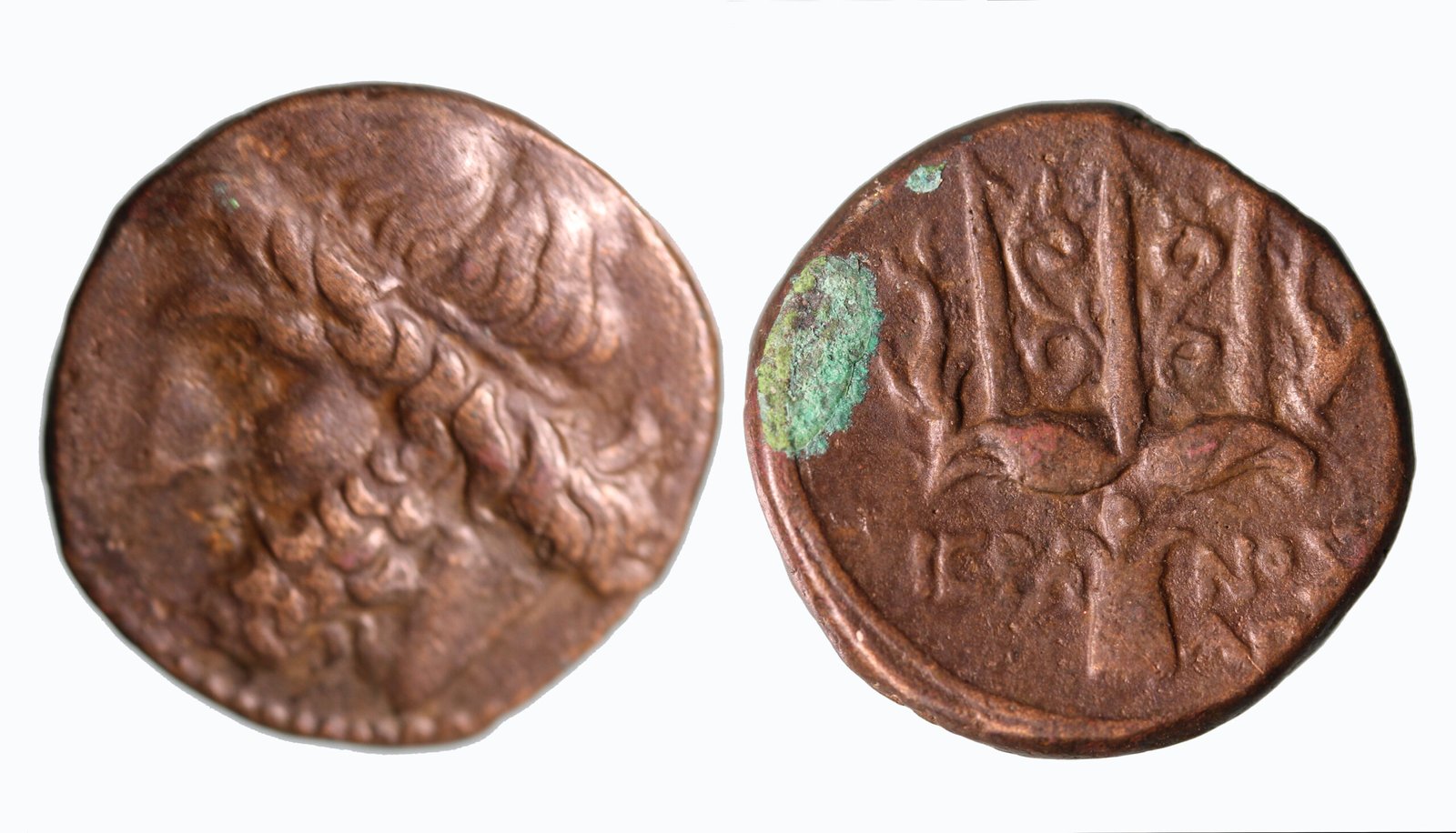 Bronze litra, 18 mm, 5.80 gm. Obv.: Head of Poseidon left, wearing taenia. Rev.: ΙΕΡ-ΩΝΟΣ Trident; dolphin swimming downward on either side.